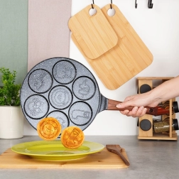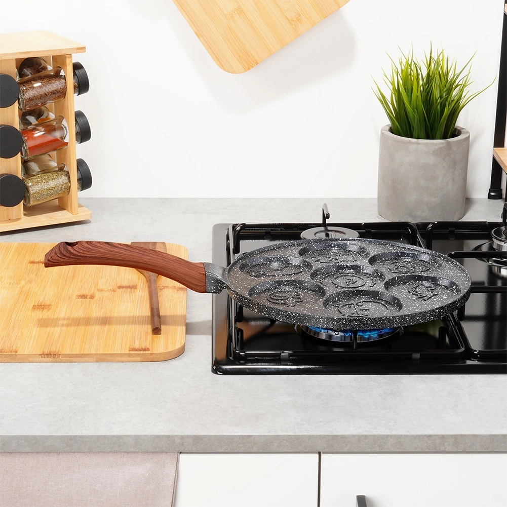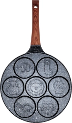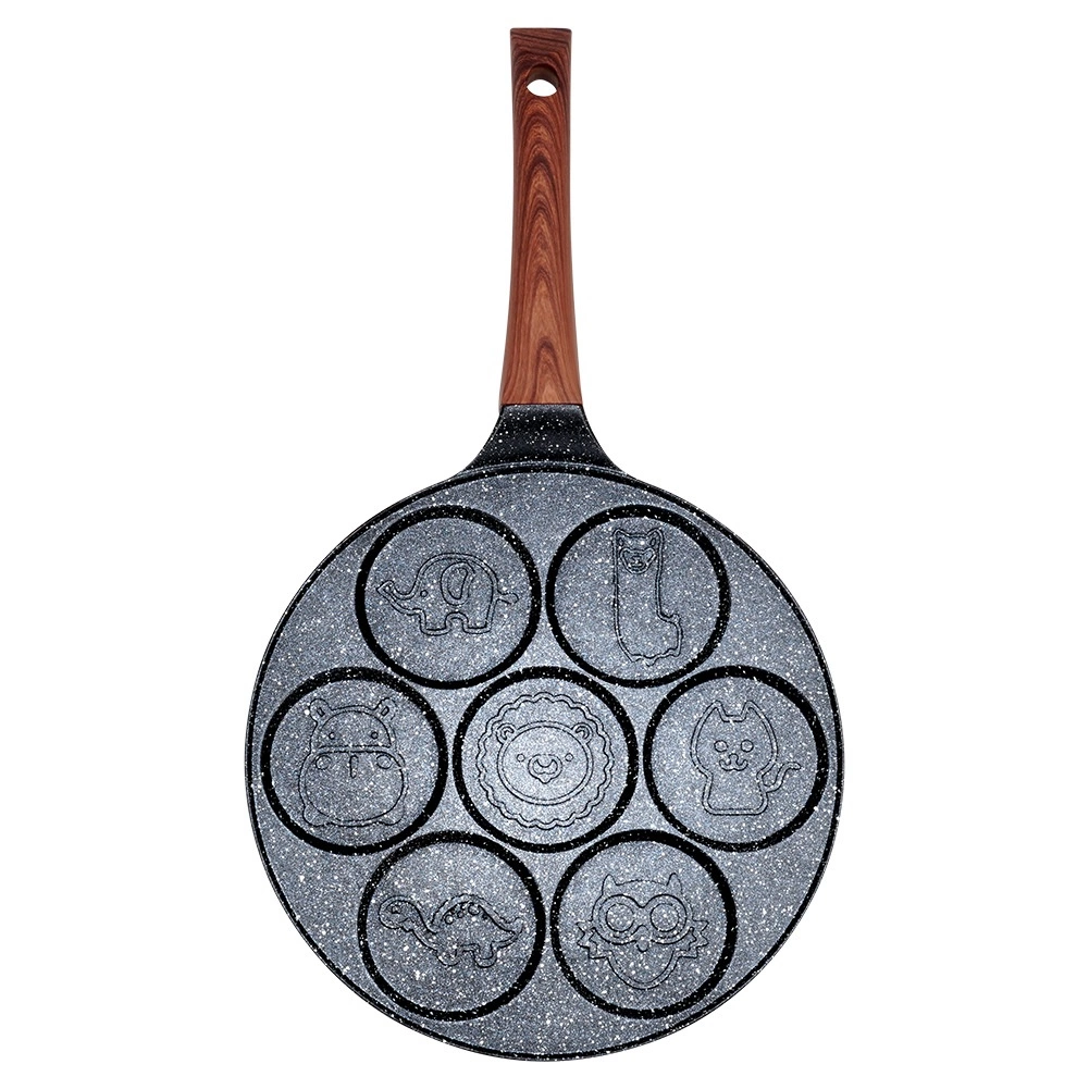 Esta estilosa sartén de la línea BLACK & WOOD es ideal para huevos, tortitas y mini crepes. Siete cavidades redondas con divertidos relieves de animalitos crean formas bonitas y uniformes y aportan alegría a cada desayuno. La resistente construcción de aluminio con acabado granítico asegura un calentamiento rápido y una larga vida útil.