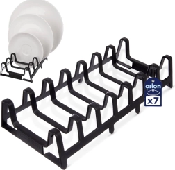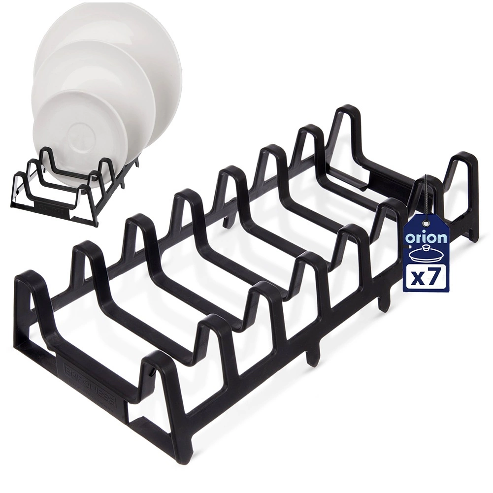 El soporte admite hasta 7 piezas: ideal para tapas, platos llanos y tablas de cortar. La estructura abierta permite una colocación sencilla y acceso rápido, mientras que los separadores firmes mantienen todo estable. El plástico de calidad es ligero, fácil de limpiar y, con el uso adecuado, durará años.