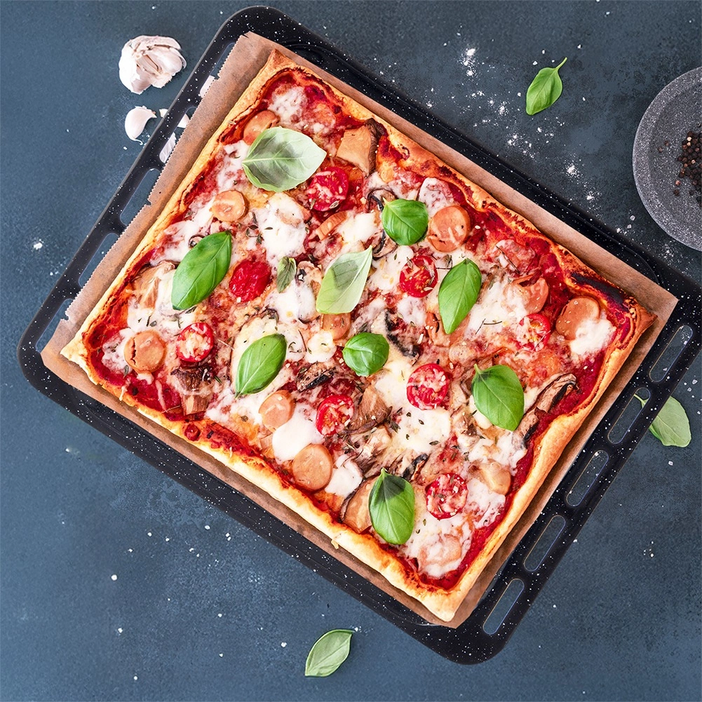 Sus amplias dimensiones con bordes elevados aportan estabilidad a los alimentos, un horneado homogéneo y menos suciedad en el horno.