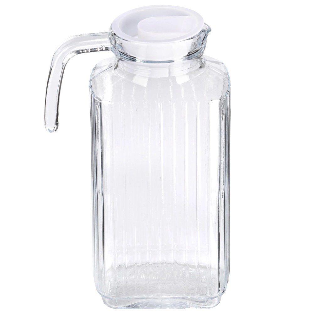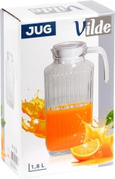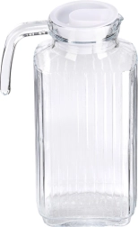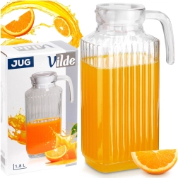 Jarra práctica y estilosa de vidrio transparente de alta calidad y grosor, con textura estriada que luce genial en la mesa y ofrece un agarre seguro. Gracias a su forma rectangular estrecha, cabe cómodamente en la puerta del frigorífico y mantiene tus bebidas siempre frescas y a mano.