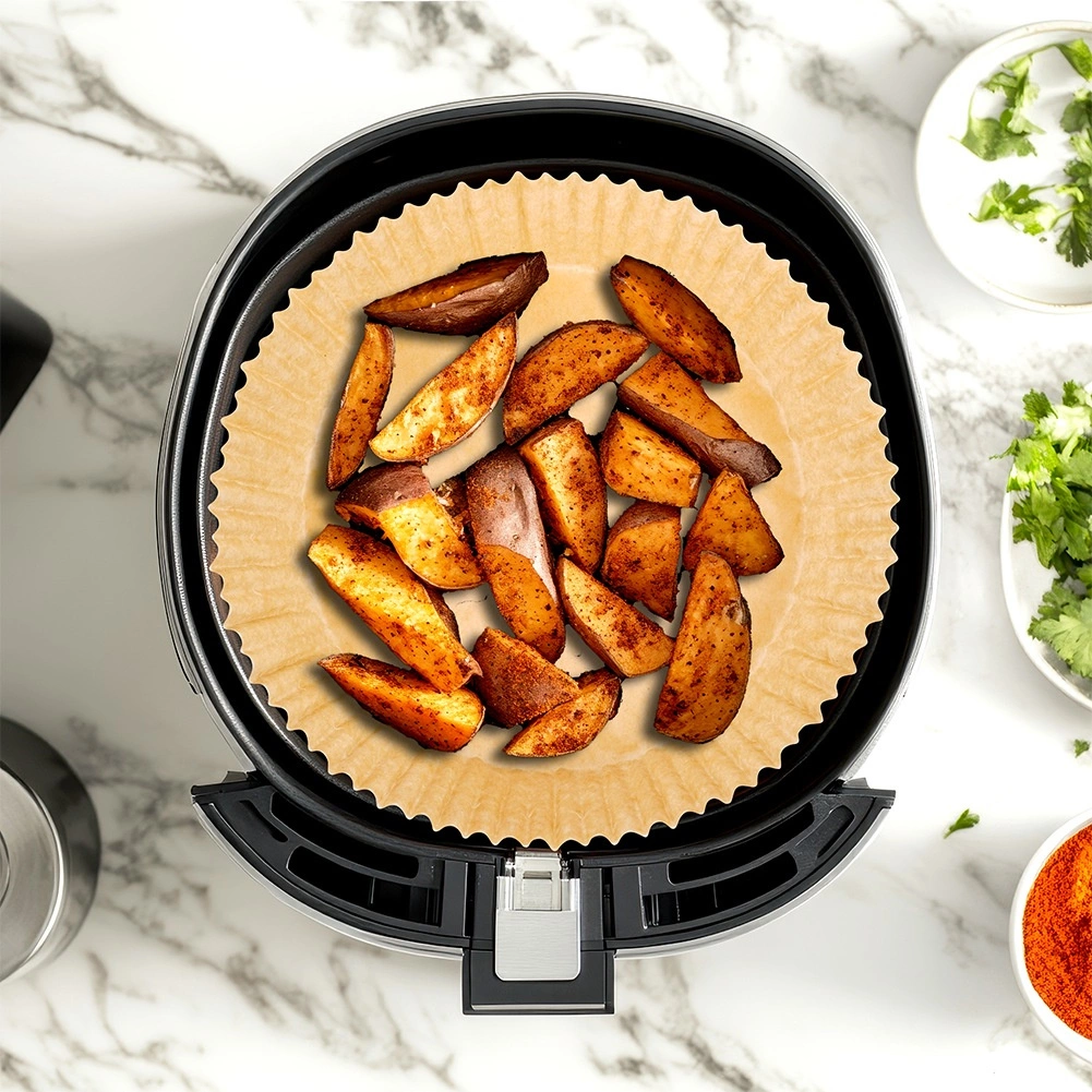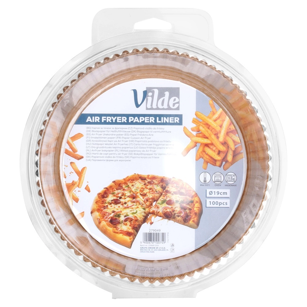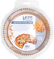 Las prácticas inserciones de papel para freidora de aire (VILDE) ahorran tiempo en la limpieza y protegen la cesta de la suciedad. La forma redonda con bordes altos y plisados evita que se derrame la grasa y las migas, y facilita el emplatado. El material es seguro para el contacto con alimentos y no altera el sabor de los platos.