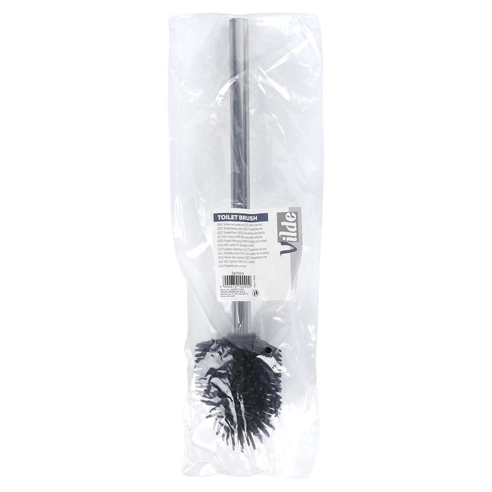 El mango ergonómico de acero inoxidable en color plateado garantiza un agarre firme y un manejo cómodo bajo el borde de la taza. Gracias a su tamaño universal, es compatible con la mayoría de recipientes/soportes comunes para cepillos de WC y combina con baños de diferentes estilos.