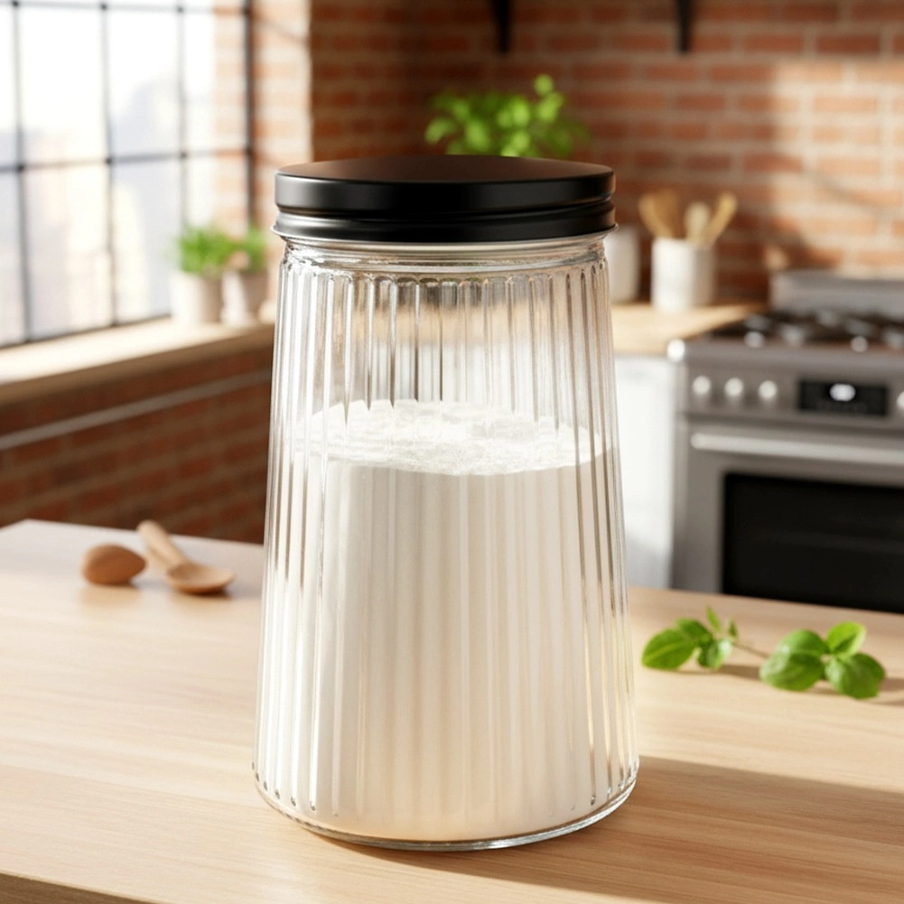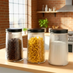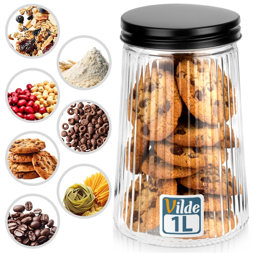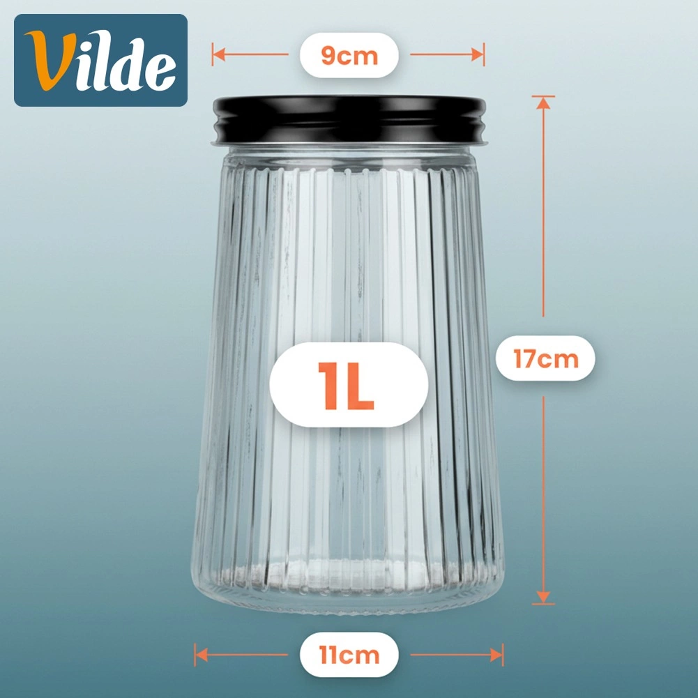 Práctico tarro de vidrio con capacidad de 1 litro y tapa metálica de rosca que mantiene tus alimentos más frescos y ordenados por más tiempo. Fabricado en vidrio de borosilicato resistente con un elegante diseño estriado, permite controlar fácilmente el contenido y la cantidad. Ideal para café, pasta, azúcar, frutos secos y otros ingredientes a granel.