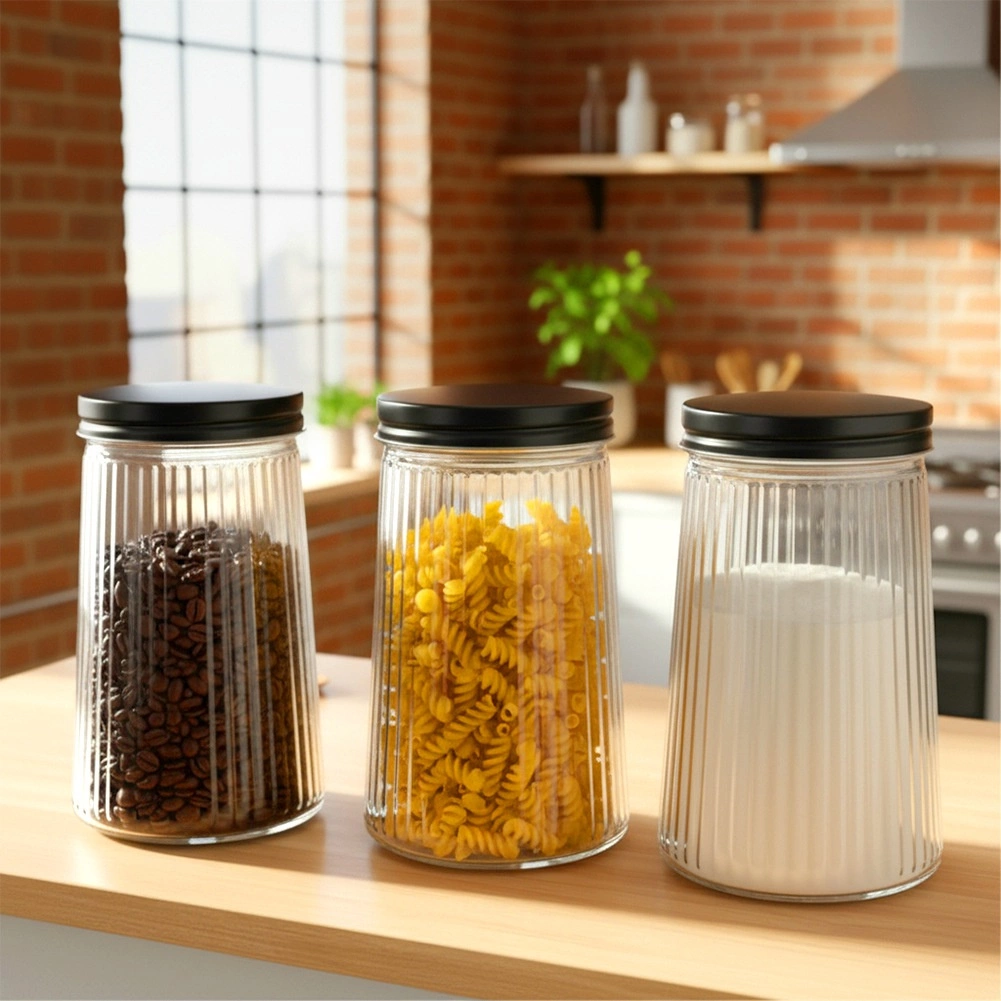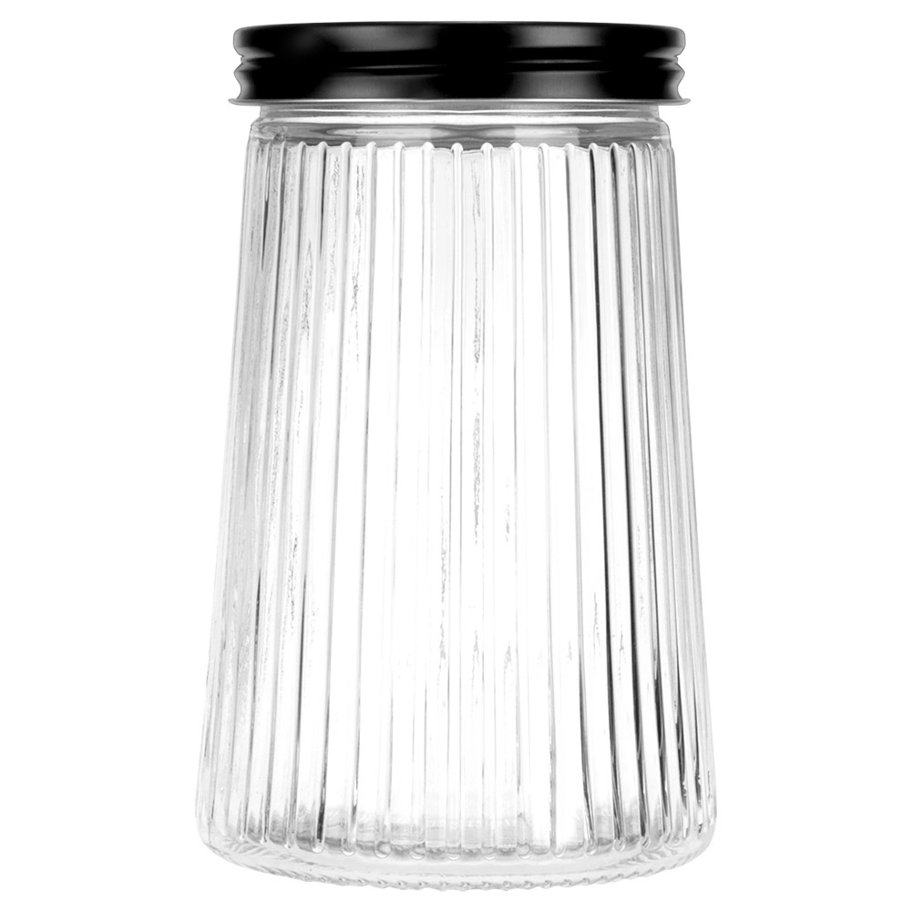 El vidrio transparente acanalado combina estilo y funcionalidad: ves el contenido de un vistazo y el tarro se sujeta cómodamente.