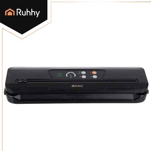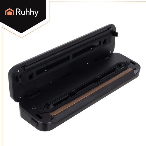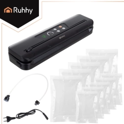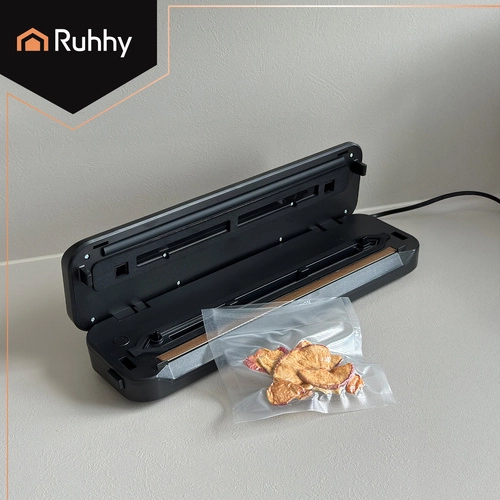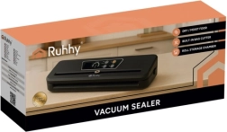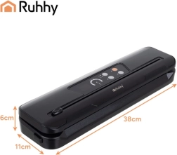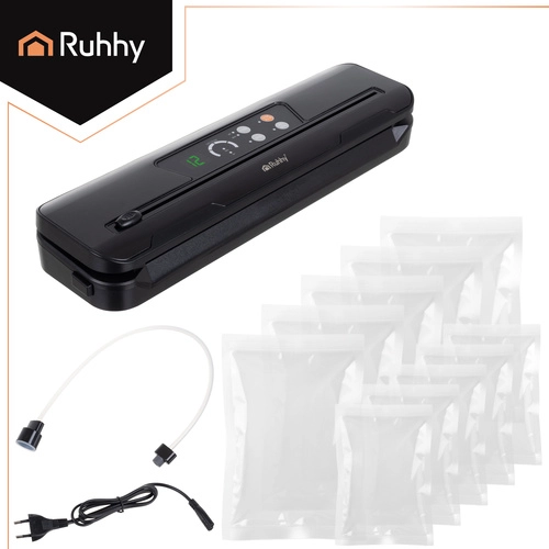 La selladora al vacío RUHHY facilita el envasado doméstico, reduce el desperdicio y prolonga la frescura de carnes, quesos, verduras y platos marinados. Su potente bomba de 80 kPa con 110 W y caudal de 9 l/min crea sellados profesionales y herméticos en cuestión de segundos. Los indicadores LED claros y el manejo sencillo garantizan un resultado fiable siempre.