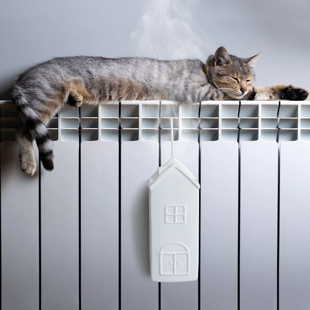 Práctico y estiloso humidificador de aire para radiador en forma de casita, ideal para los periodos de aire seco durante la calefacción. Basta con llenarlo de agua y colgarlo del radiador: el agua evaporada aumenta de forma natural la humedad en la habitación, contribuyendo a un ambiente más agradable para respirar y dormir.