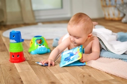 Incluye un divertido colgante con silbato que motiva a apretar, fortalece la motricidad fina y aporta alegría al descubrir sonidos. El librito flota en la superficie y los niños pueden hojearlo durante el baño.
