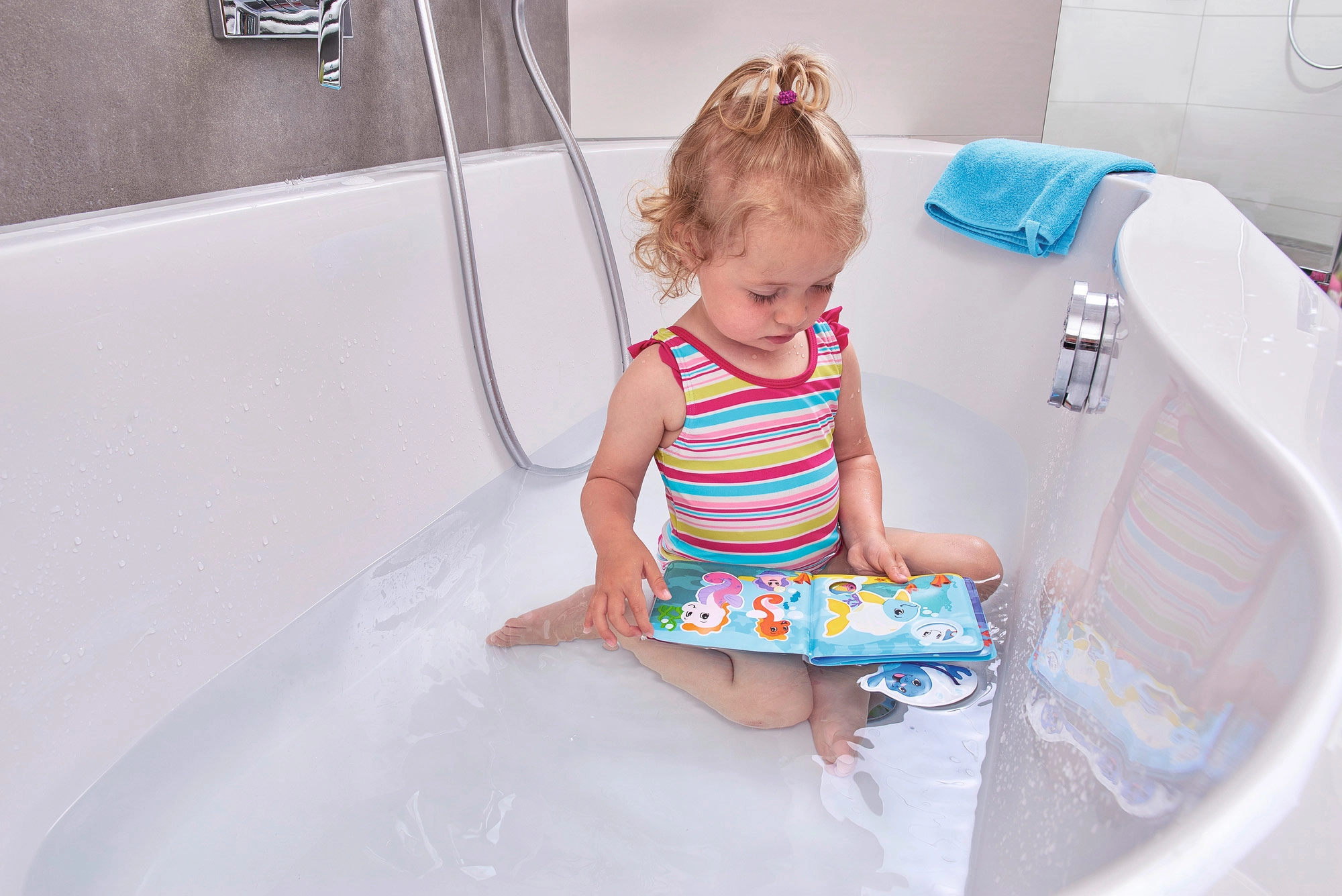 Su construcción ligera flota en el agua y es segura para jugar en la bañera y en la piscina. Los niños pasan las páginas fácilmente y descubren colores y formas.