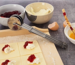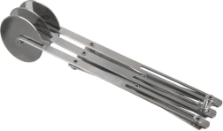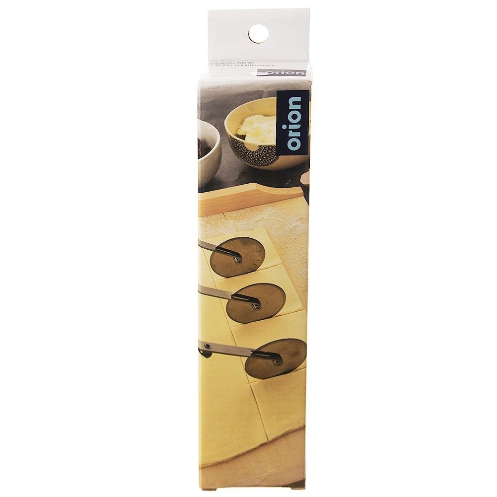 El cortador triple tipo tijera de acero inoxidable es un ayudante fiable para la repostería doméstica y profesional. Tres discos lisos unilaterales de 5,5 cm de diámetro garantizan cortes limpios sin desgarrar ni pegar la masa. El mango largo proporciona un agarre seguro y un guiado cómodo.