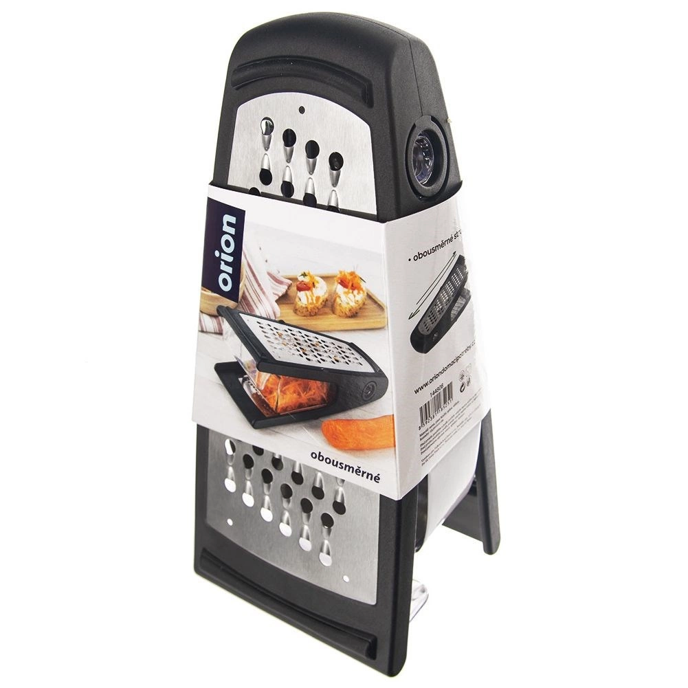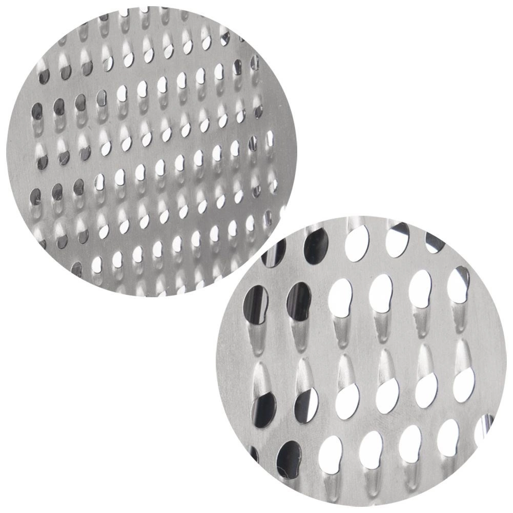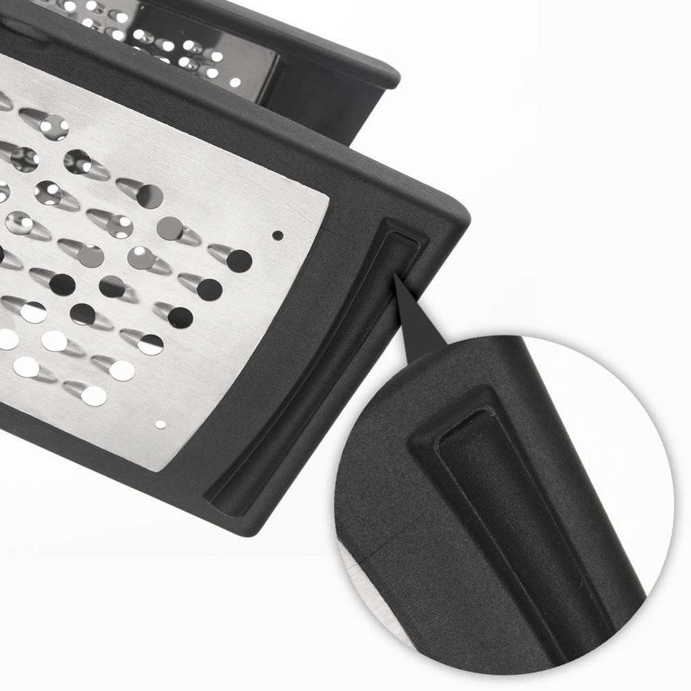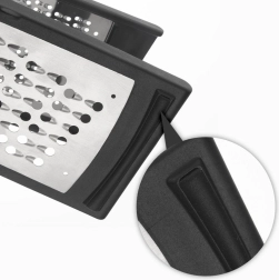 Rallador de cocina universal con recipiente transparente desmontable que simplifica la preparación de ingredientes y mantiene la superficie de trabajo limpia. Sus dos superficies de rallado permiten un resultado perfecto al rallar verduras, frutas, quesos, chocolate e incluso especias. Los extremos antideslizantes proporcionan estabilidad y evitan el deslizamiento durante el uso.