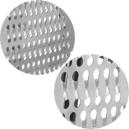Los lados fino de 2 mm y grueso de 6 mm se encargan de verduras, frutas, quesos e incluso chocolate: desde virutas finas hasta trozos más grandes.