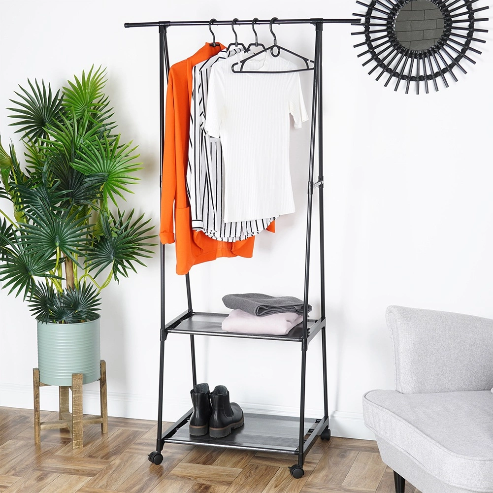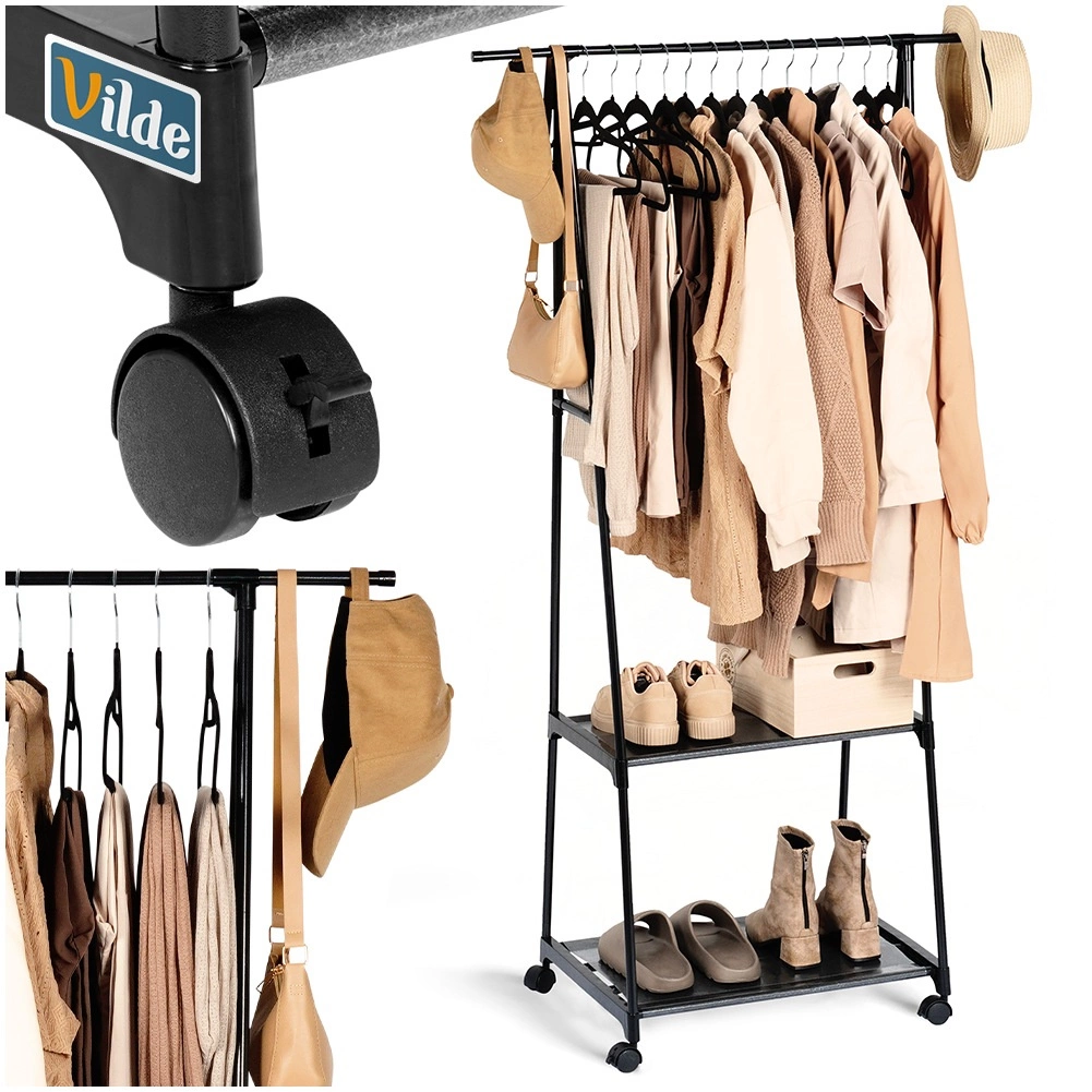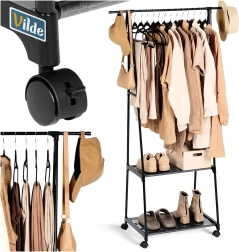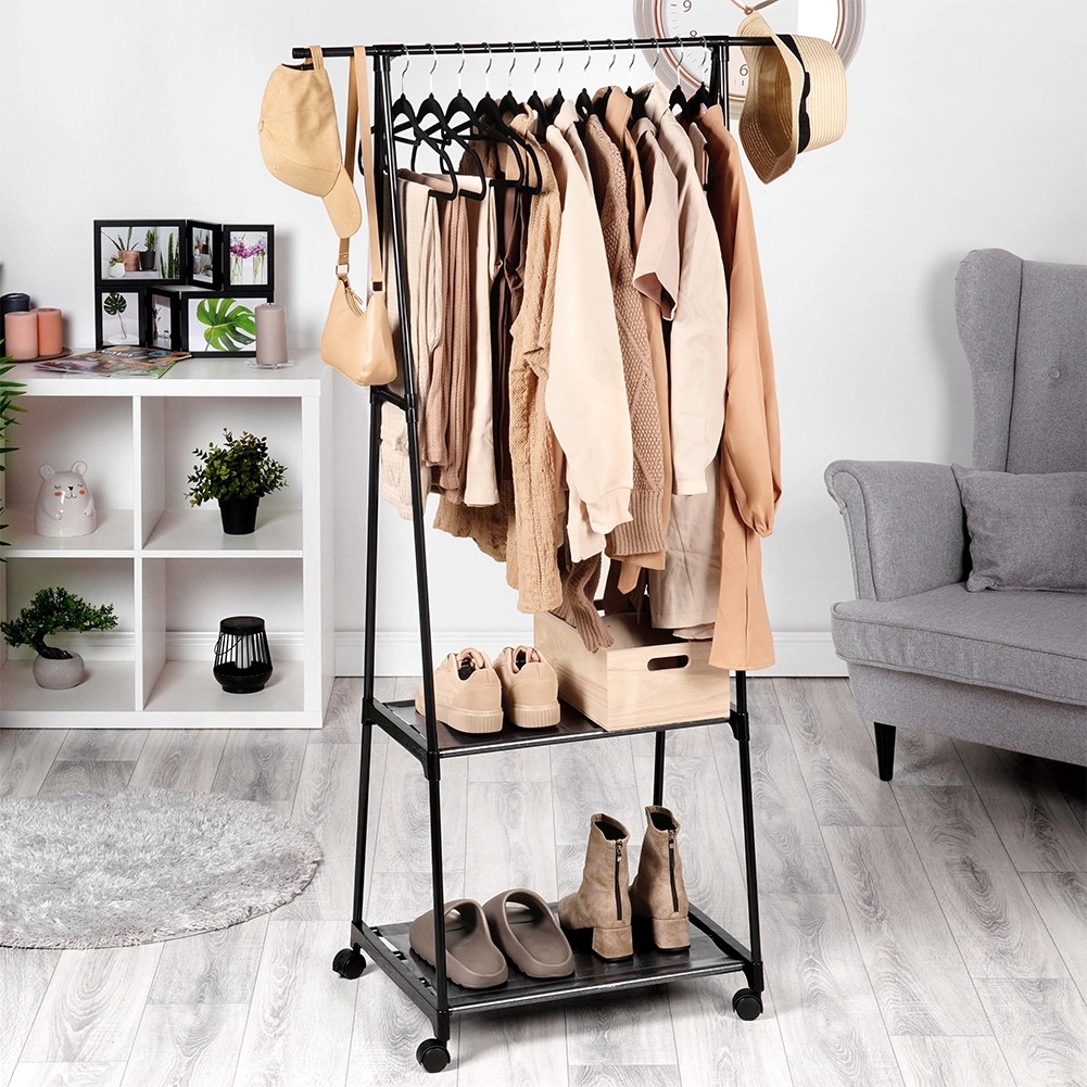 Gracias a las cuatro ruedas (dos con freno), podrás mover el perchero fácilmente adonde lo necesites: recibidor, dormitorio, vestidor, oficina o tienda. Sus dimensiones de base estrechas ahorran espacio y, aun así, ofrecen una capacidad sorprendente.