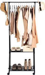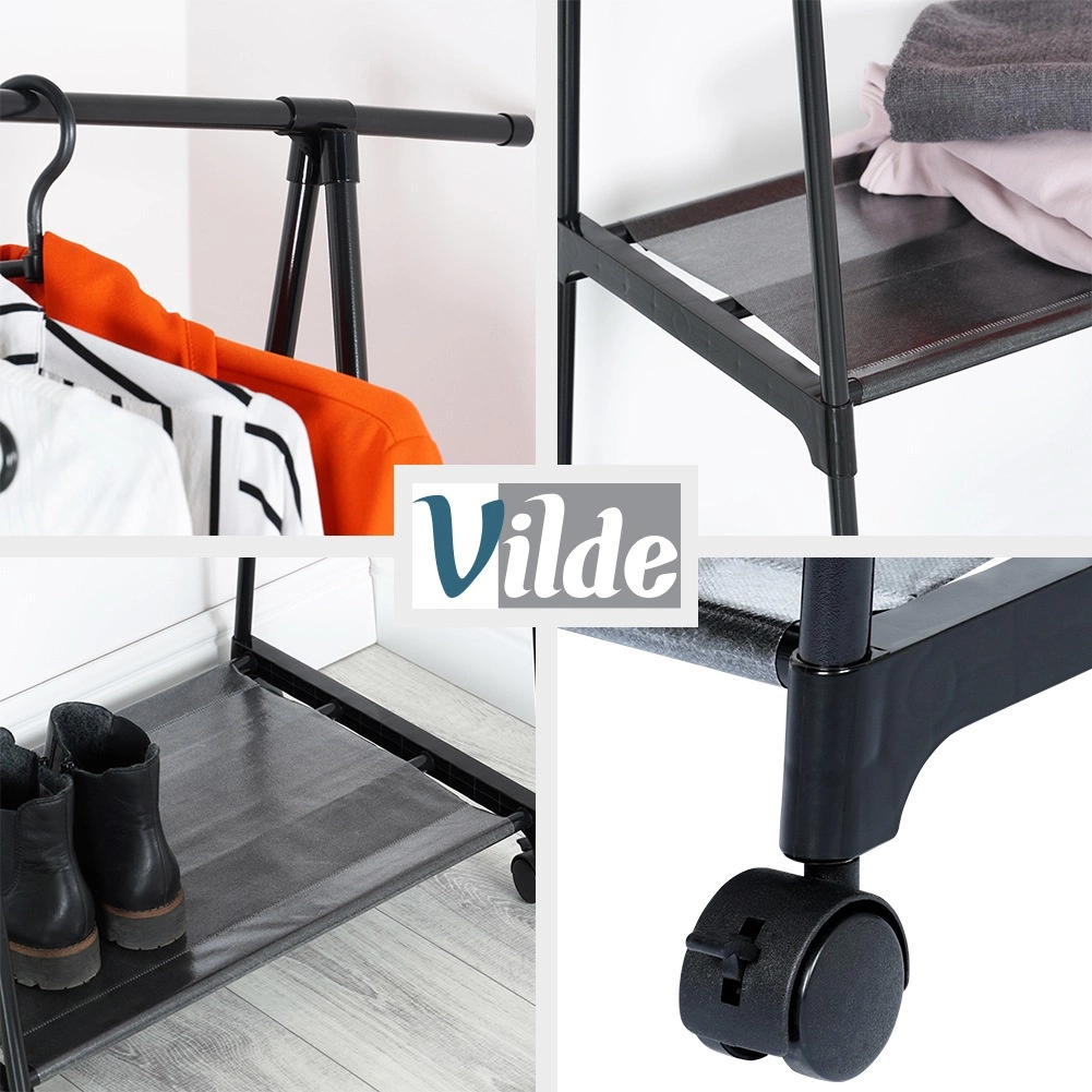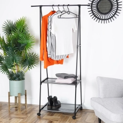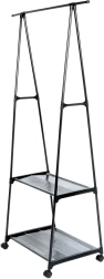 Elegante perchero de estilo industrial loft con amplia barra superior para colgar prendas y dos estantes inferiores para zapatos, bolsos o cajas organizadoras. La estructura totalmente metálica en color negro es robusta, estable y fácil de mantener; los estantes textiles de poliéster son ligeros y duraderos.