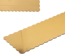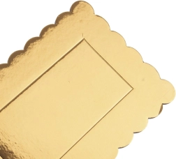 Elegante base dorada para tarta de 33 × 12 cm con borde ondulado decorativo. Es doble cara, fabricada en cartón rígido y recubierta con lámina protectora por ambos lados, por lo que resiste la humedad y es apta para refrigerador. Proporciona un soporte estable para el traslado y transporte seguro de tartas y postres más pesados, garantizando a la vez un servicio representativo.