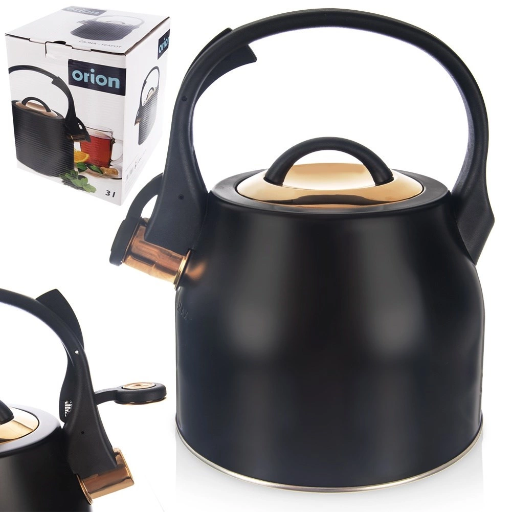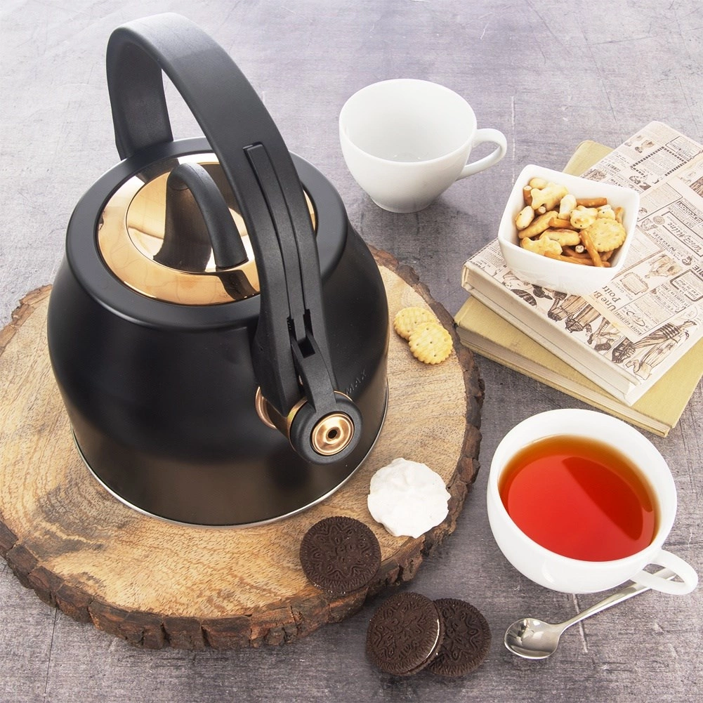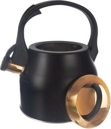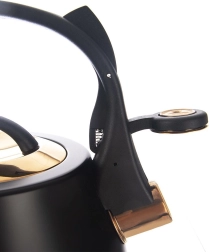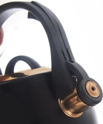 Un hervidor con estilo de acero inoxidable en combinación de negro y dorado que será el adorno de cocinas modernas y clásicas. Gracias a su base amplia y estable y al material de calidad, calienta el agua de forma rápida y eficiente sin afectar su sabor. El silbato abatible avisa de forma fiable cuando hierve, mientras que el asa cómoda y resistente al calor garantiza un agarre seguro.