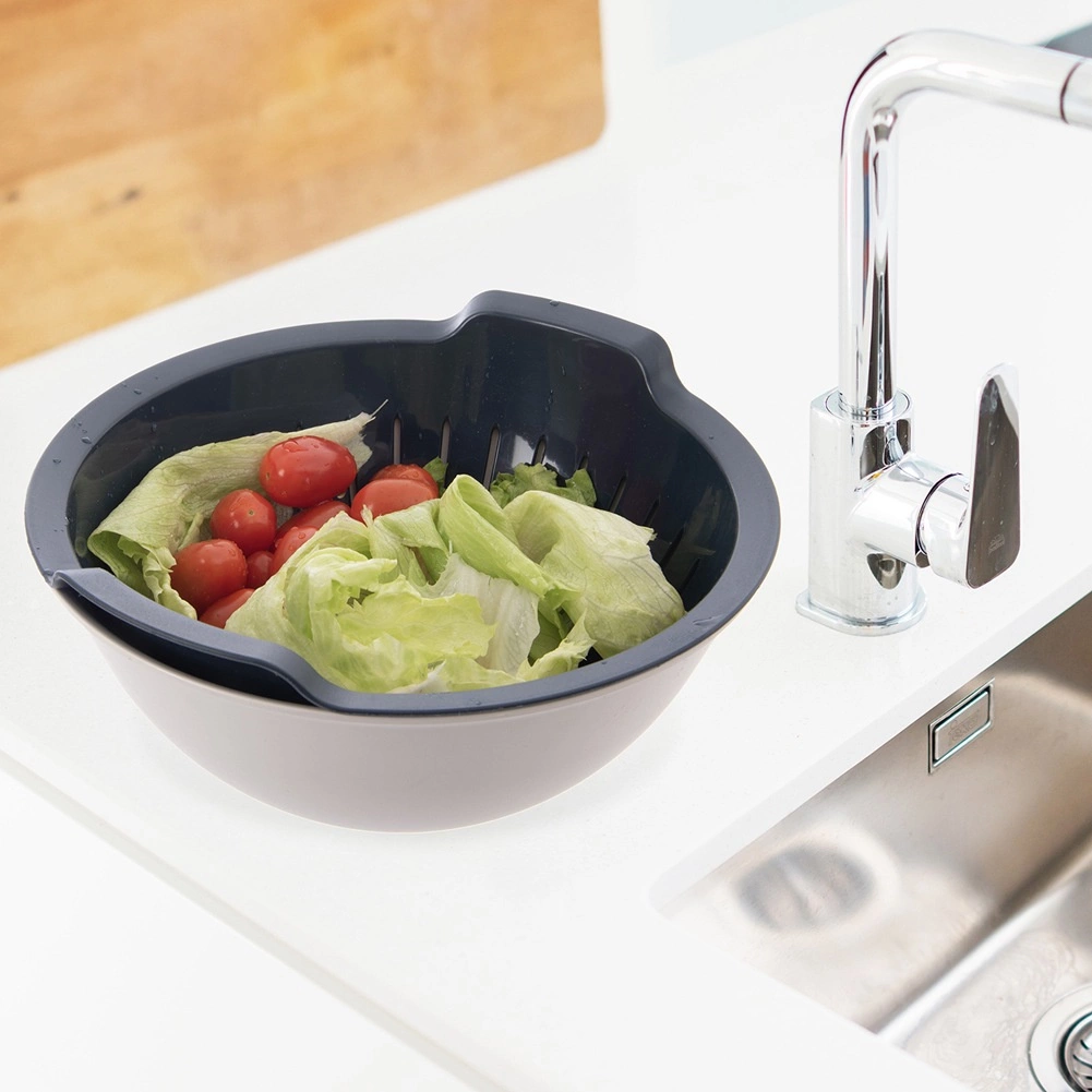 Ambas piezas pueden usarse juntas o por separado: colador para escurrir pasta, patatas o enjuagar ensaladas y frutas; bol para mezclar masa de crepes, preparar ensaladas o servir. El material sin BPA es resistente hasta +95 °C, se limpia fácilmente en el lavavajillas y el bol es apto para microondas.