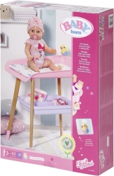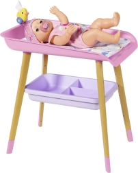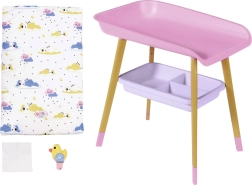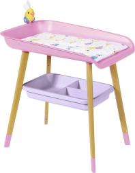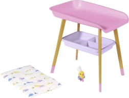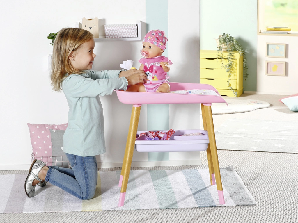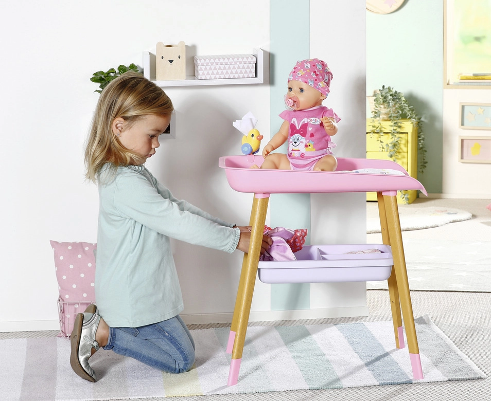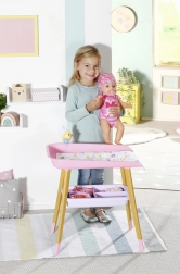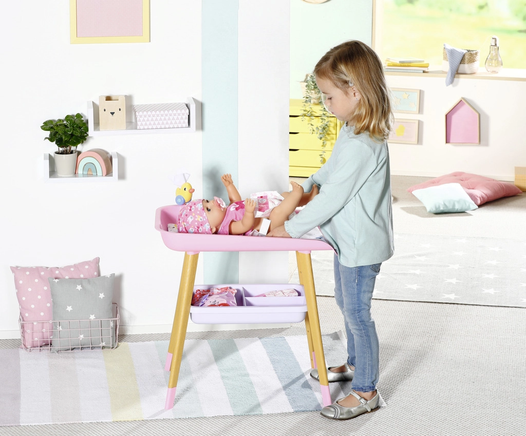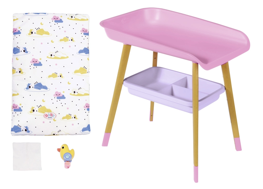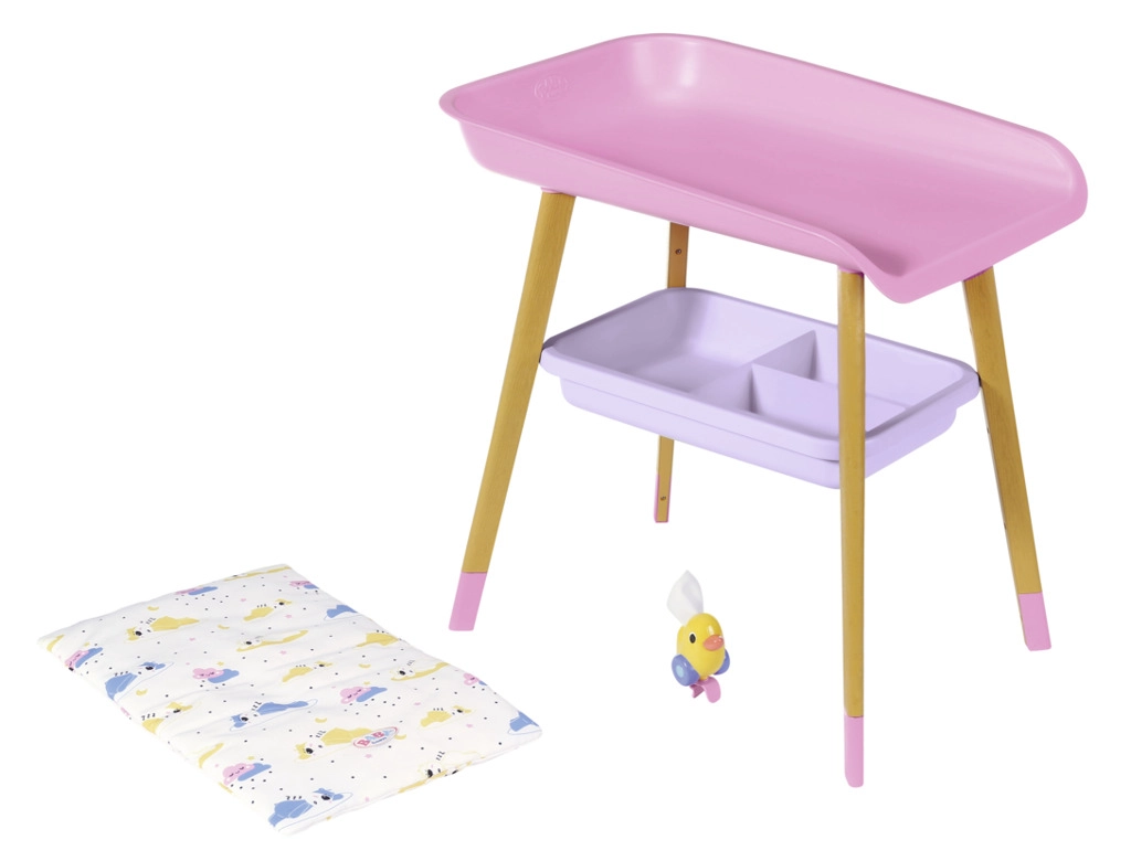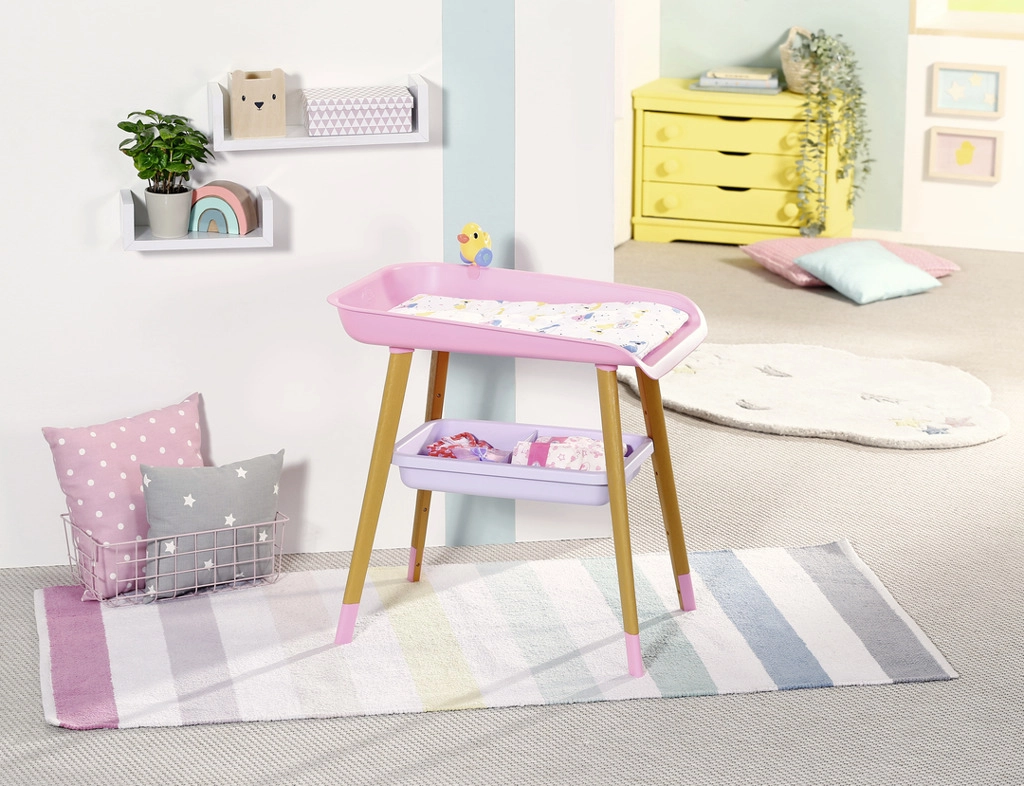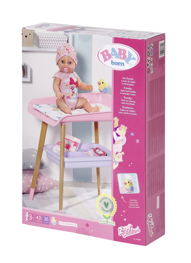 El elegante cambiador para muñecas BABY born ofrece a los niños un juego de cuidado realista. Tiene patas con acabado efecto madera, una suave colchoneta para cambiar, un dispensador de toallitas extraíble con un patito y prácticos compartimentos para pañales, ropita y accesorios. Completa a la perfección la habitación infantil y combina con otros accesorios de BABY born.