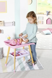 El cambiador para muñecas BABY born está diseñado en el popular estilo escandinavo: combina un aspecto limpio con practicidad. El acabado de madera de las patas aporta un toque moderno y estable, y la parte superior con una colchoneta suave es ideal para cambiar a las muñecas cómodamente.