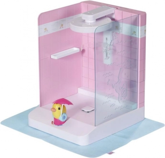 Convierte el baño en un ritual favorito con la moderna ducha para muñecos BABY born. Gracias a la bomba electrónica sale agua real del cabezal de ducha, el adorable patito Berta funciona como interruptor y el estable soporte para muñeco deja las manos libres a los niños mientras juegan. La altura de la ducha se ajusta fácilmente para muñecos de 36 y 43 cm.