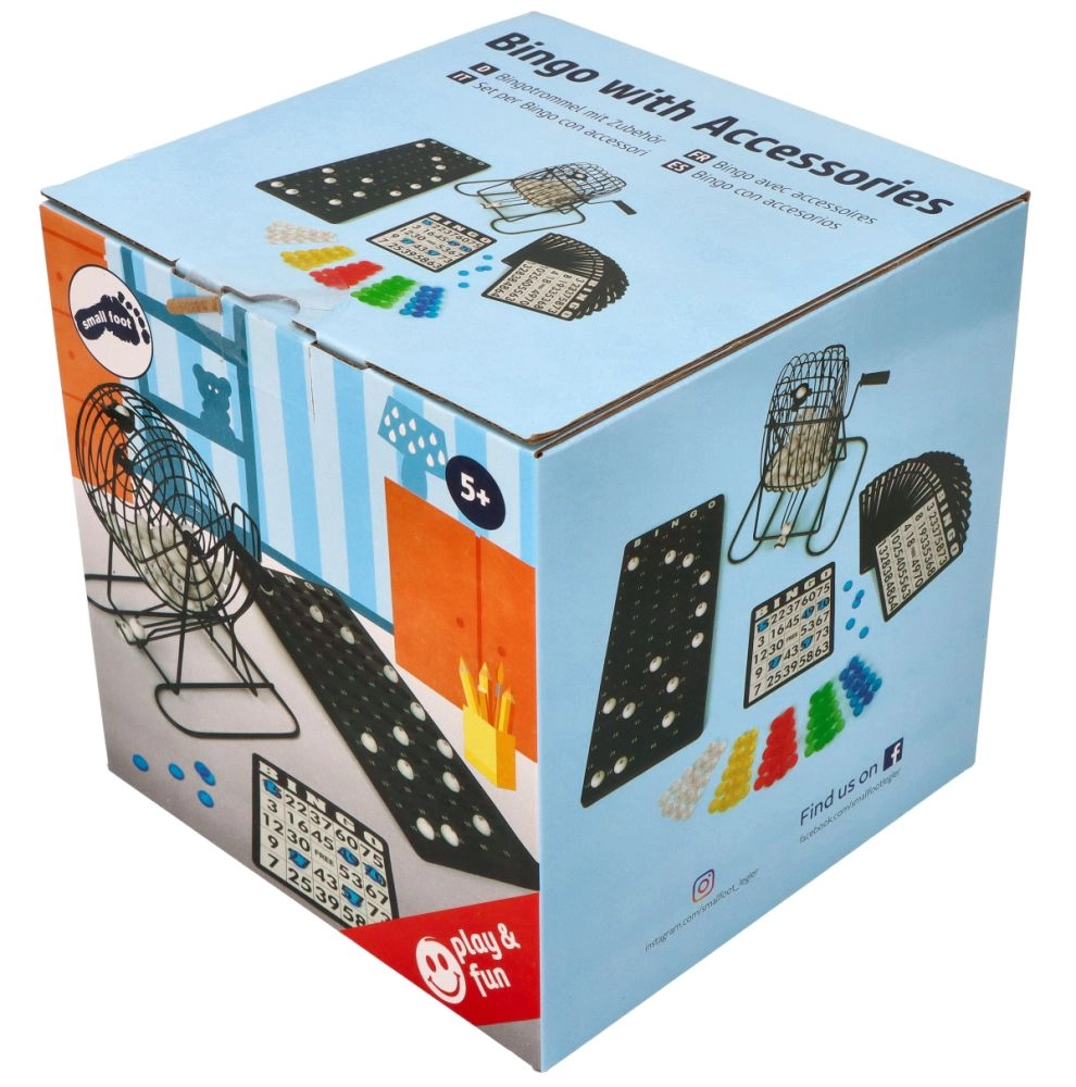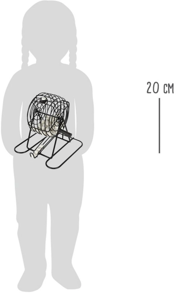 Disfruta del clásico entretenimiento social con el juego completo de Bingo de la marca Small Foot. El set incluye un bombo metálico, fichas de colores, bolas blancas numeradas y prácticos contenedores de plástico. Los jugadores eligen el color de sus fichas, giran la manivela y observan qué bola cae en la bandeja: gana quien primero complete la combinación correcta. Un gran juego para niños y adultos que fomenta el reconocimiento de números y aporta emoción y diversión compartida.