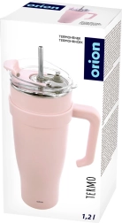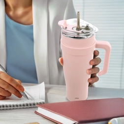 La práctica taza térmica de viaje con capacidad de 1,2 l ofrece comodidad al beber en cualquier situación. El acero inoxidable de calidad en elegante color rosa, el asa ergonómica y la tapa transparente con cierre y abertura para pajita metálica garantizan un uso seguro y cómodo. La construcción con aislamiento al vacío mantiene de forma fiable la temperatura de las bebidas durante horas.