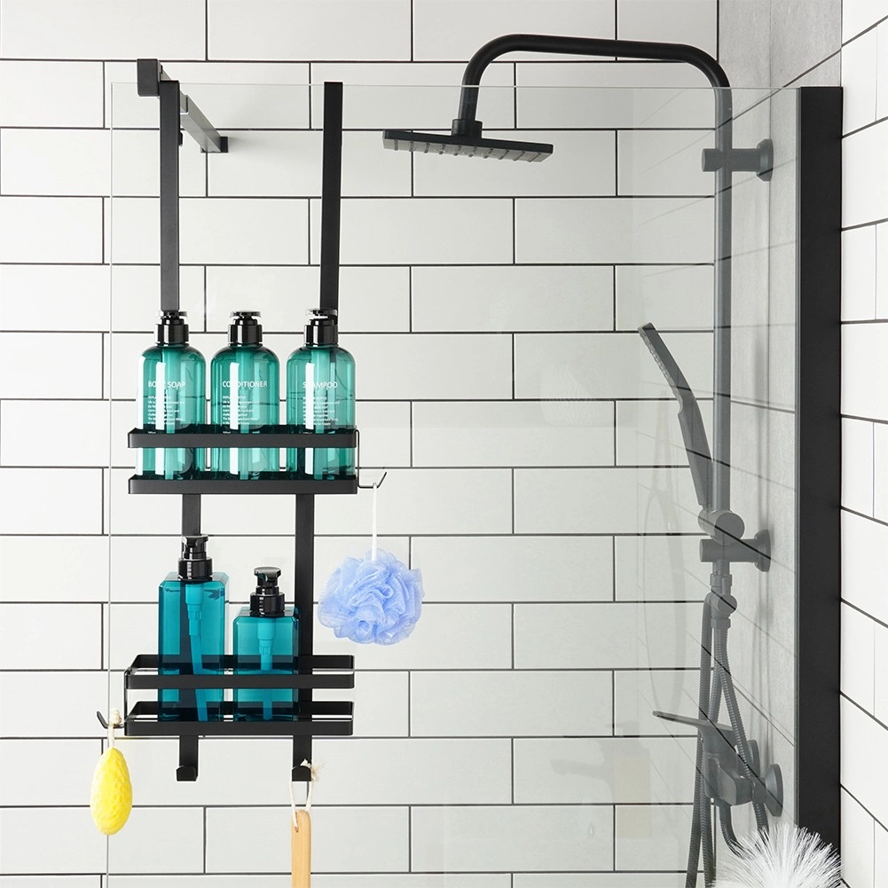 Mantén la ducha ordenada y con estilo. El estante colgante de diseño loft industrial ofrece dos niveles de almacenamiento para champús, acondicionadores y jabones, mientras que cuatro prácticos ganchos sirven para esponjas, cepillos o maquinillas. El metal con recubrimiento en polvo en negro es sólido y resistente a la corrosión, ideal para el uso diario.