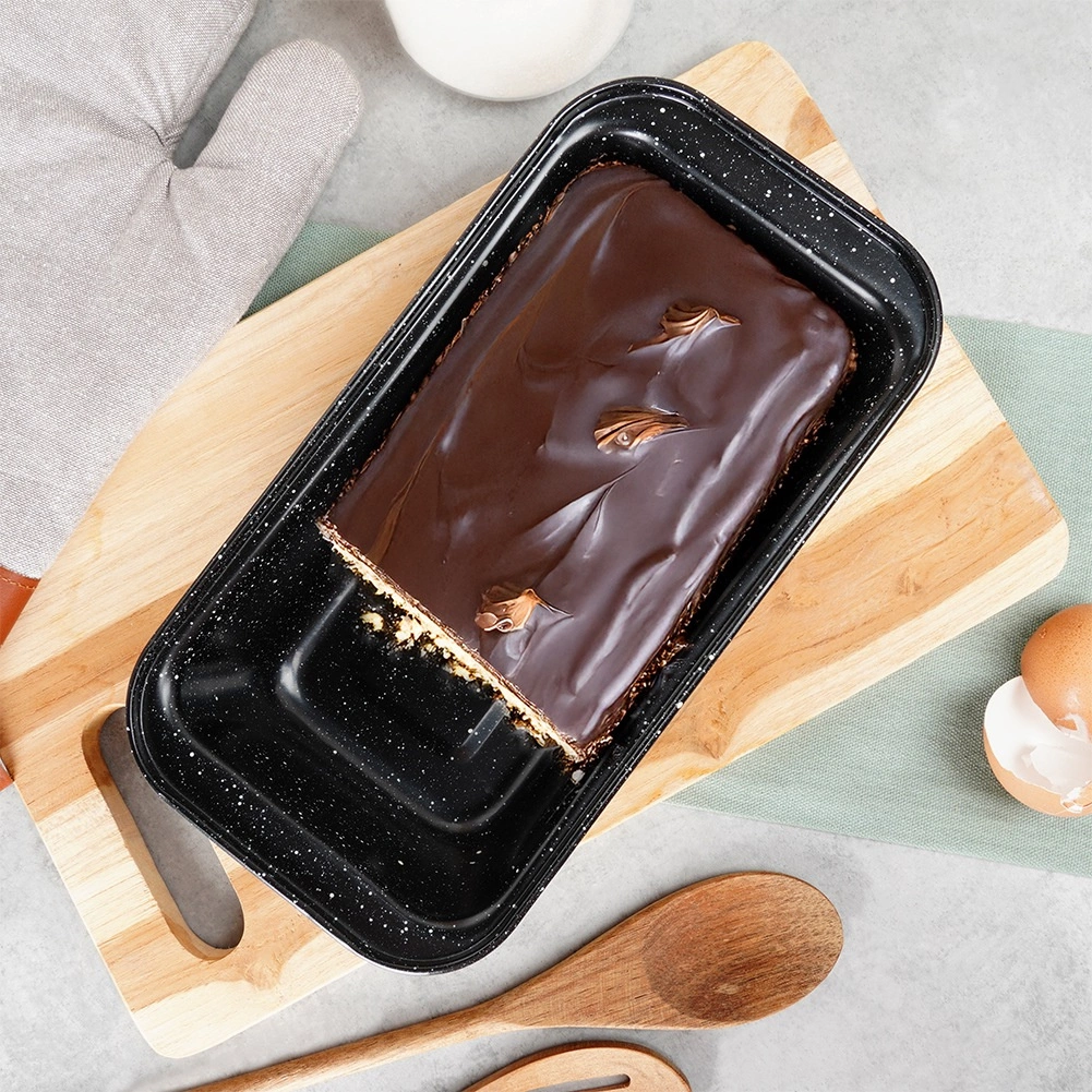 Este molde rectangular de acero al carbono de alta calidad con capa antiadherente de granito es ideal para hornear pan casero, bizcochos tipo plum cake, galletas y patés. El material garantiza un calentamiento rápido y uniforme, por lo que tus preparaciones siempre quedarán bonitas y homogéneamente cocidas.