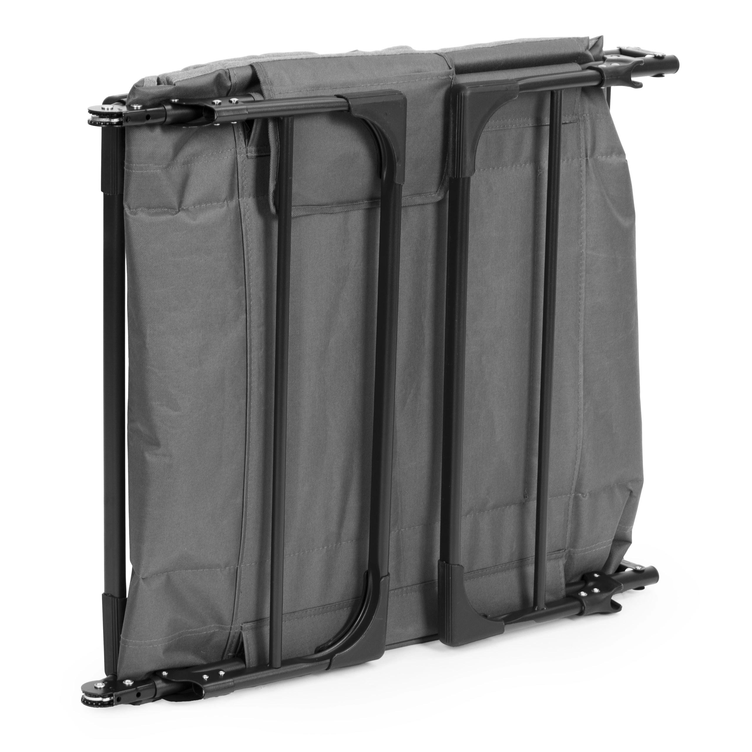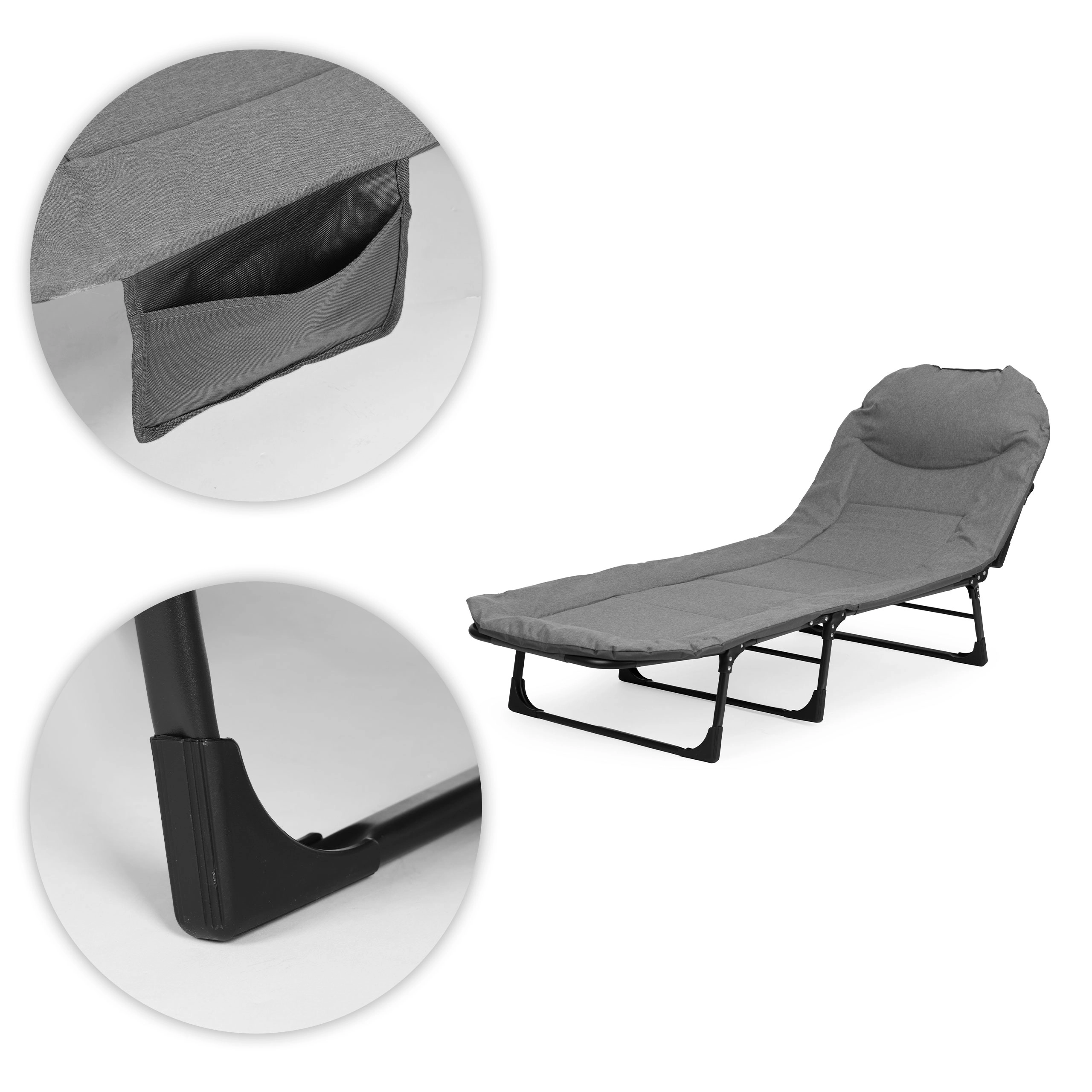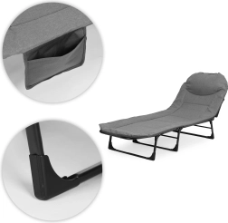 La tumbona se pliega rápidamente a un tamaño compacto, por lo que la guardarás sin problemas en el coche o el armario. El bolsillo lateral mantiene el teléfono, las gafas o el libro a mano, y el reposacabezas integrado y suave aumenta la comodidad durante estancias prolongadas.