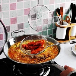 El mango metálico largo protege del vapor y del aceite caliente y asegura un agarre firme tanto al freír como al cocinar.