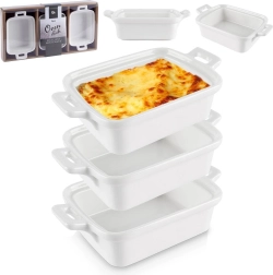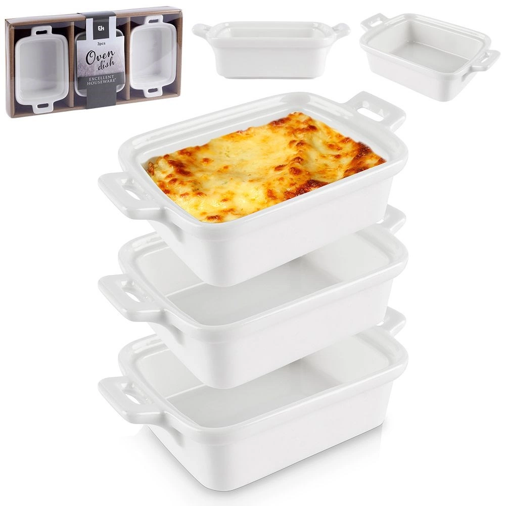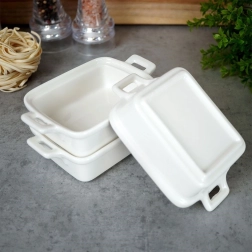 Estas cazuelitas compactas de forma rectangular con asas integradas son perfectas para crème brûlée, suflés, pequeñas porciones horneadas, gratinados o mini lasañas. La porcelana de calidad distribuye el calor de manera uniforme y mantiene los platos calientes por más tiempo, por lo que puedes servir directamente del horno a la mesa.