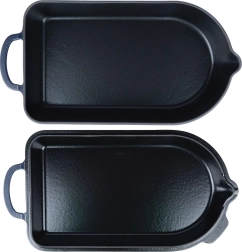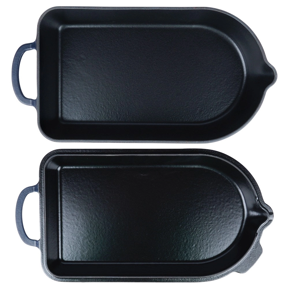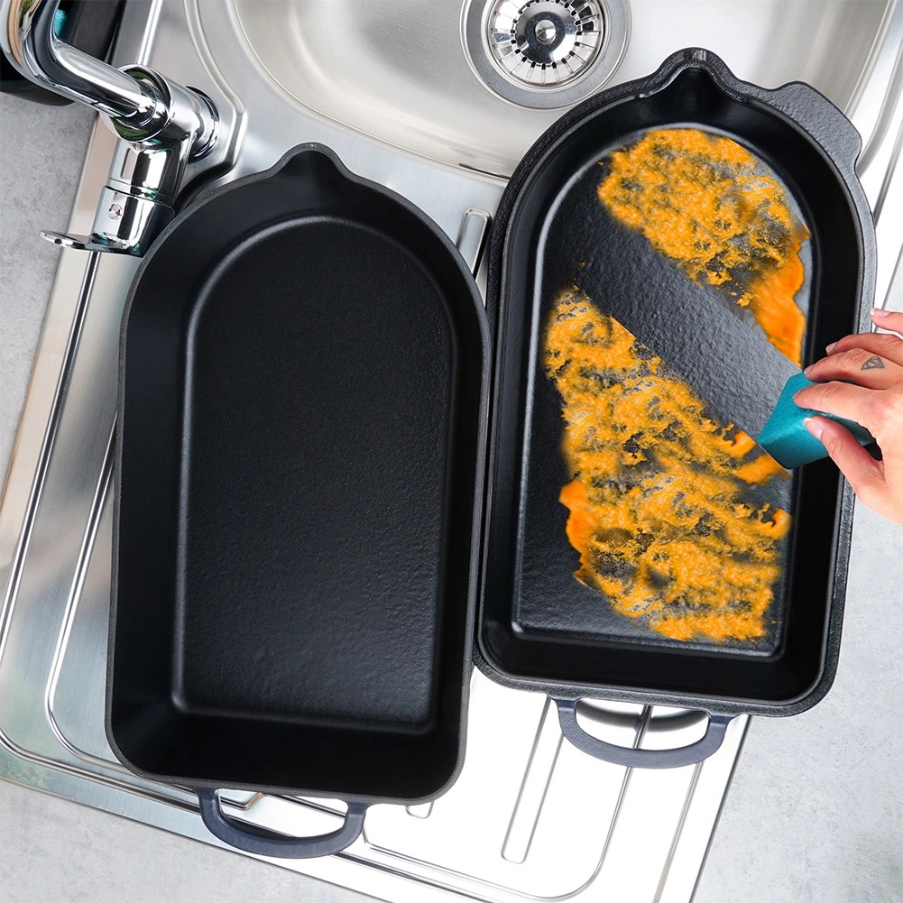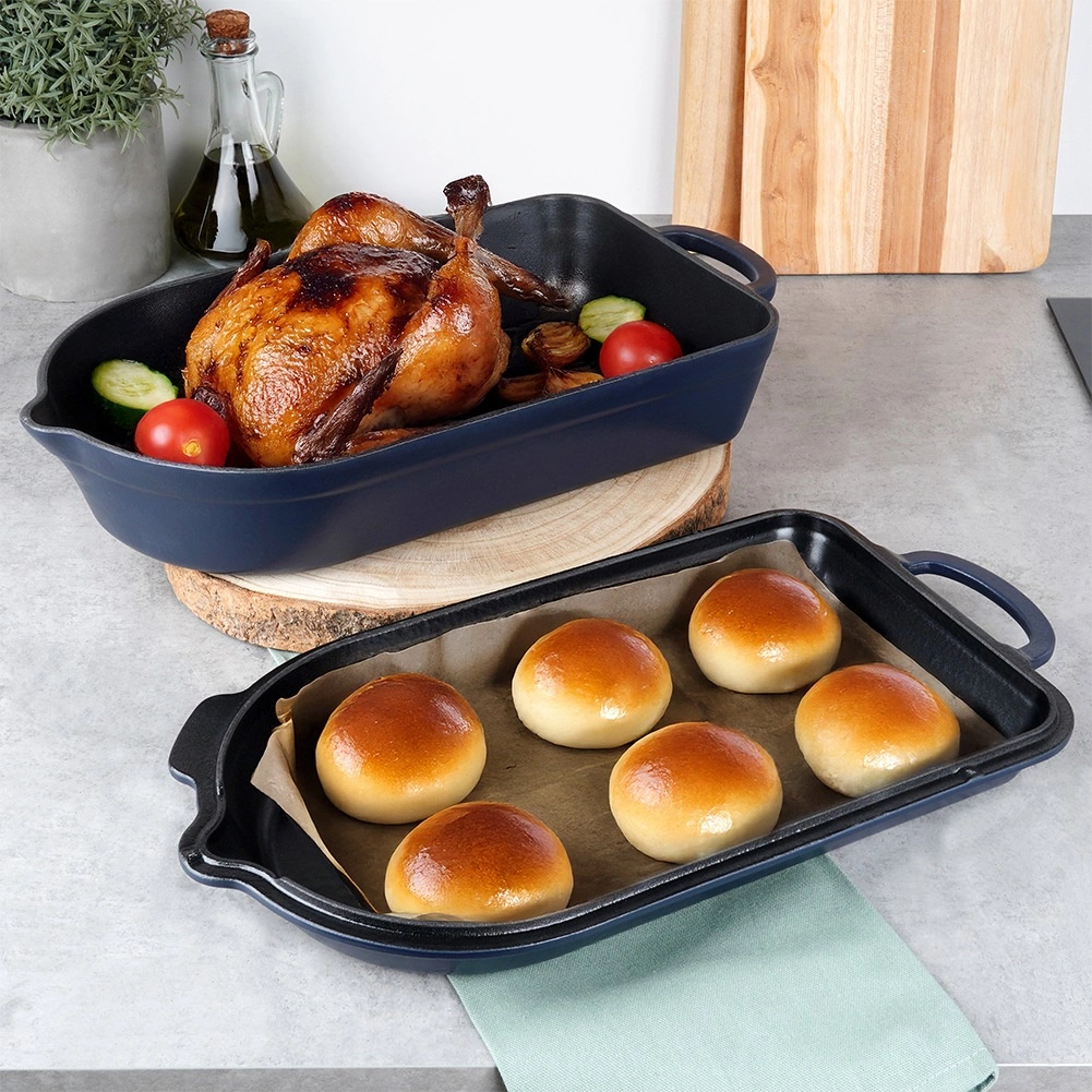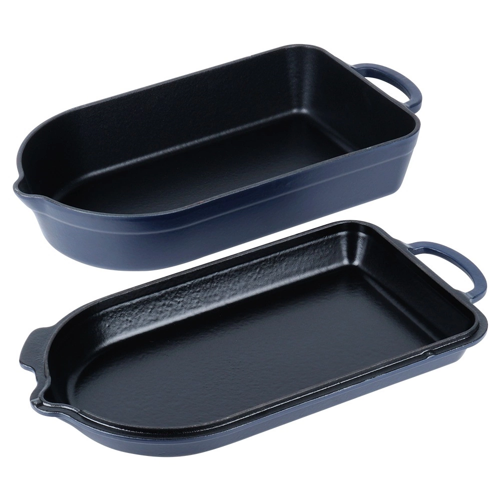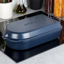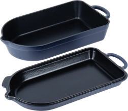 El esmalte negro interior facilita freír, gratinar y el mantenimiento, mientras que la cubierta exterior en esmalte azul oscuro aporta un aspecto elegante para servir directamente en la mesa. El menaje es apto para cocinas de gas, eléctricas, vitrocerámicas, halógenas e inducción y para horno hasta 250 °C. Ambas piezas cuentan con prácticos picos vertedores para escurrir jugos con facilidad y asas seguras para un transporte cómodo.