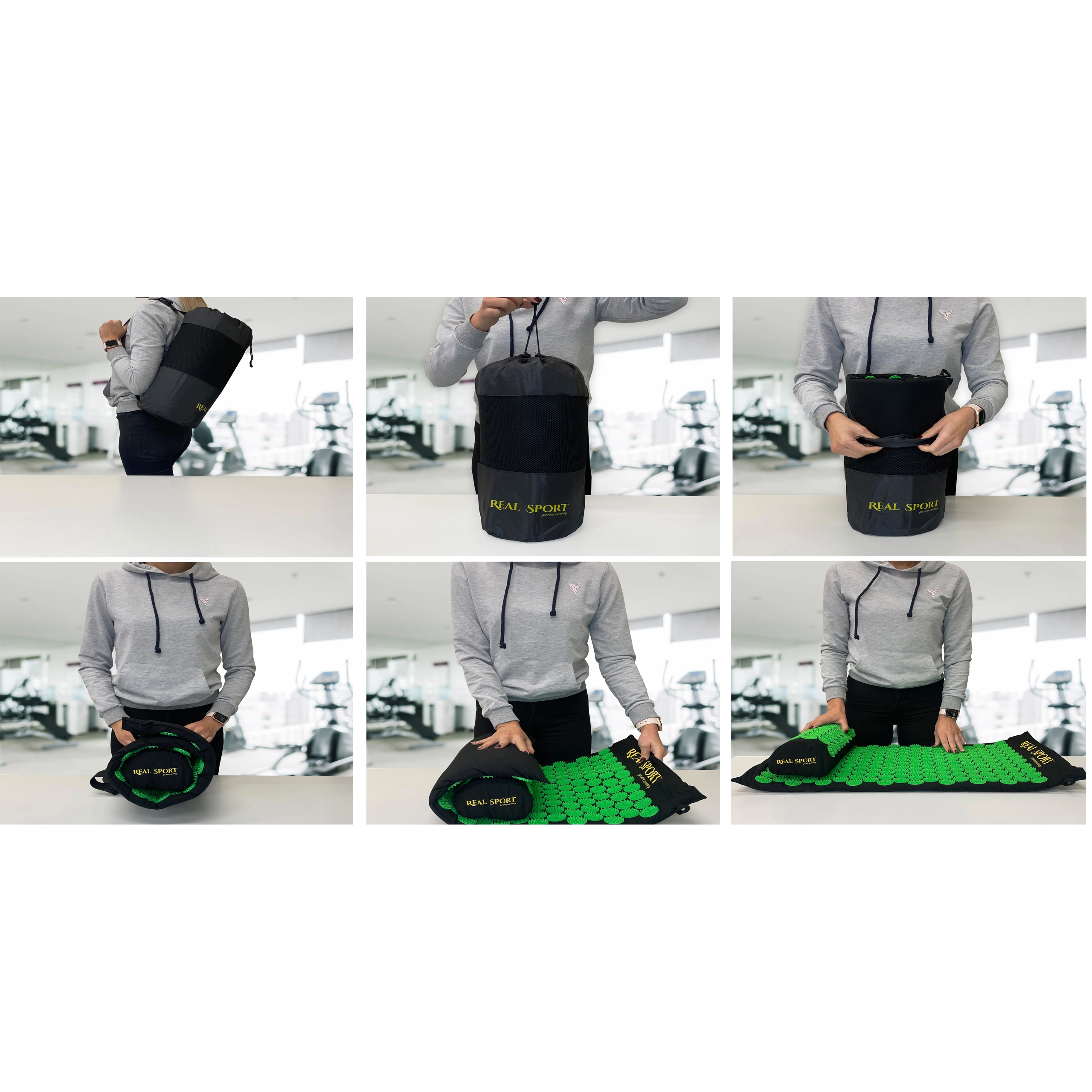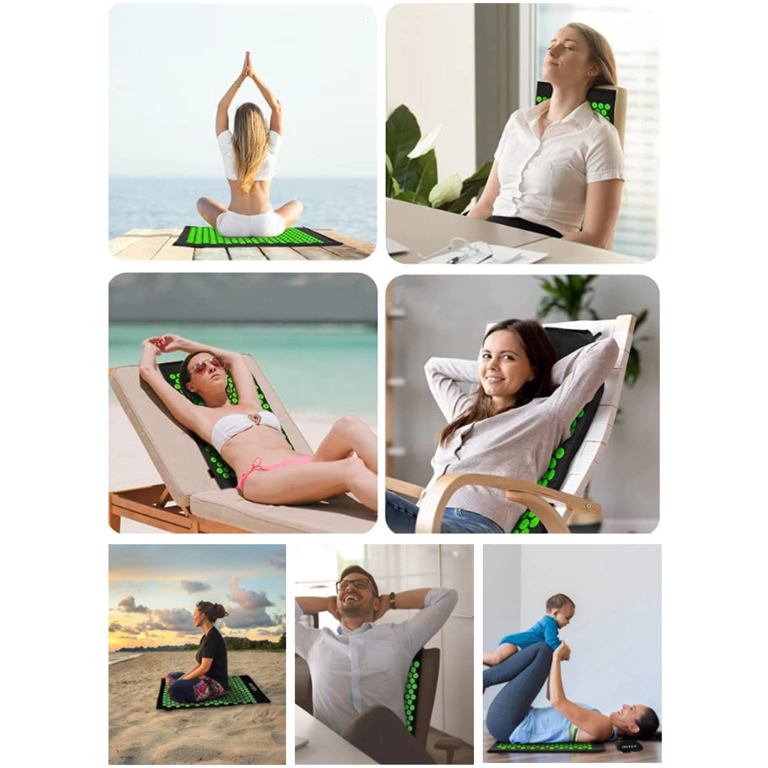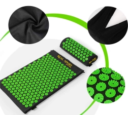 El set de acupresión (esterilla + cojín) imita el efecto de la acupresión tradicional y ayuda a aliviar la tensión en la espalda, el cuello y los hombros. Decenas de discos verdes con puntas se dirigen a los puntos de presión, favoreciendo la regeneración muscular y la circulación natural. Gracias a su construcción ligera y a la bolsa, se lleva fácilmente a casa, a la oficina o de viaje.