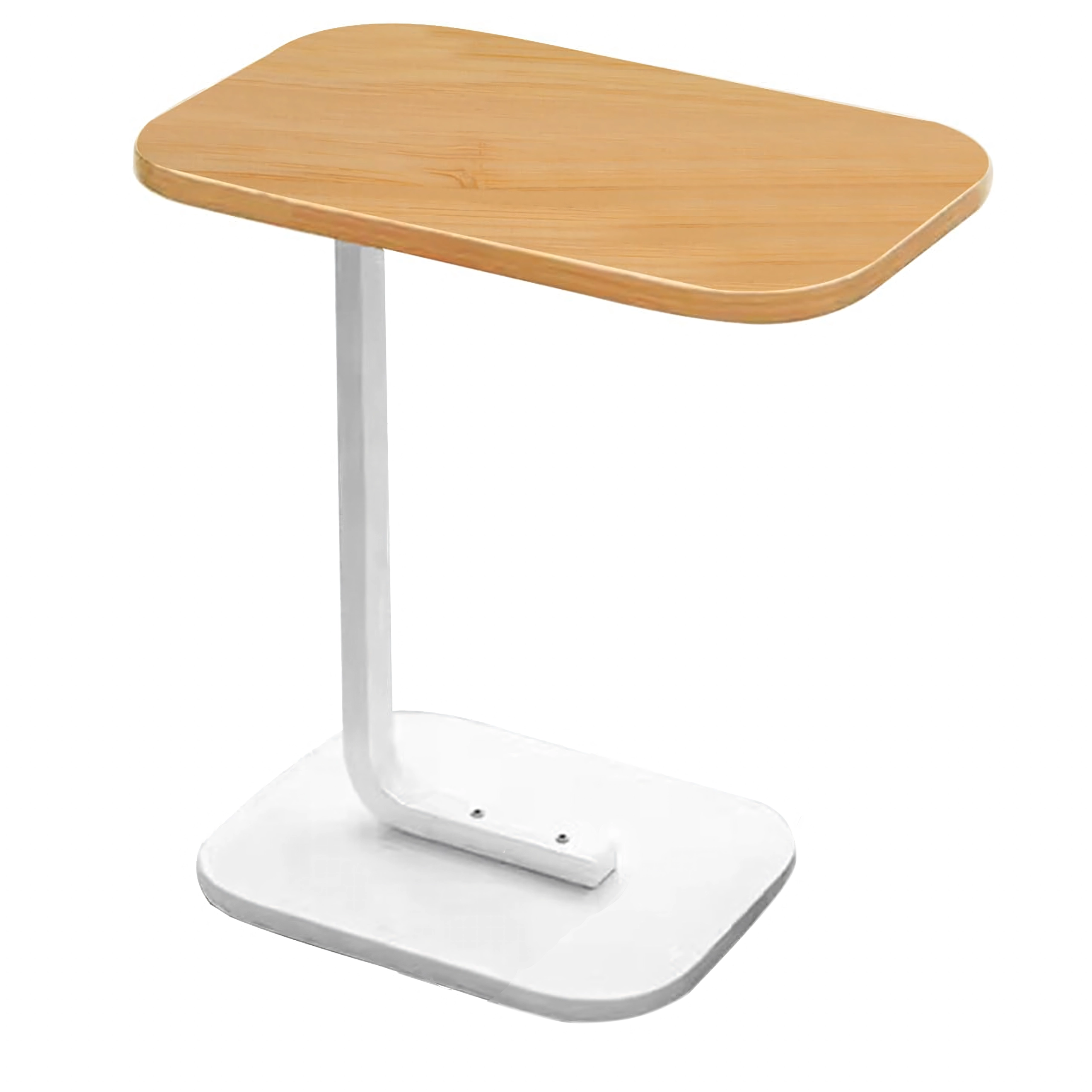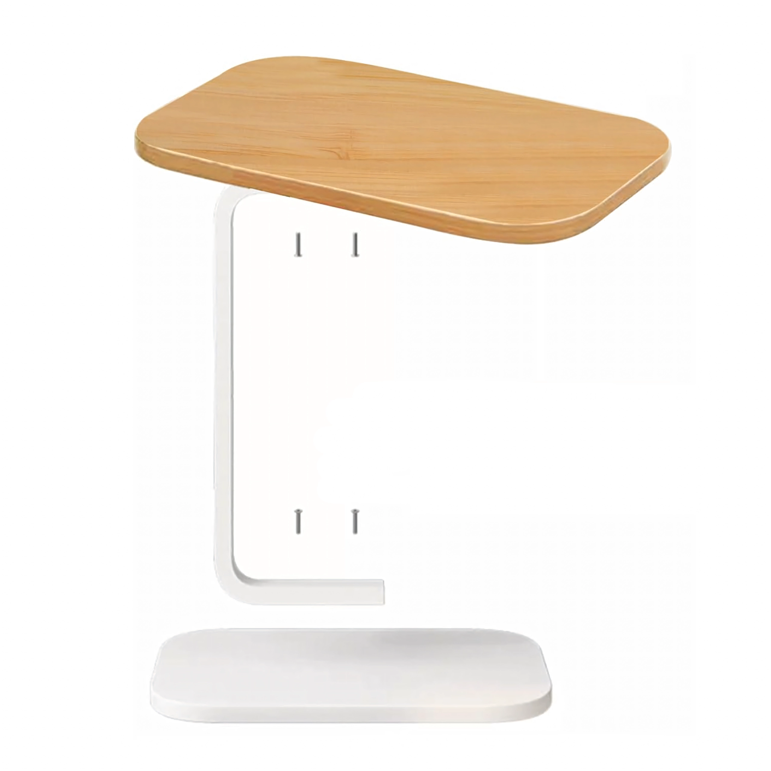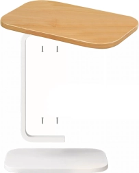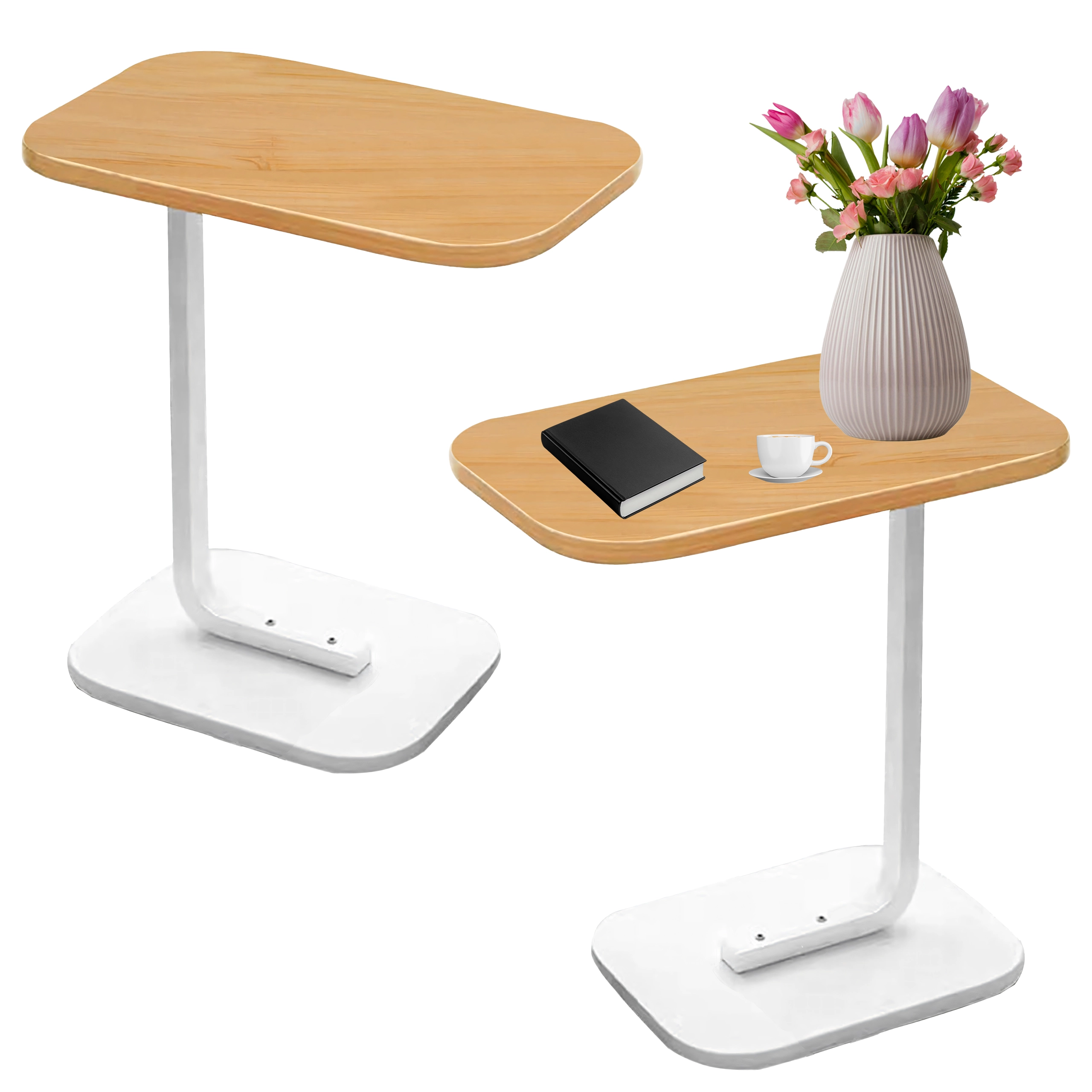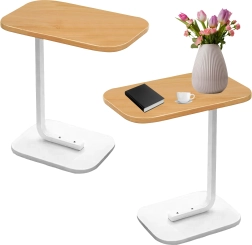 Mesa que ahorra espacio con tapa ovalada/redondeada en acabado de madera clara y sólida estructura metálica blanca, que ofrece un uso cómodo junto al sofá o la cama. La forma en C permite deslizar la base bajo el mueble y acercar la tapa exactamente donde la necesitas.