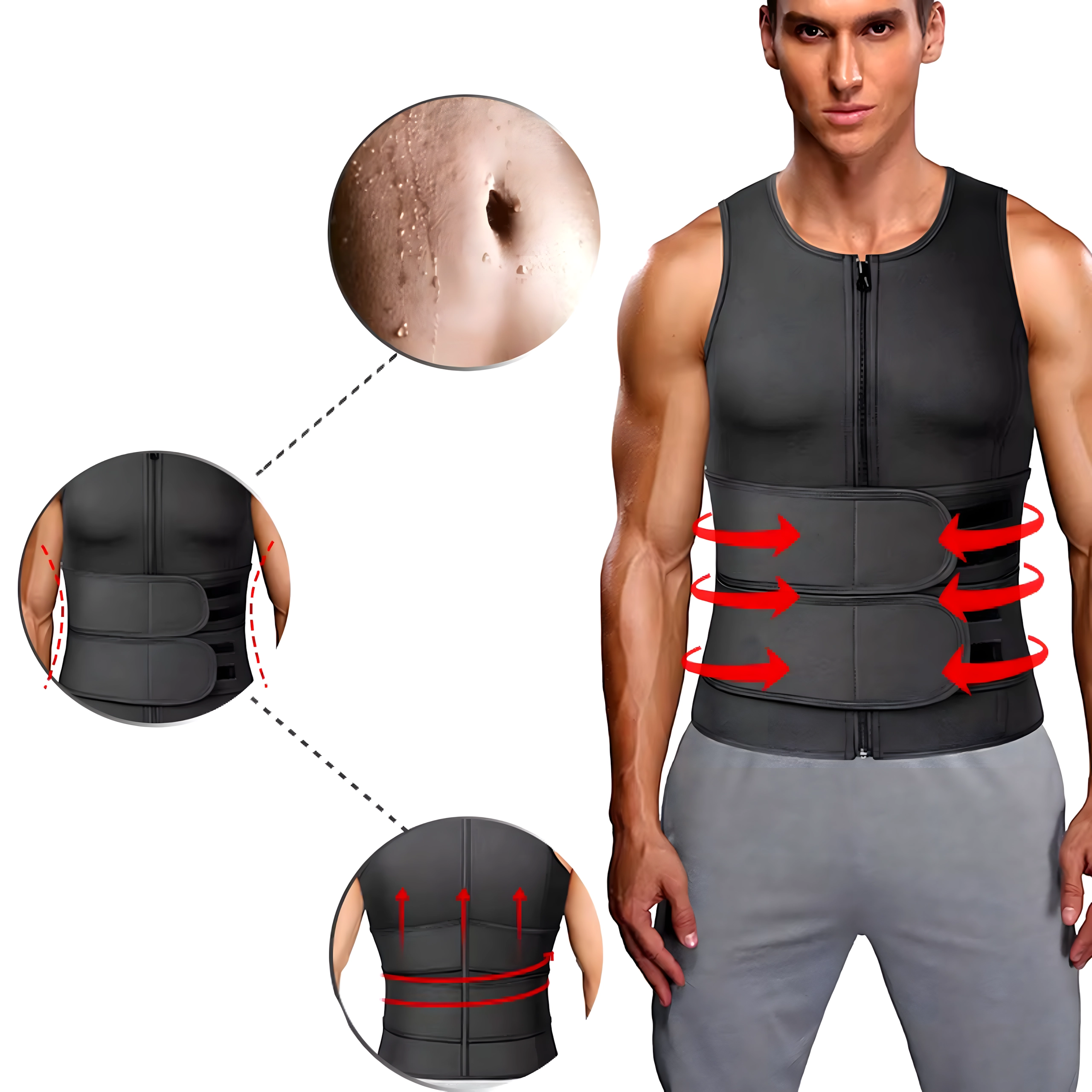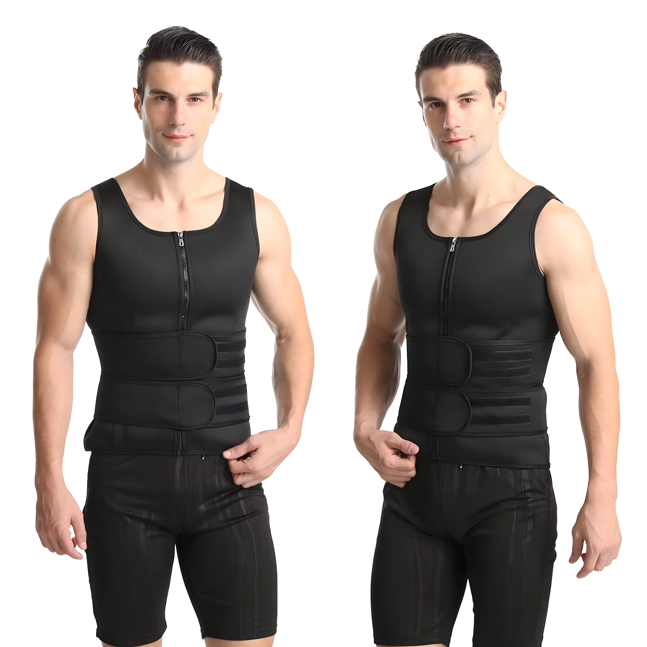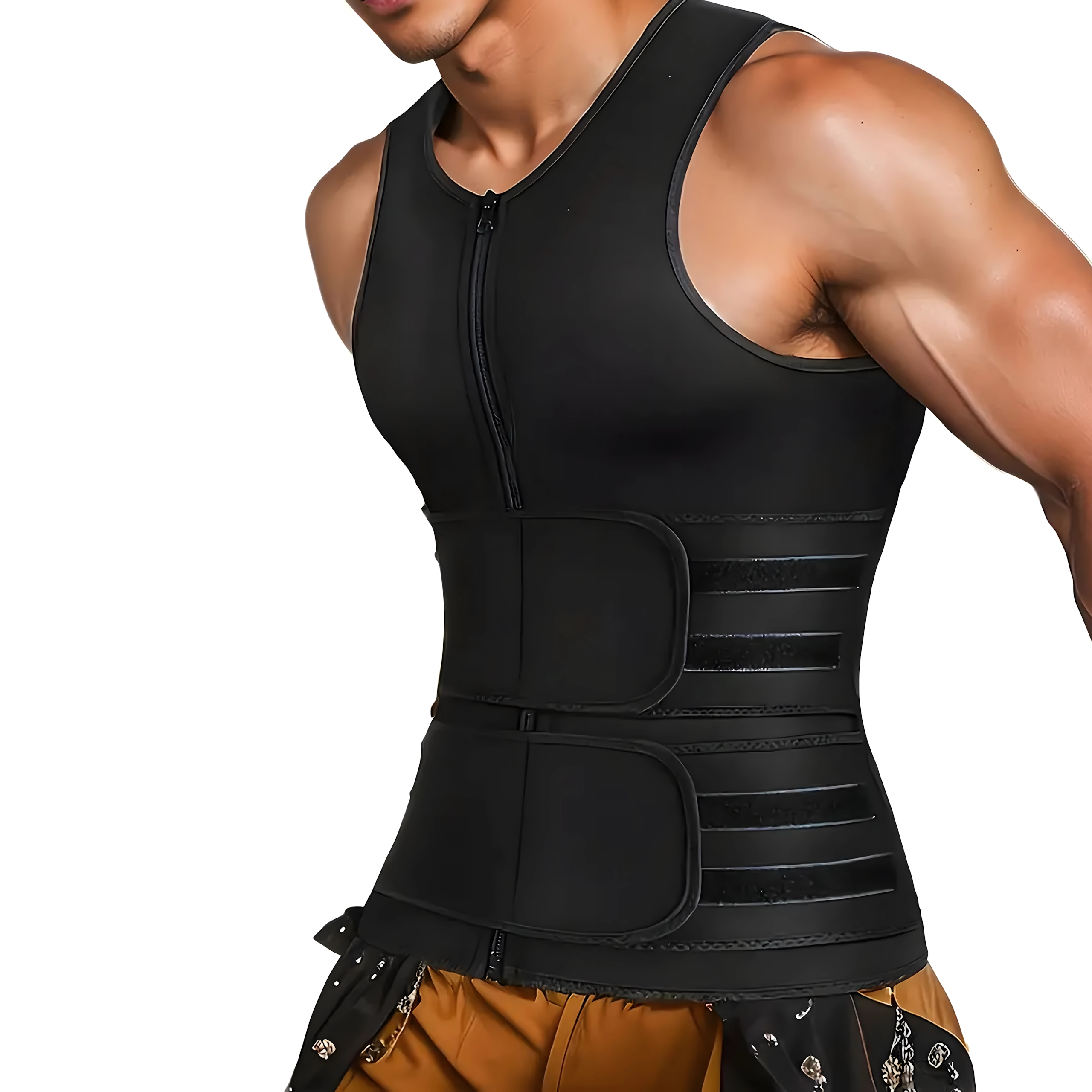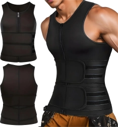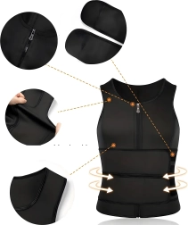 Este chaleco sauna compresivo para hombre, fabricado en neopreno de alta calidad, eleva la temperatura corporal durante el entrenamiento, ayudando a sudar más rápido y a moldear eficazmente la cintura. La cremallera de largo completo facilita el uso y dos anchas bandas ajustables de velcro permiten regular con precisión el nivel de compresión en el abdomen y la zona central.