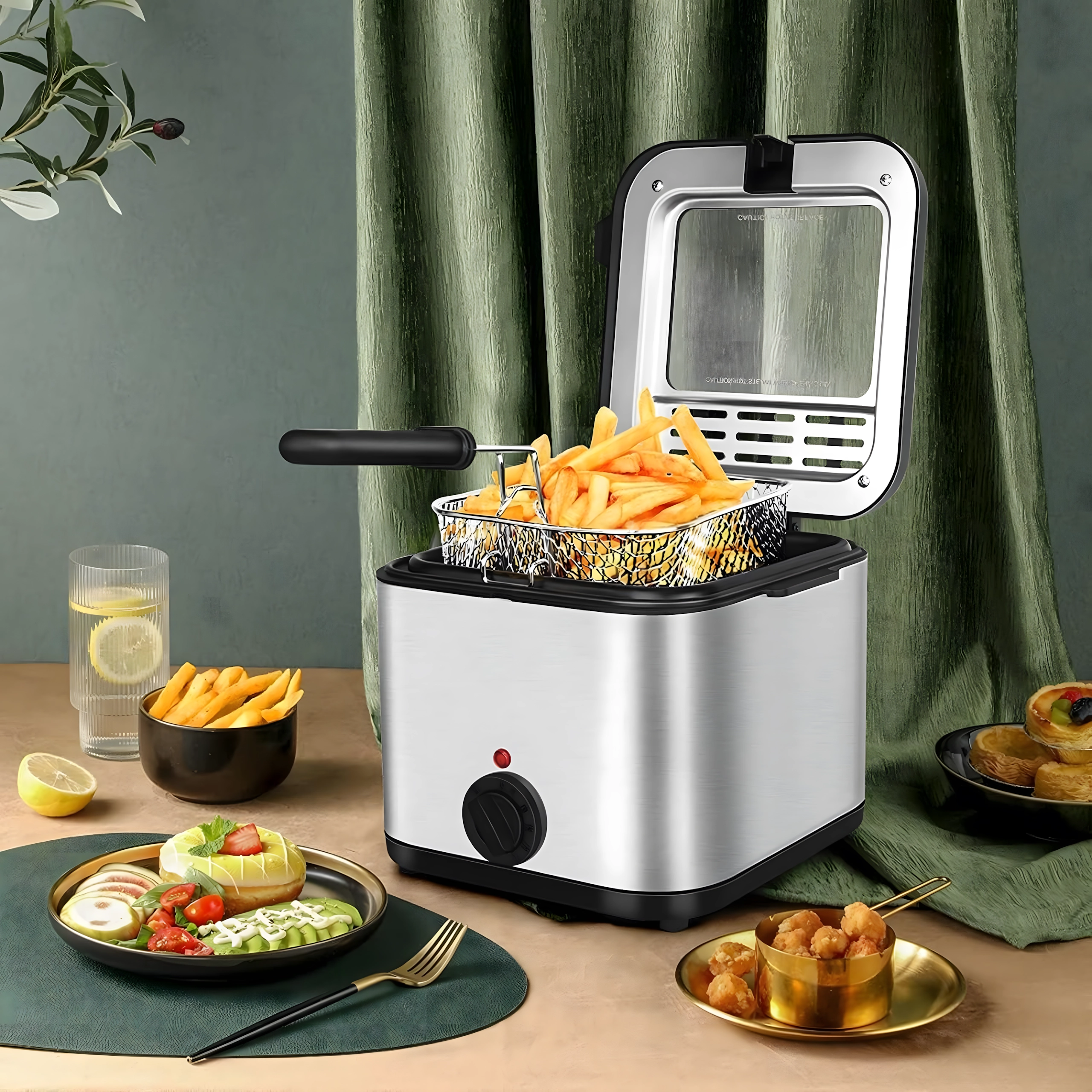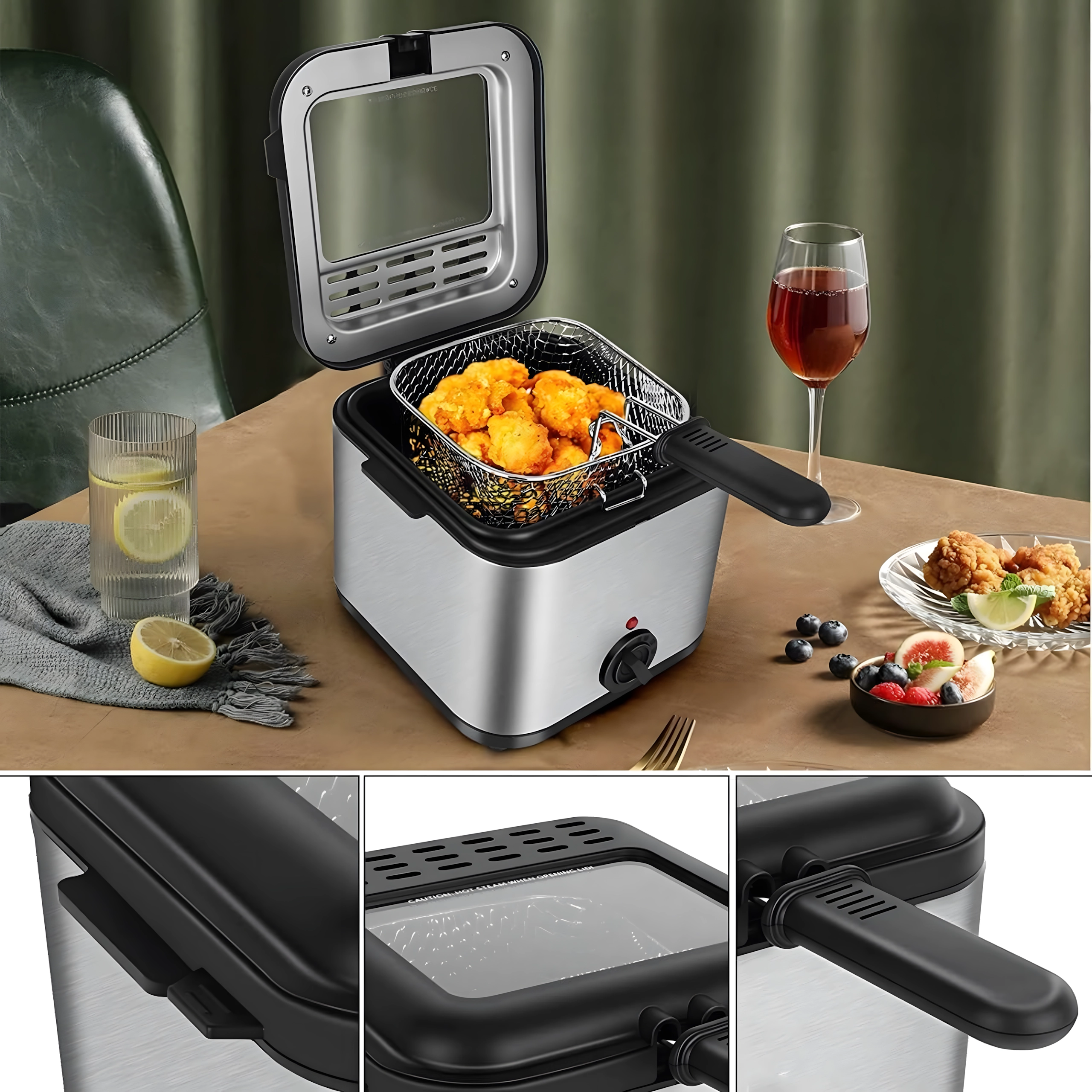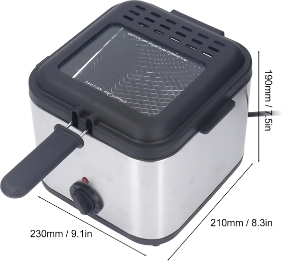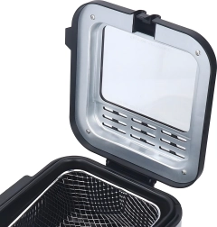 La práctica ventana en la tapa te permite controlar el proceso sin abrirla innecesariamente, lo que ayuda a mantener una temperatura de aceite estable. La potencia de 1000 W garantiza un calentamiento eficiente y resultados uniformes. La cesta extraíble con mango facilita la manipulación y el escurrido seguro del aceite.