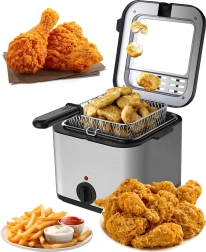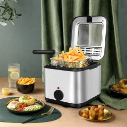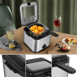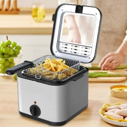 Freidora compacta de aceite con capacidad de 2,5 l para frituras en casa que ofrece una preparación rápida y uniforme de patatas fritas, pescado y otras delicias. Gracias al termostato ajustable, la ventana de visualización y la potencia de 1000 W, tendrás el proceso bajo control y lograrás excelentes resultados con un esfuerzo mínimo.