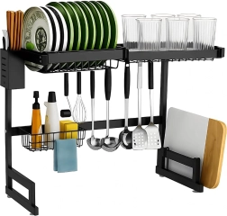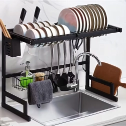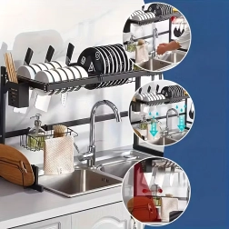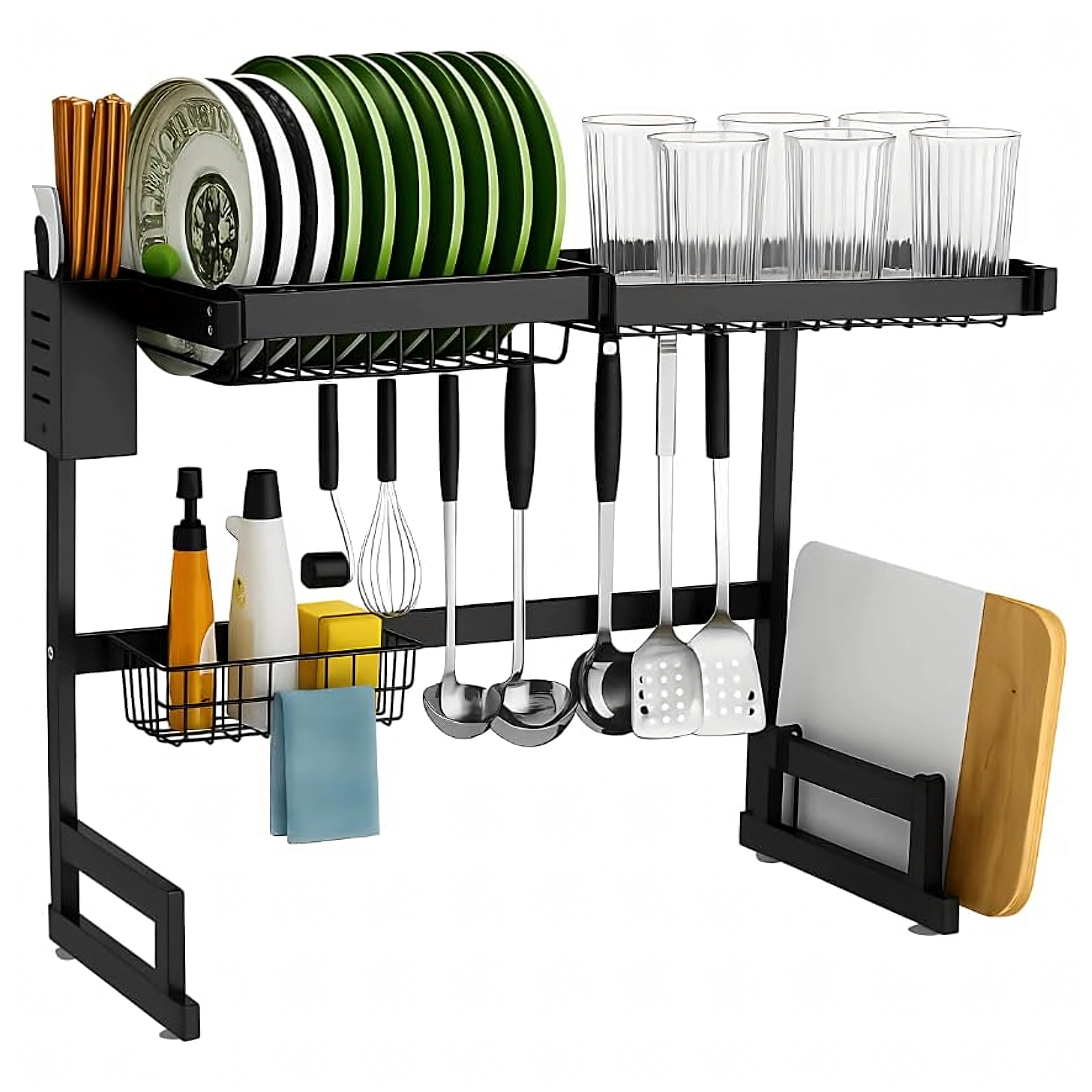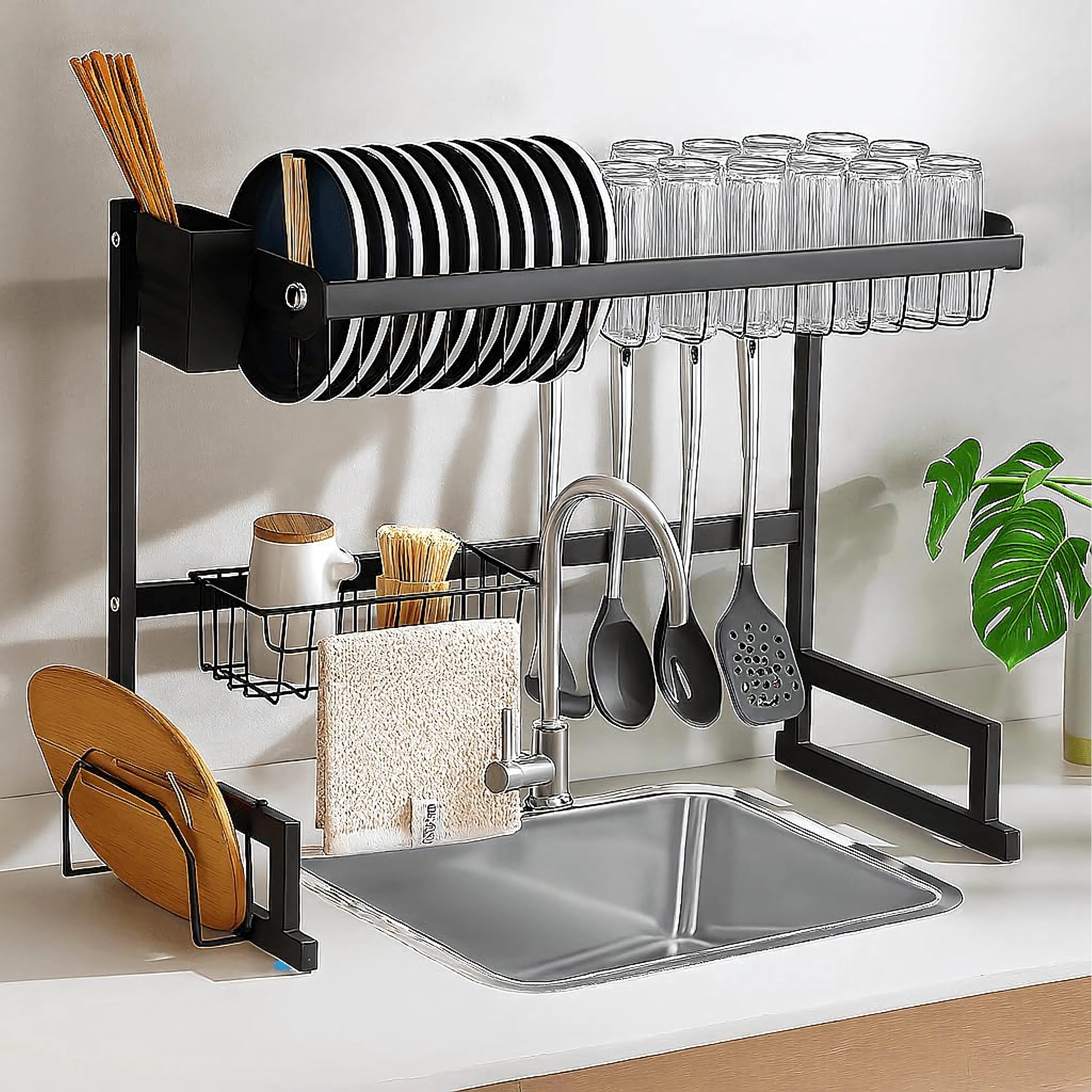 Este escurridor de dos niveles ofrece una distribución inteligente para platos, cuencos, vasos y cubiertos. Todo tiene su lugar, el agua escurre directamente al fregadero y la superficie de trabajo permanece seca y limpia. El robusto acero con recubrimiento en polvo garantiza una larga vida útil y un aspecto elegante para cualquier cocina moderna.