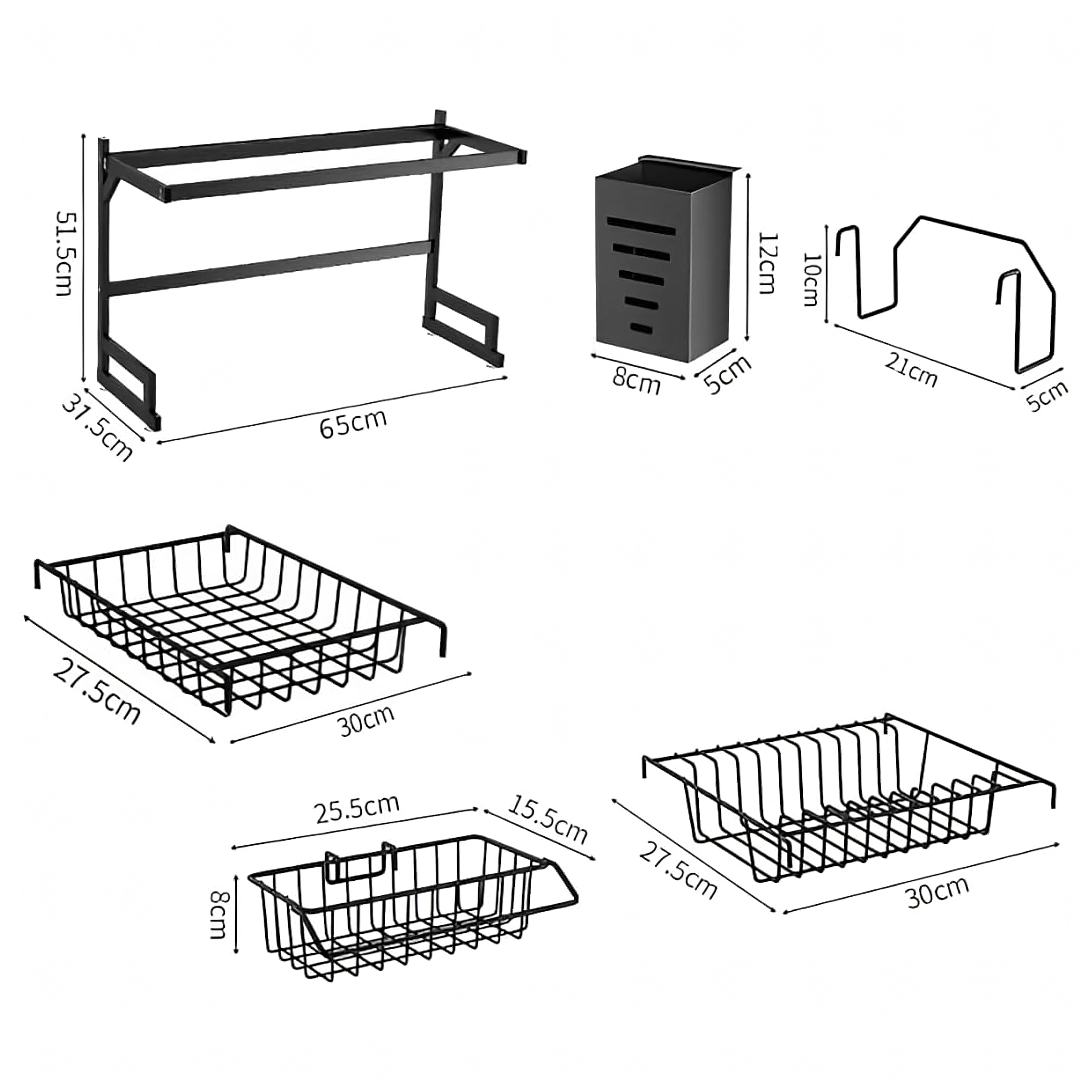 Nivel superior para platos y cuencos, cestas inferiores para vasos y utensilios. El agua escurre directamente al fregadero, la encimera permanece seca y ordenada.