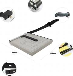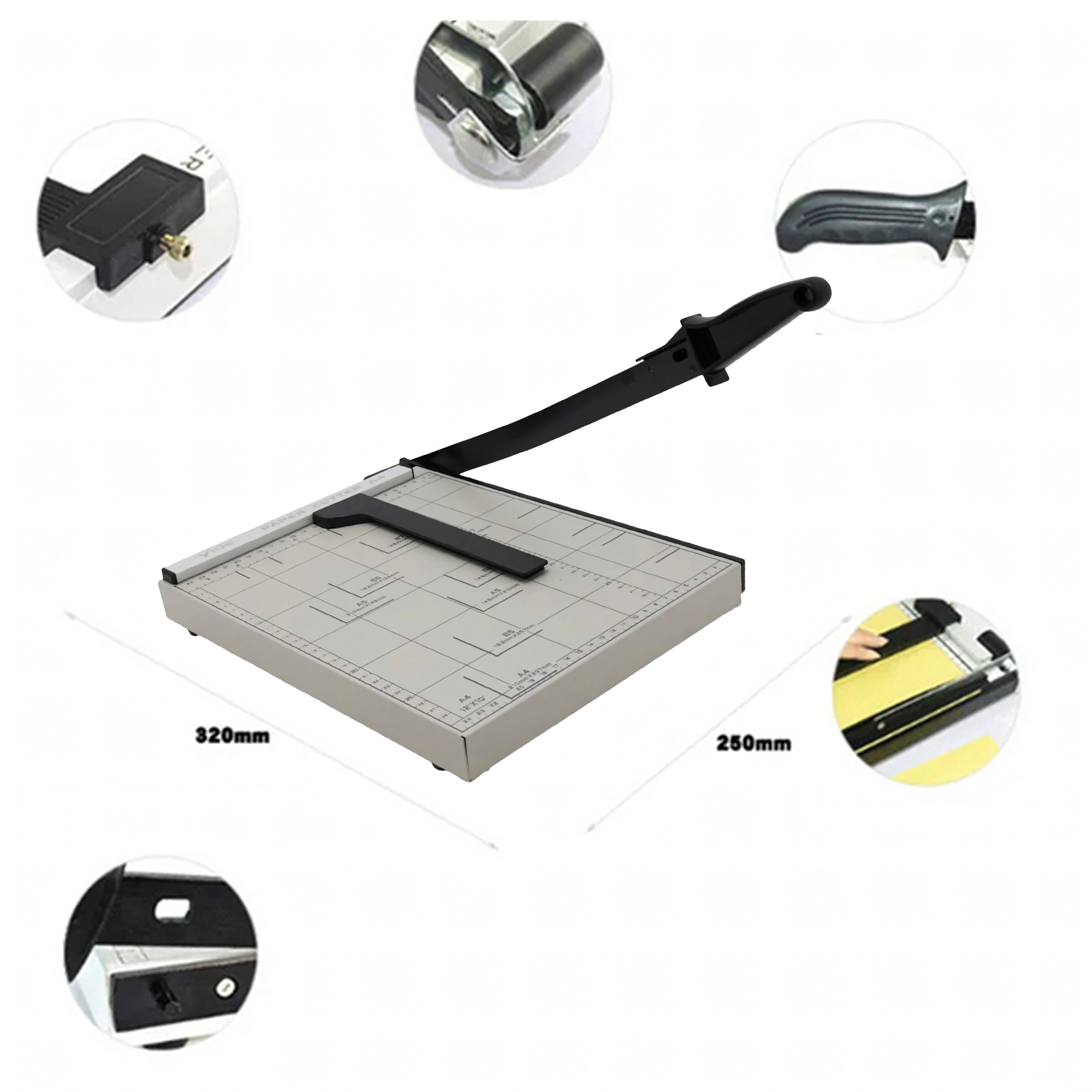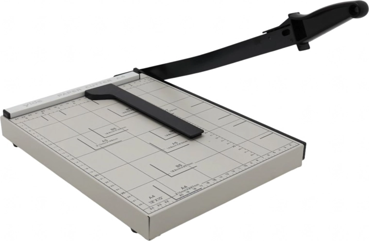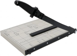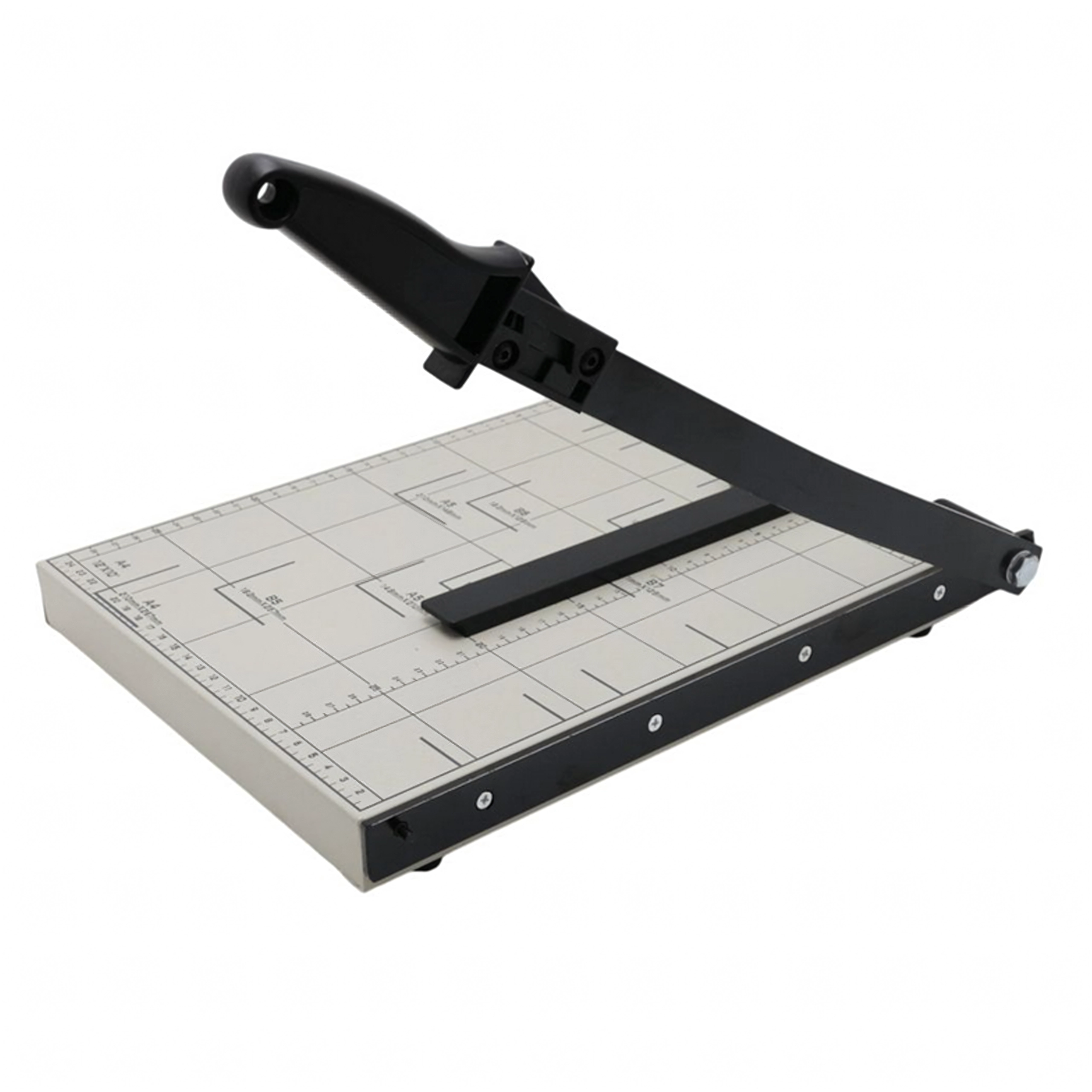 Esta guillotina resistente permite cortes seguros y rectos gracias a la rejilla de medición precisa y a las marcas guía de formato (A4, A5, B5, etc.). La robusta estructura metálica y la palanca con empuñadura cómoda aseguran un funcionamiento fluido y resultados consistentes al recortar documentos, fotografías o materiales para presentaciones.