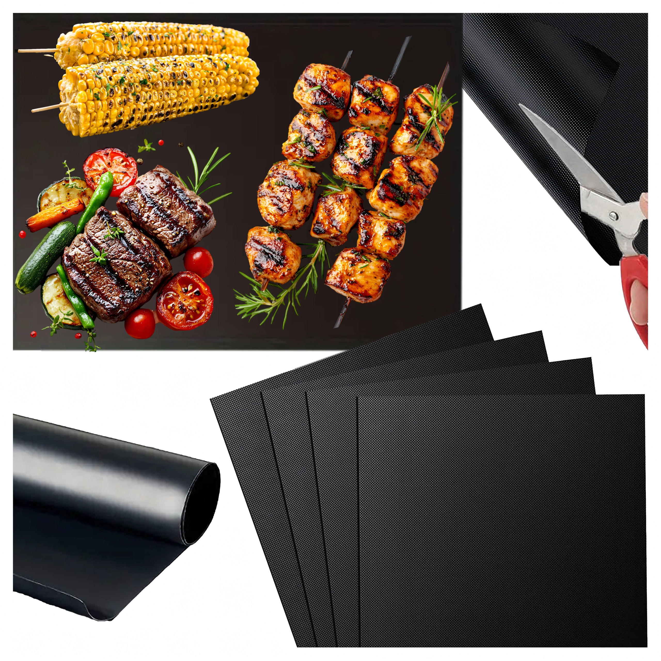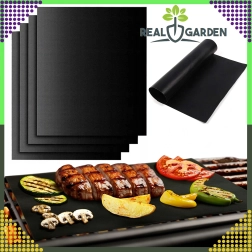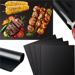 Práctica alfombrilla de teflón para parrilla y horno en juego de 4 unidades que facilita la preparación de alimentos sin que se peguen y sin grasa. Es antiadherente, fácil de limpiar, sin PFOA y apta para uso repetido hasta 260 °C. Ideal para carnes, pescados, verduras y frutas, y mantiene limpia la parrilla y el horno.