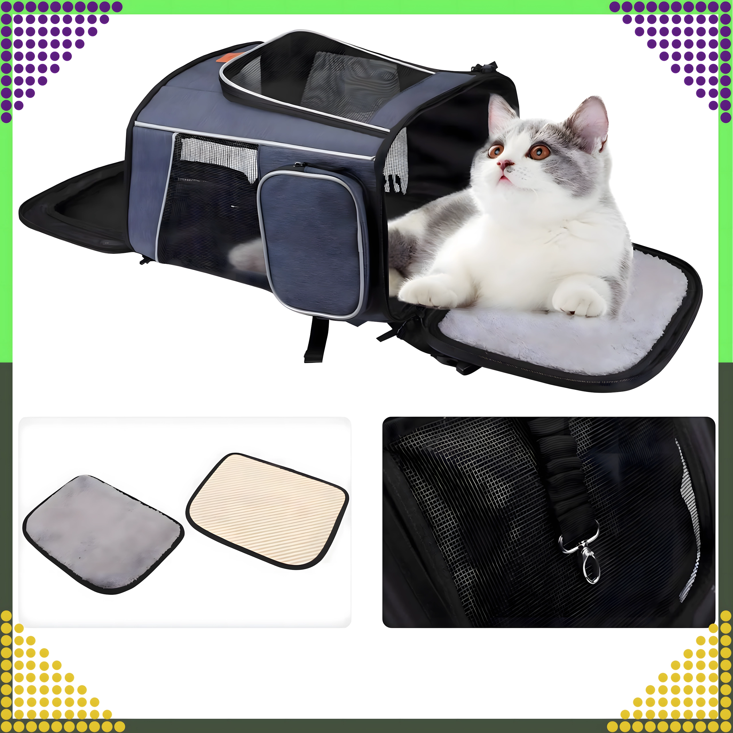 La puerta frontal con cremallera se despliega a modo de rampa, la base blanda extraíble y los bolsillos laterales facilitan cada viaje.