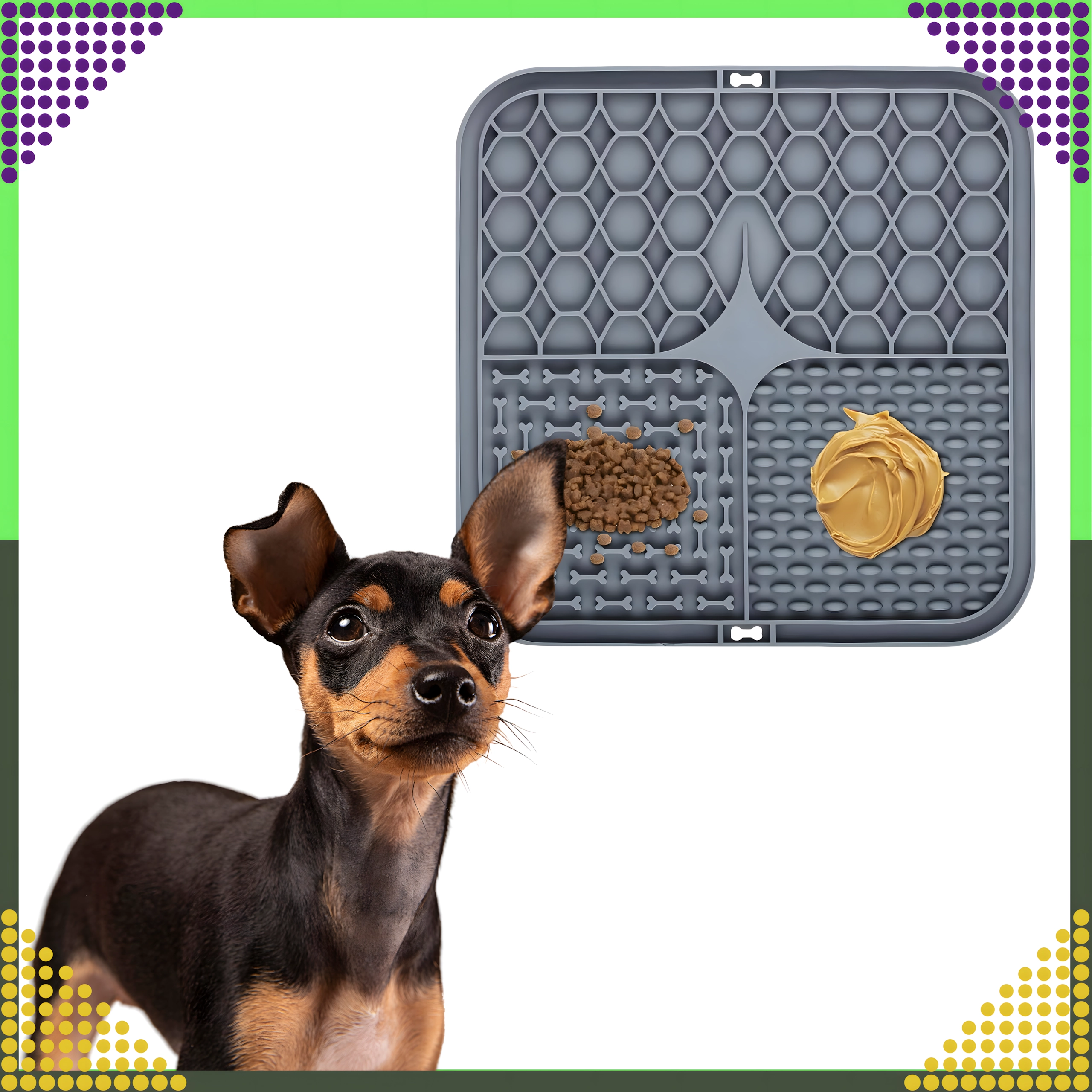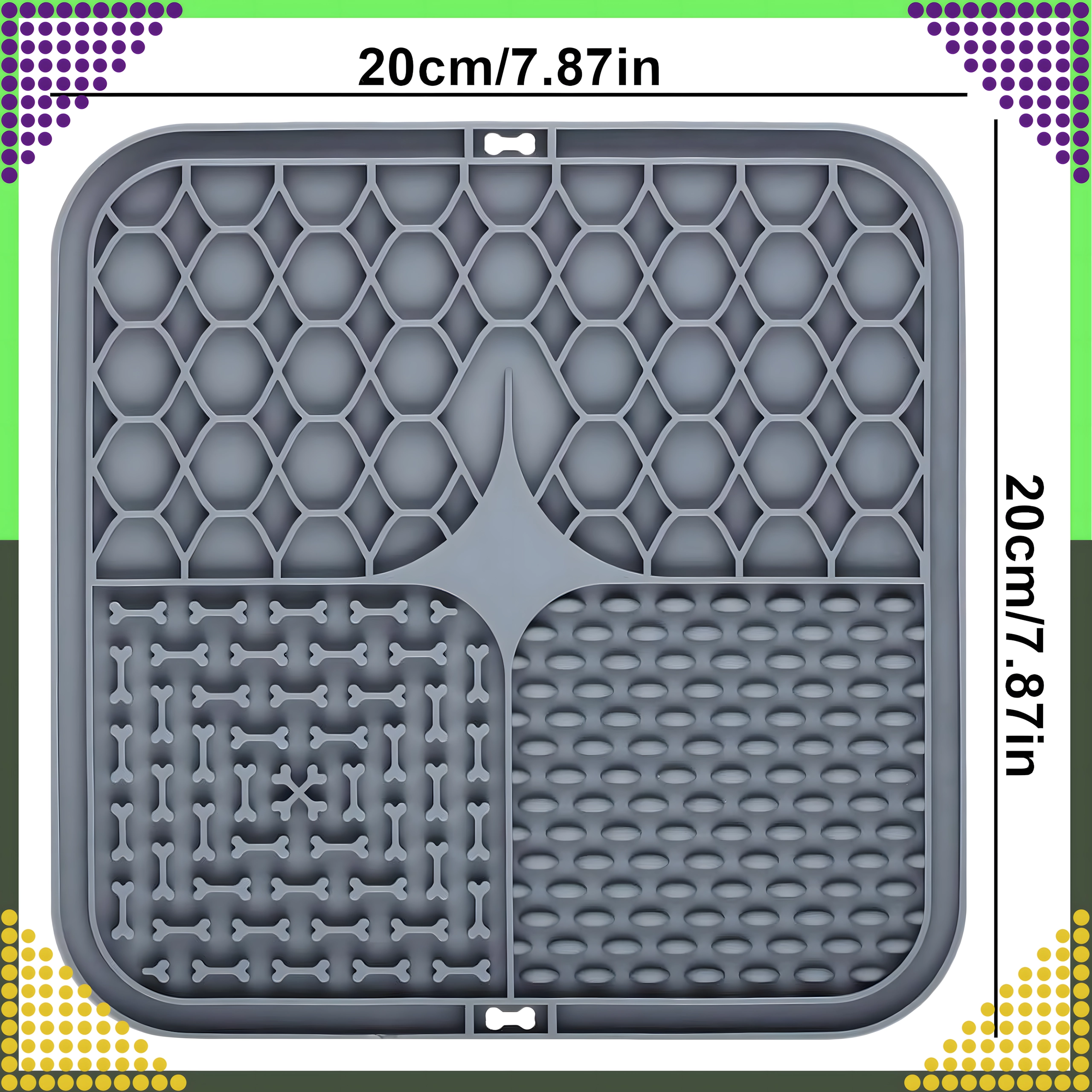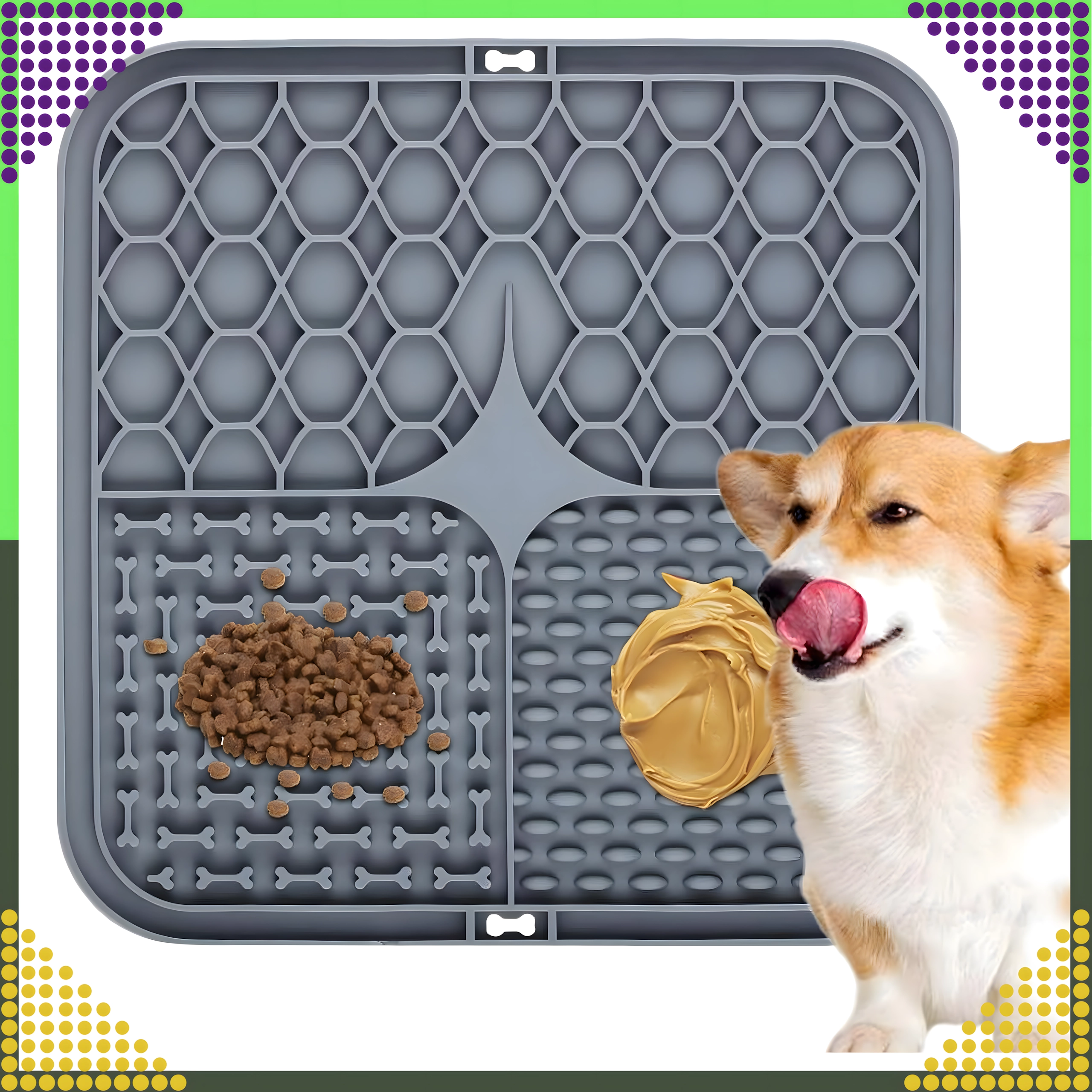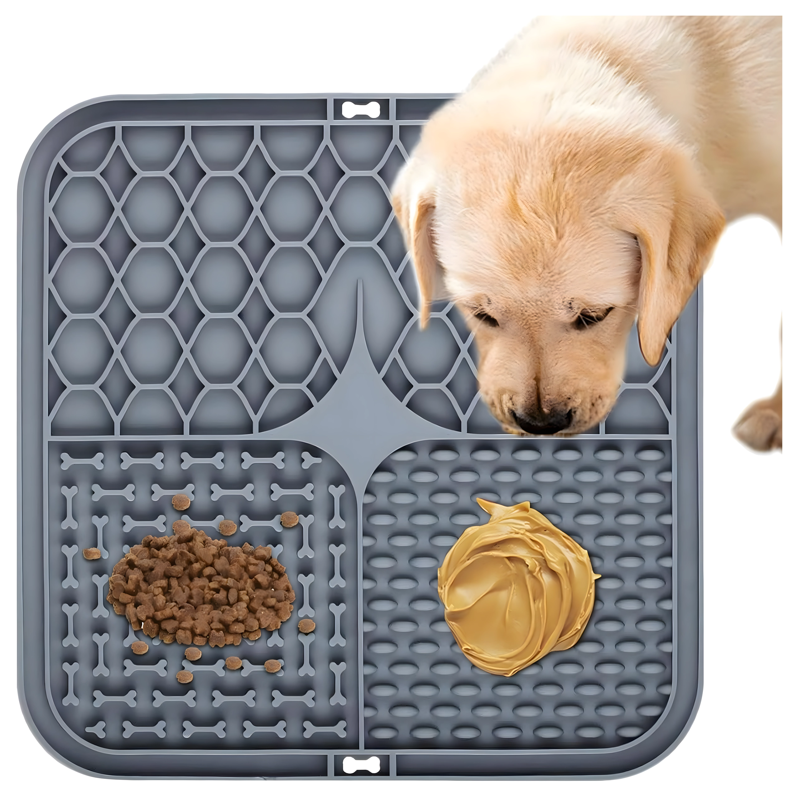Práctica alfombra de lamido de silicona para perros y gatos que ralentiza la alimentación, ayuda a reducir el estrés y favorece la higiene bucal. Gracias a sus diferentes texturas y a las ventosas en la parte posterior, se mantiene estable y divertida. Reduce el engullido, disminuye la ansiedad y limpia la lengua con el uso diario.