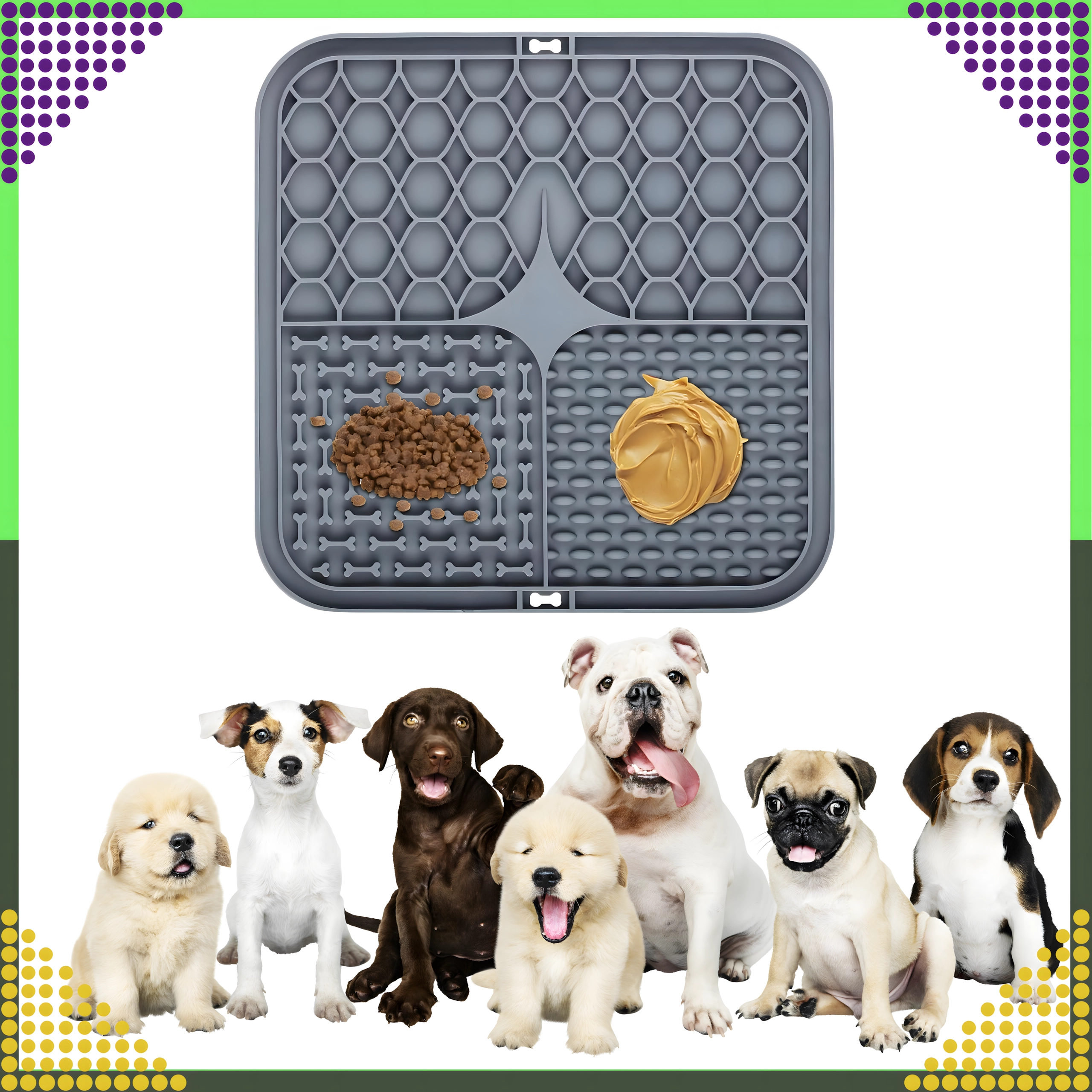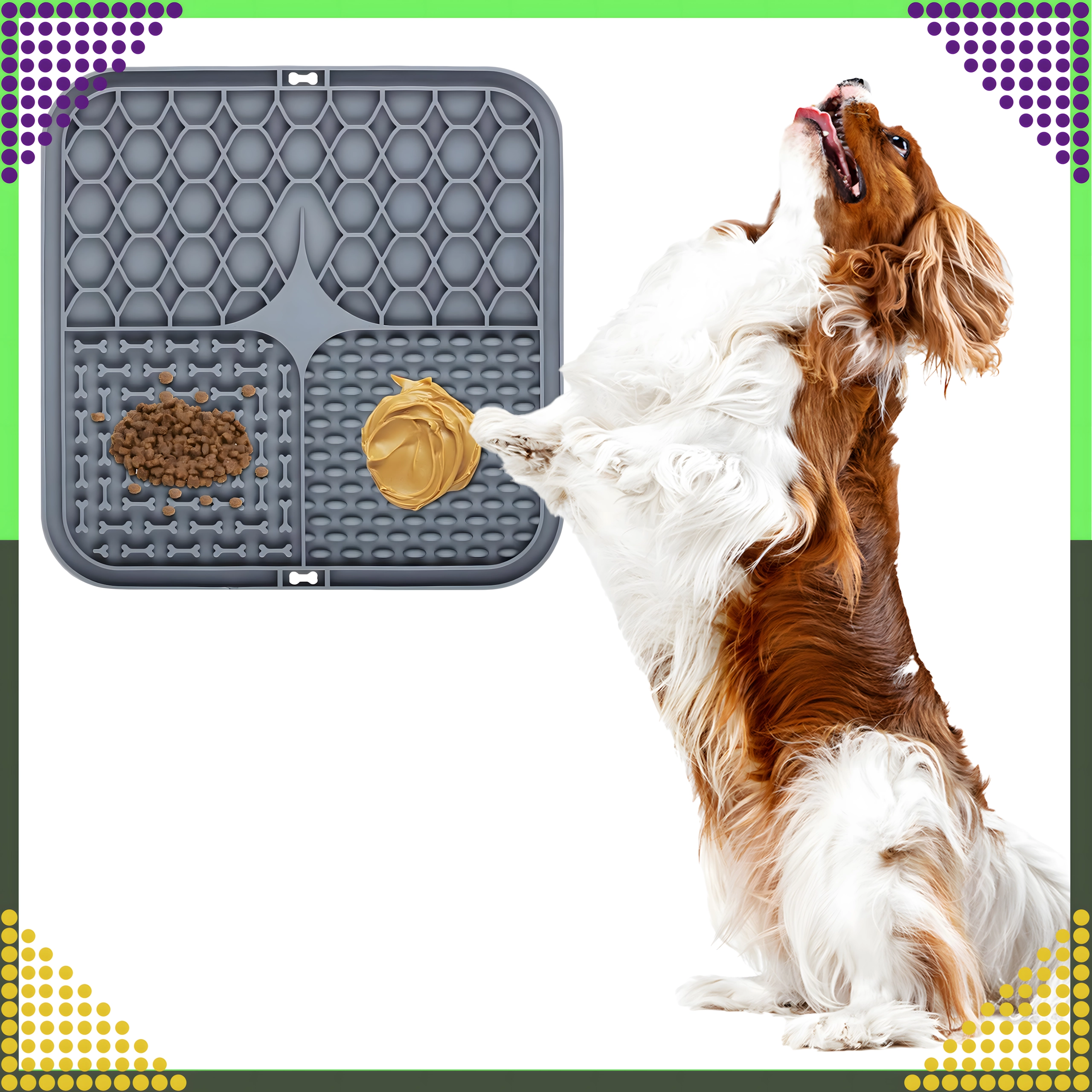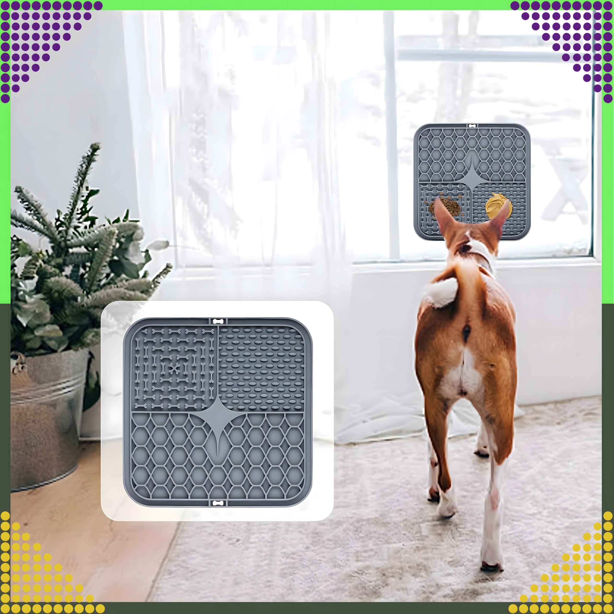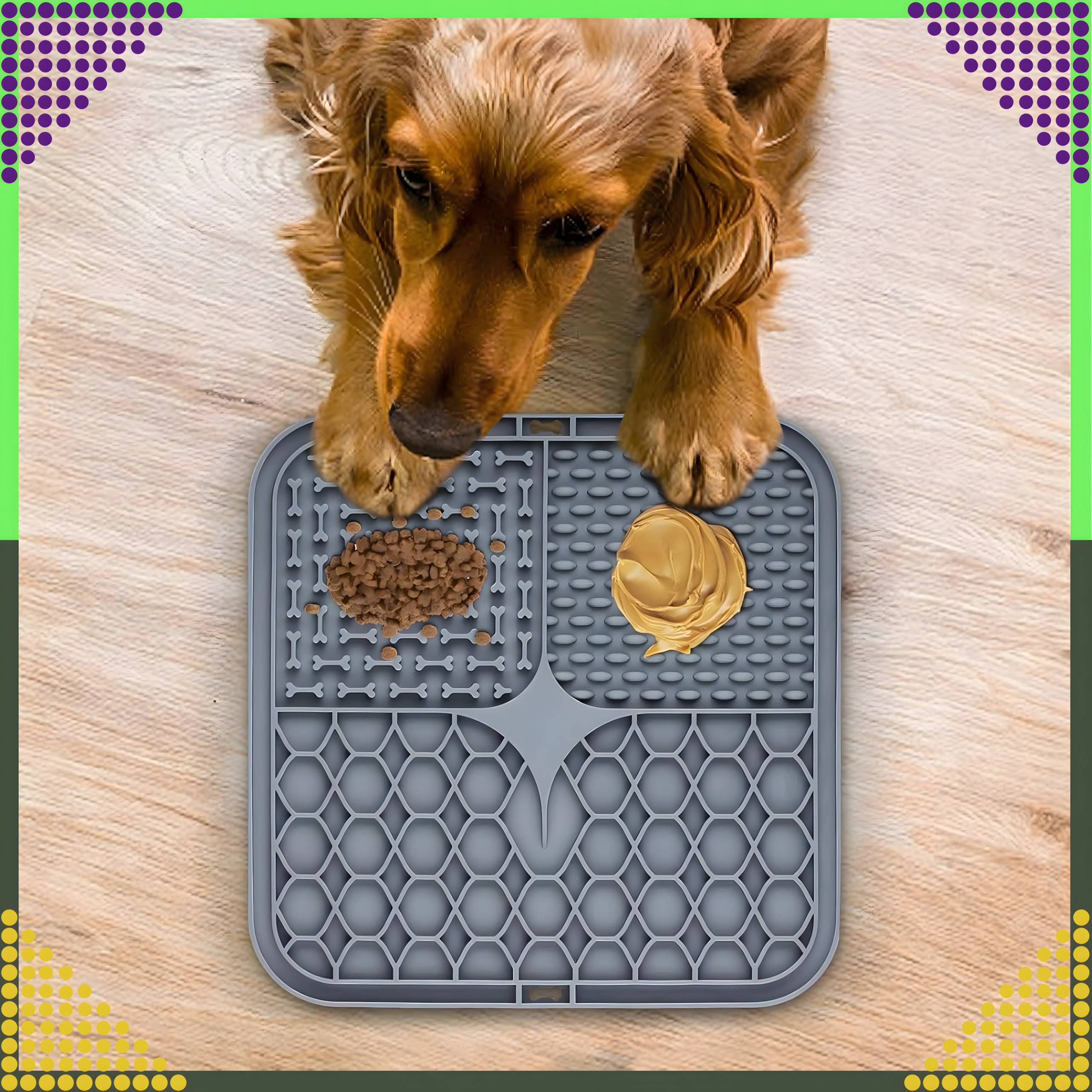 Práctica alfombra de lamido de silicona para perros y gatos que ralentiza la alimentación, ayuda a reducir el estrés y favorece la higiene bucal. Gracias a sus diferentes texturas y a las ventosas en la parte posterior, se mantiene estable y divertida. Reduce el engullido, disminuye la ansiedad y limpia la lengua con el uso diario.