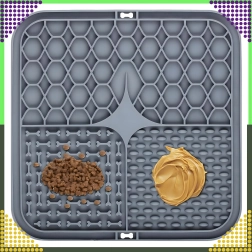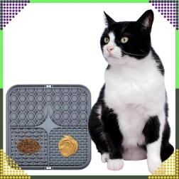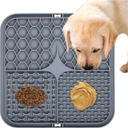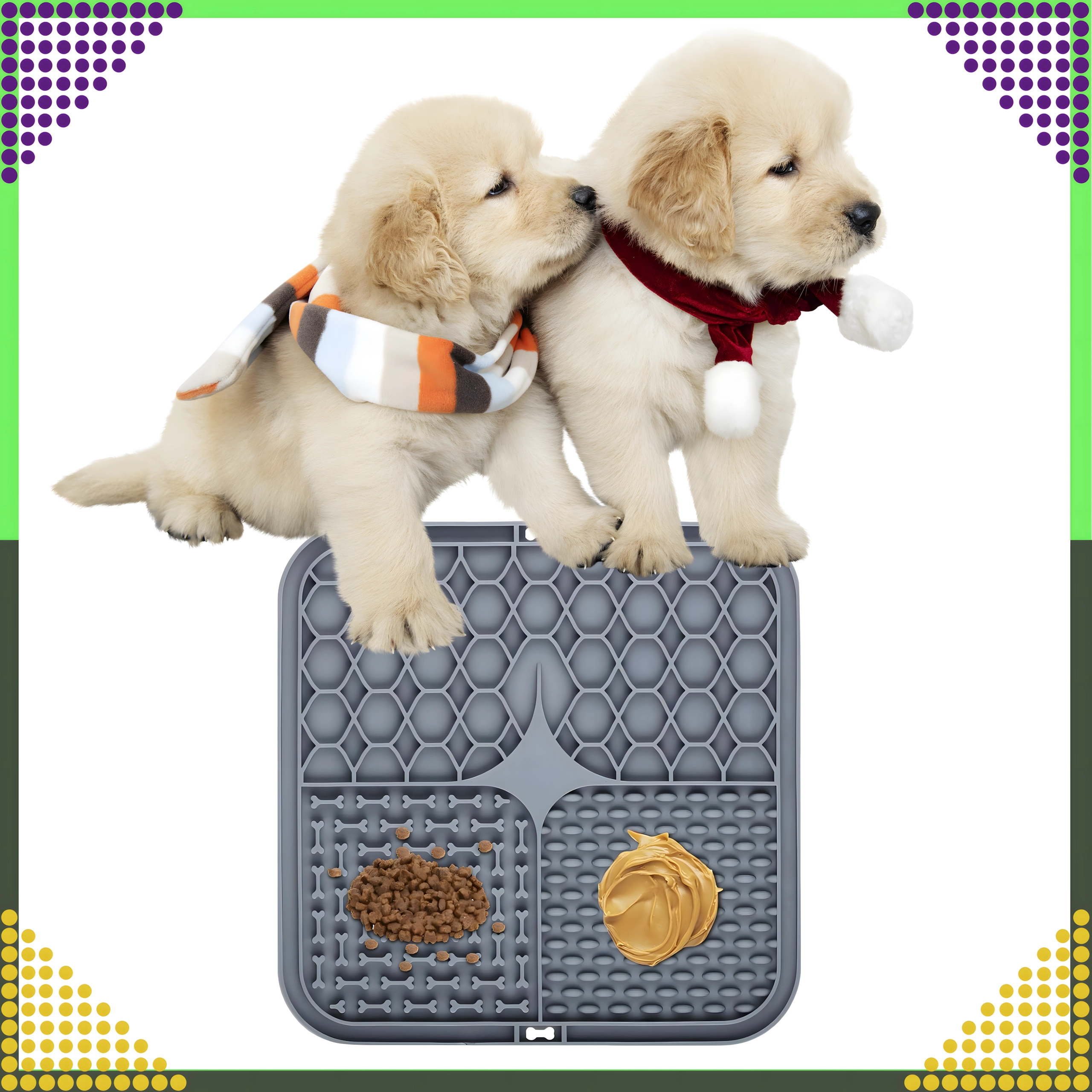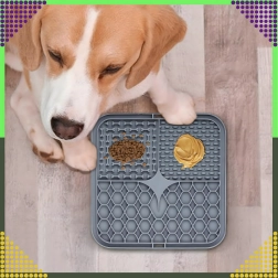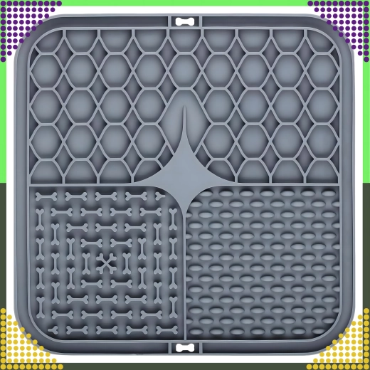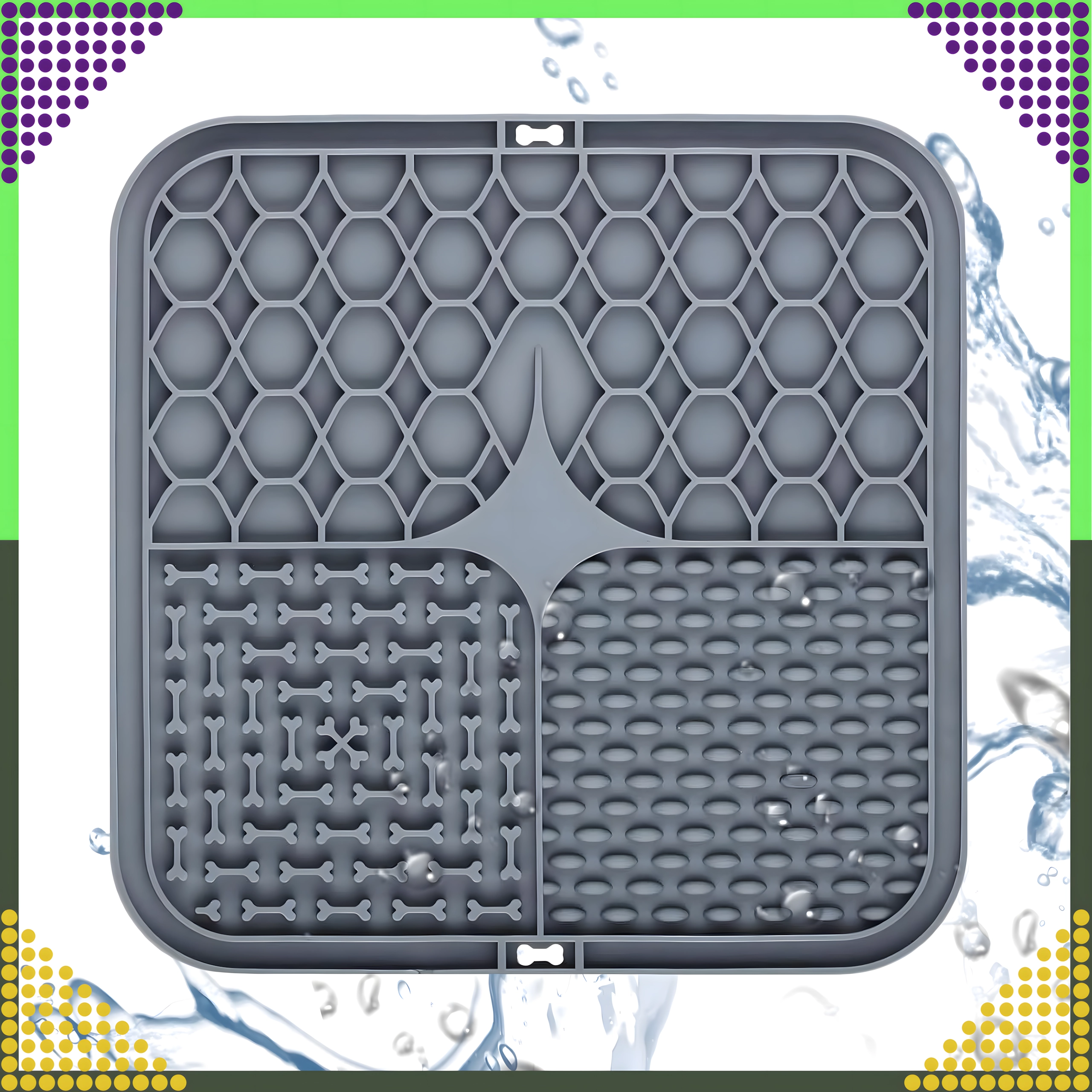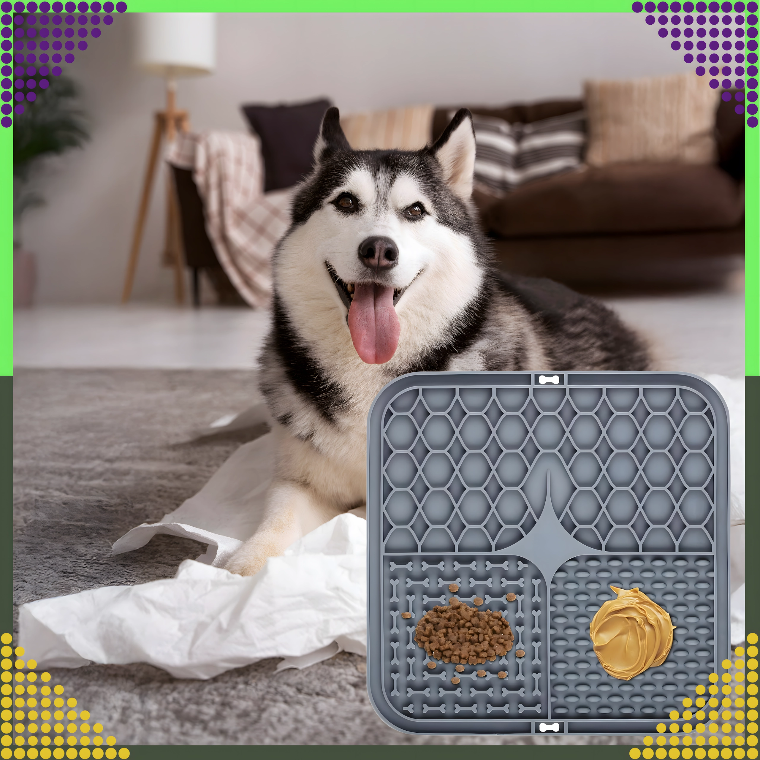 Práctica alfombra de lamido de silicona para perros y gatos que ralentiza la alimentación, ayuda a reducir el estrés y favorece la higiene bucal. Gracias a sus diferentes texturas y a las ventosas en la parte posterior, se mantiene estable y divertida. Reduce el engullido, disminuye la ansiedad y limpia la lengua con el uso diario.