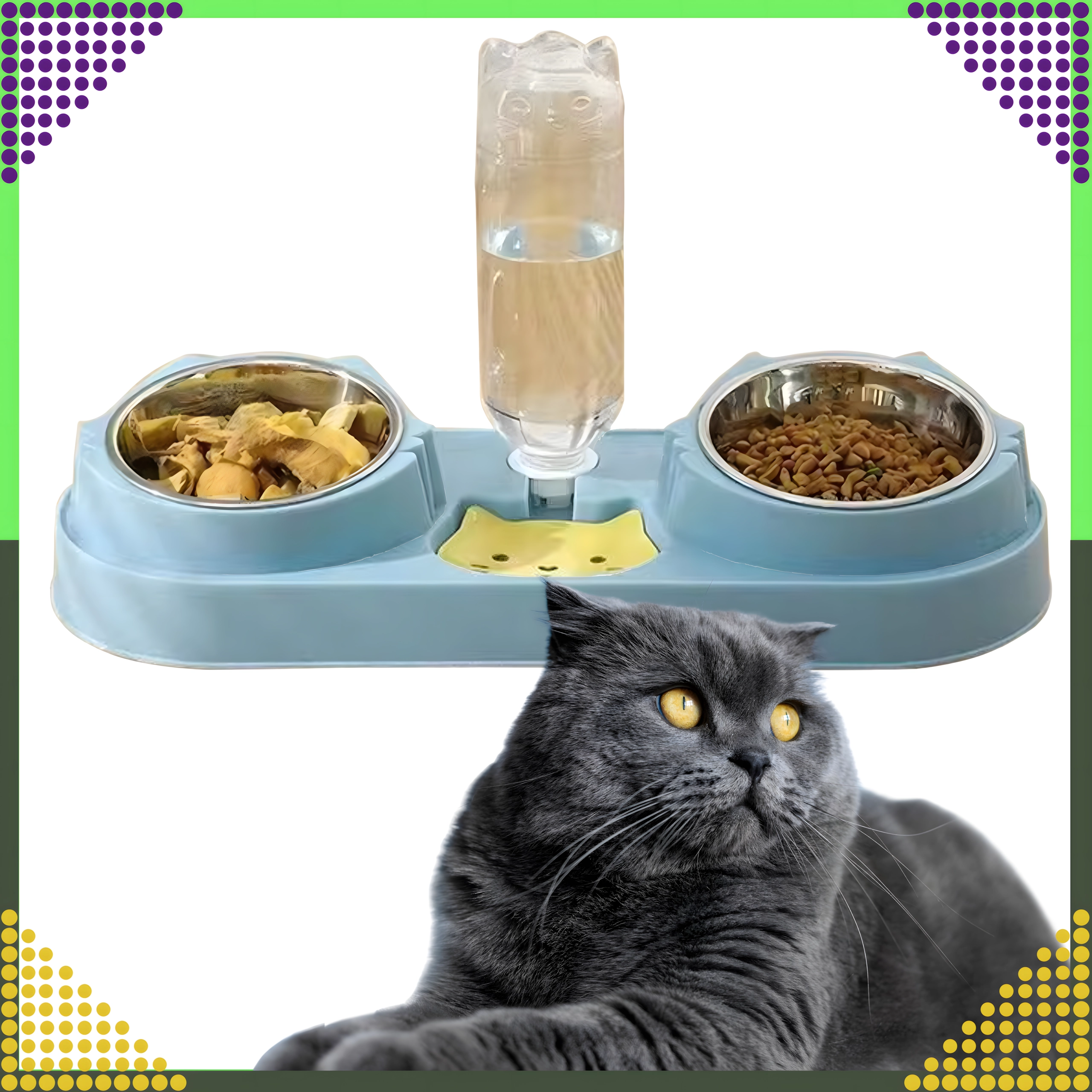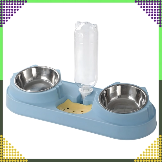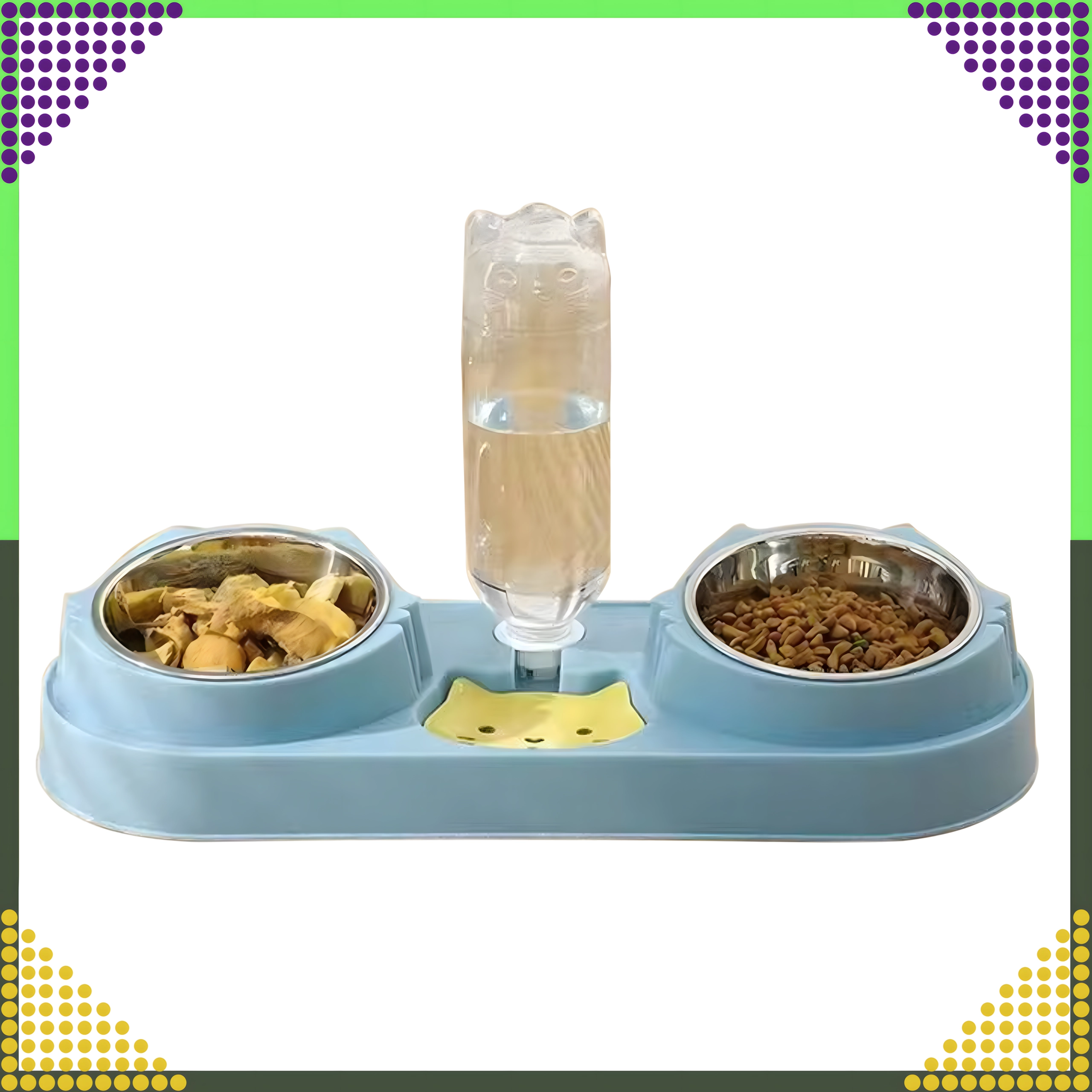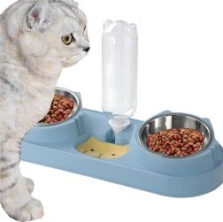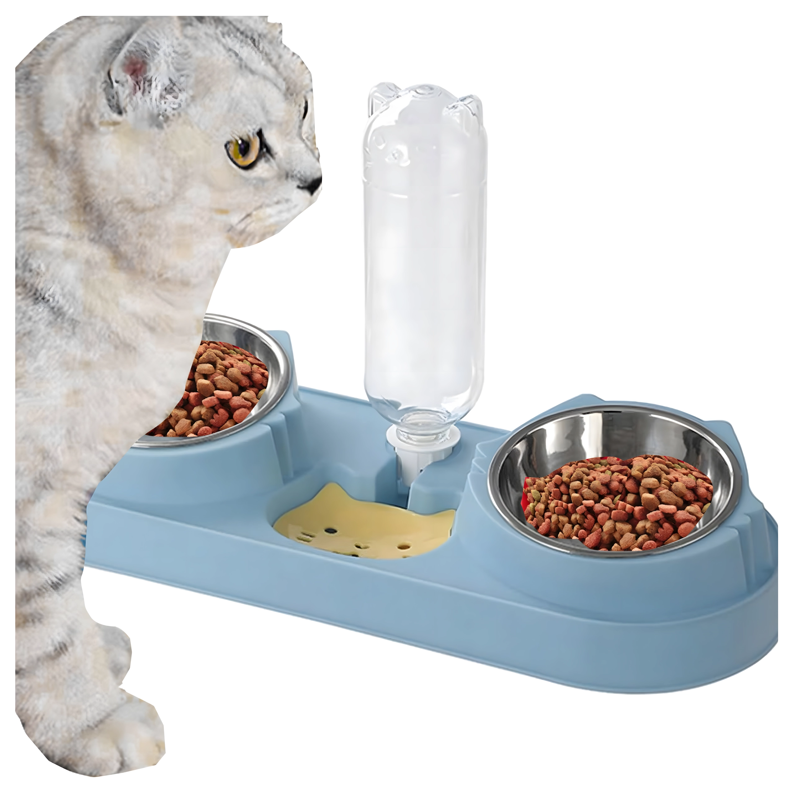 Este cuenco doble con bebedero automático es ideal para perros y gatos. Dos cuencos extraíbles de acero inoxidable (cada uno con capacidad de 220 ml) permiten servir por separado comida húmeda y seca, mientras que el dispensador por gravedad repone continuamente el depósito de agua. La base de plástico resistente en un elegante color azul es estable y de fácil mantenimiento.