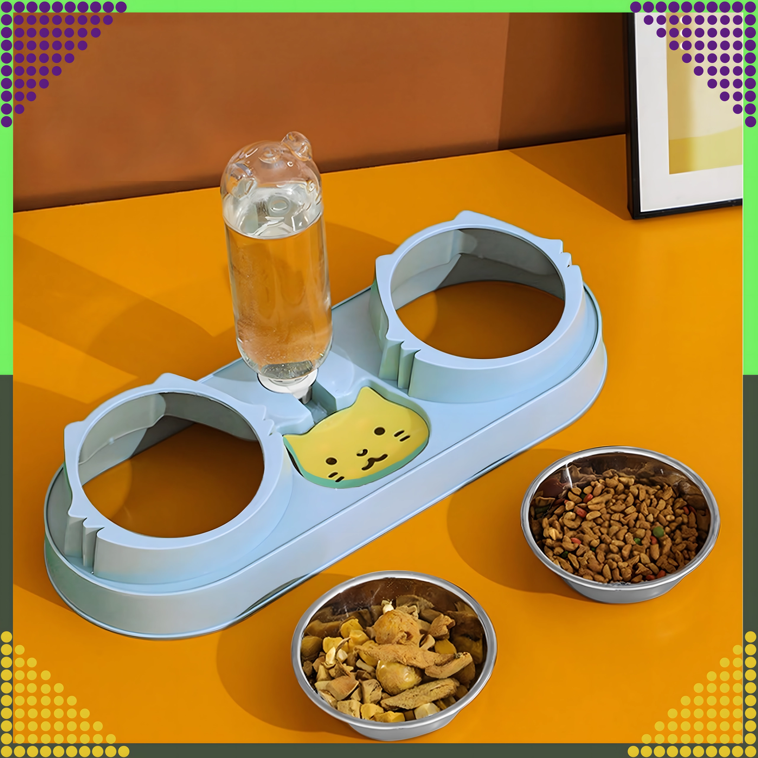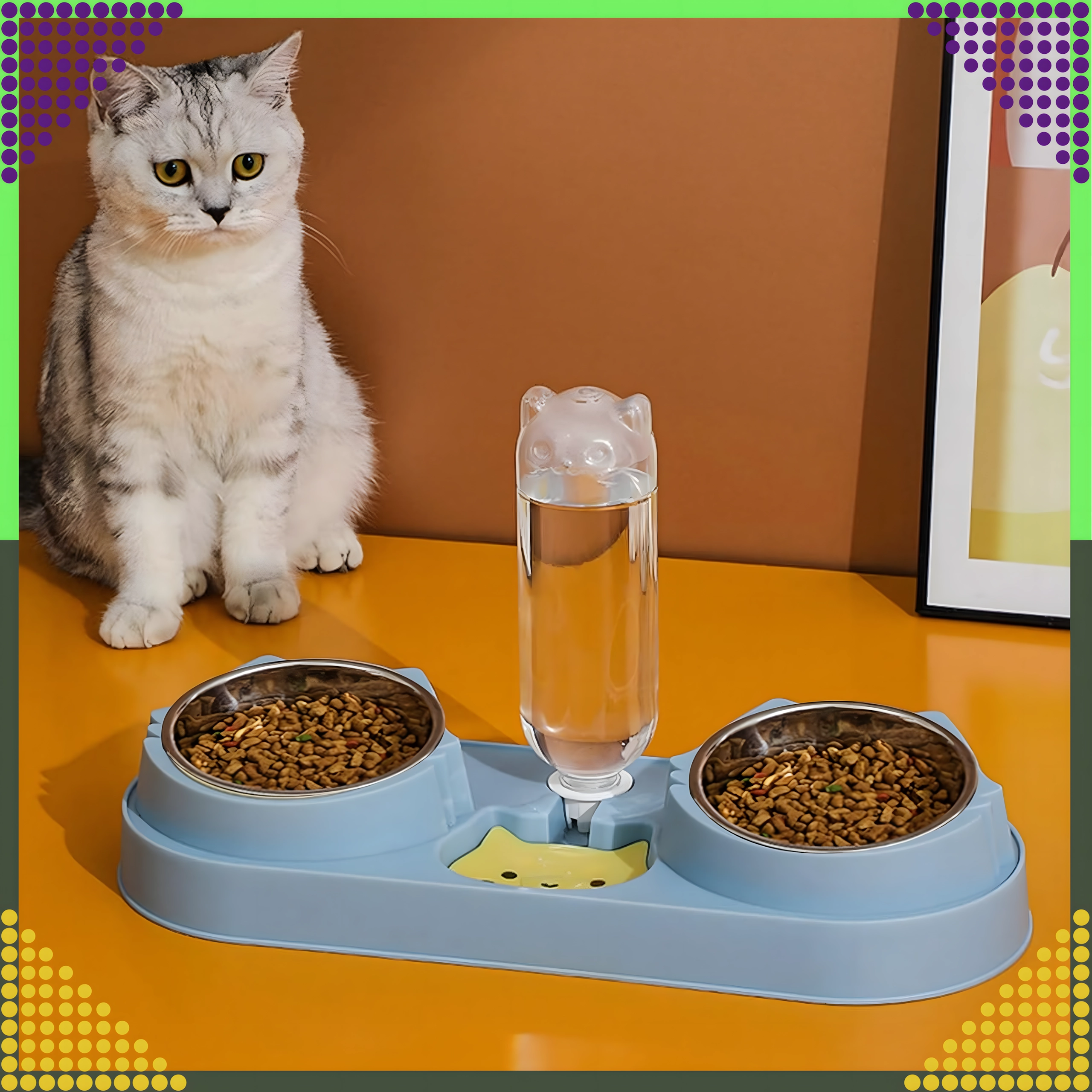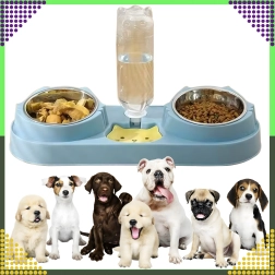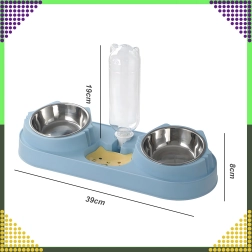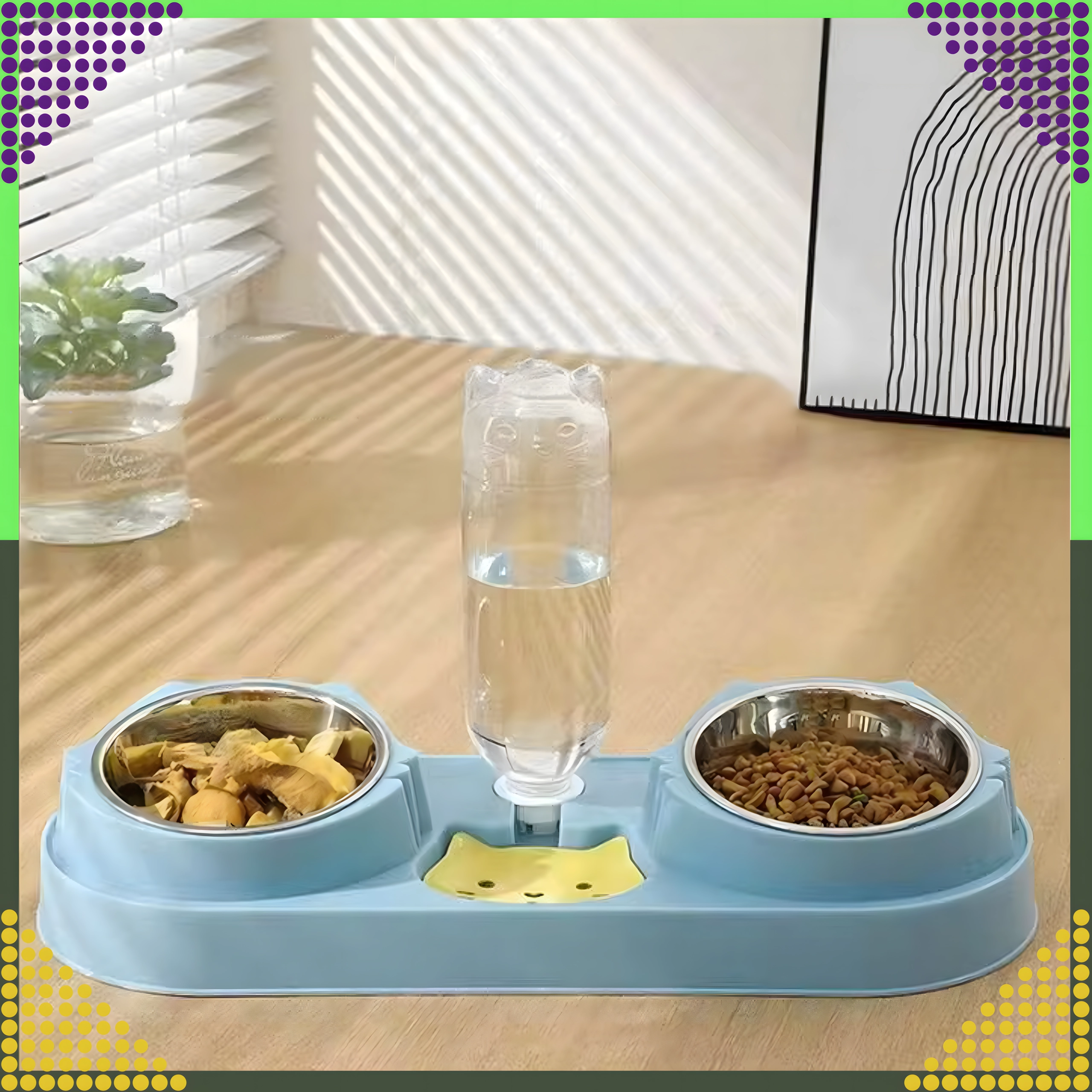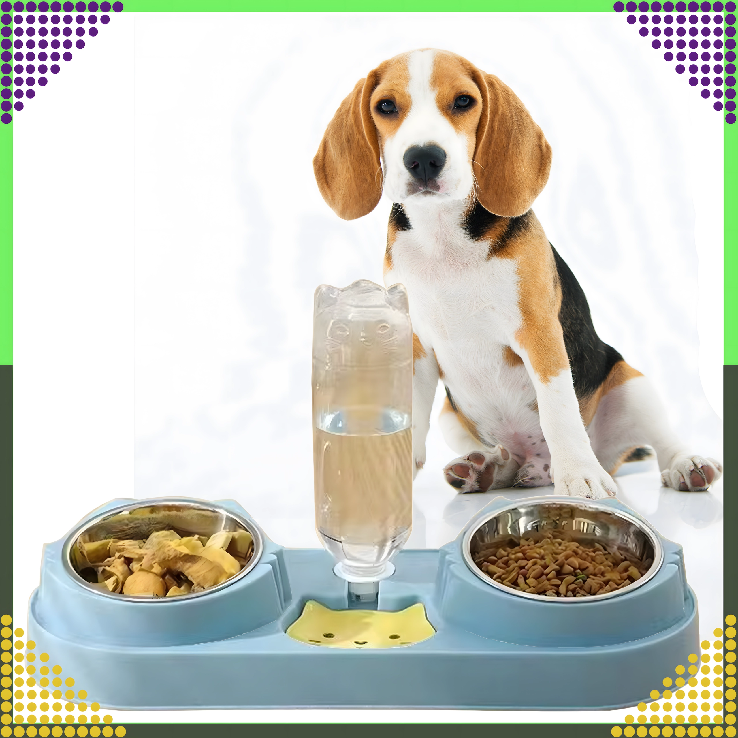 Este cuenco doble con bebedero automático es ideal para perros y gatos. Dos cuencos extraíbles de acero inoxidable (cada uno con capacidad de 220 ml) permiten servir por separado comida húmeda y seca, mientras que el dispensador por gravedad repone continuamente el depósito de agua. La base de plástico resistente en un elegante color azul es estable y de fácil mantenimiento.