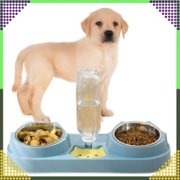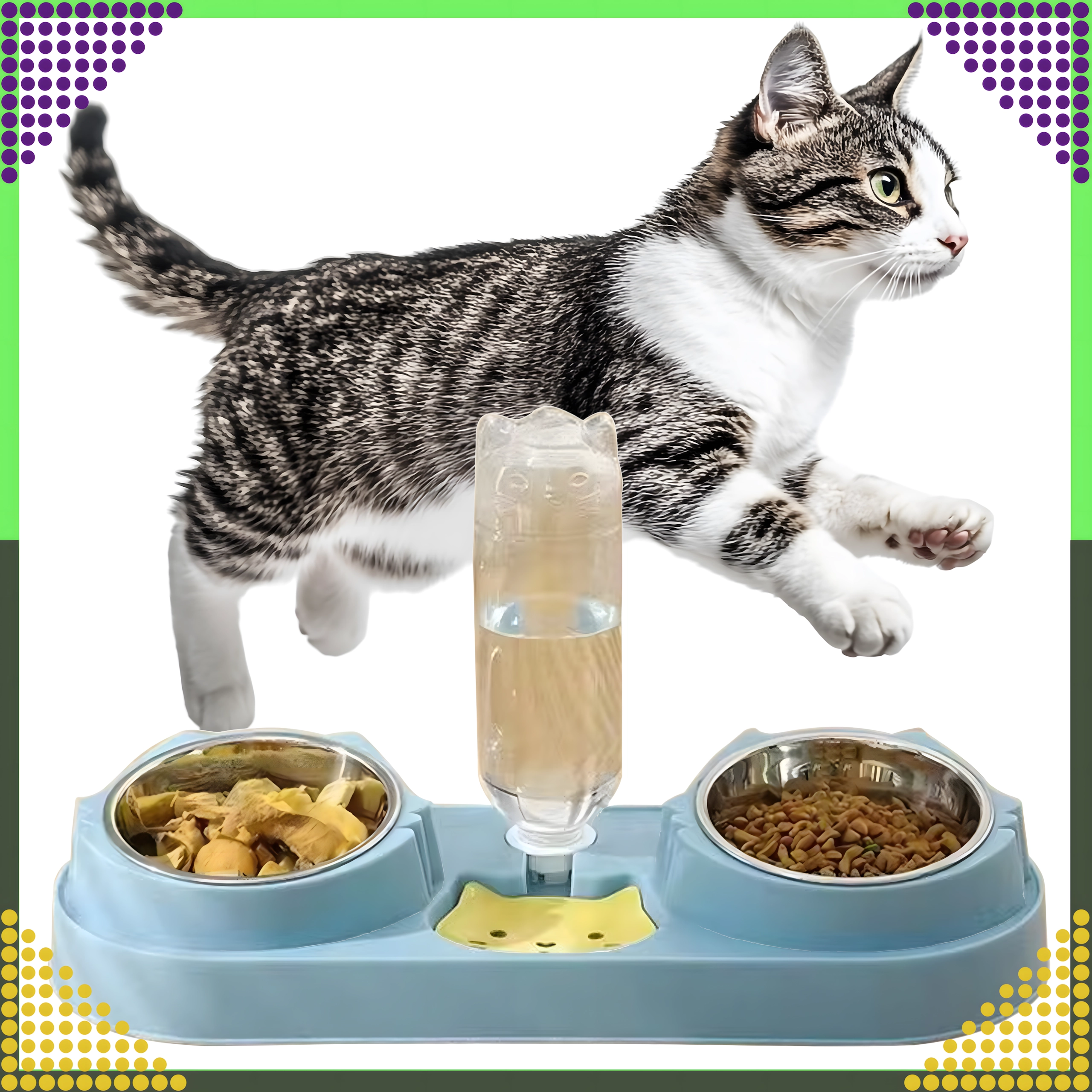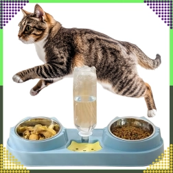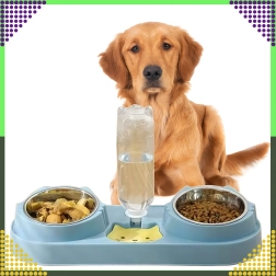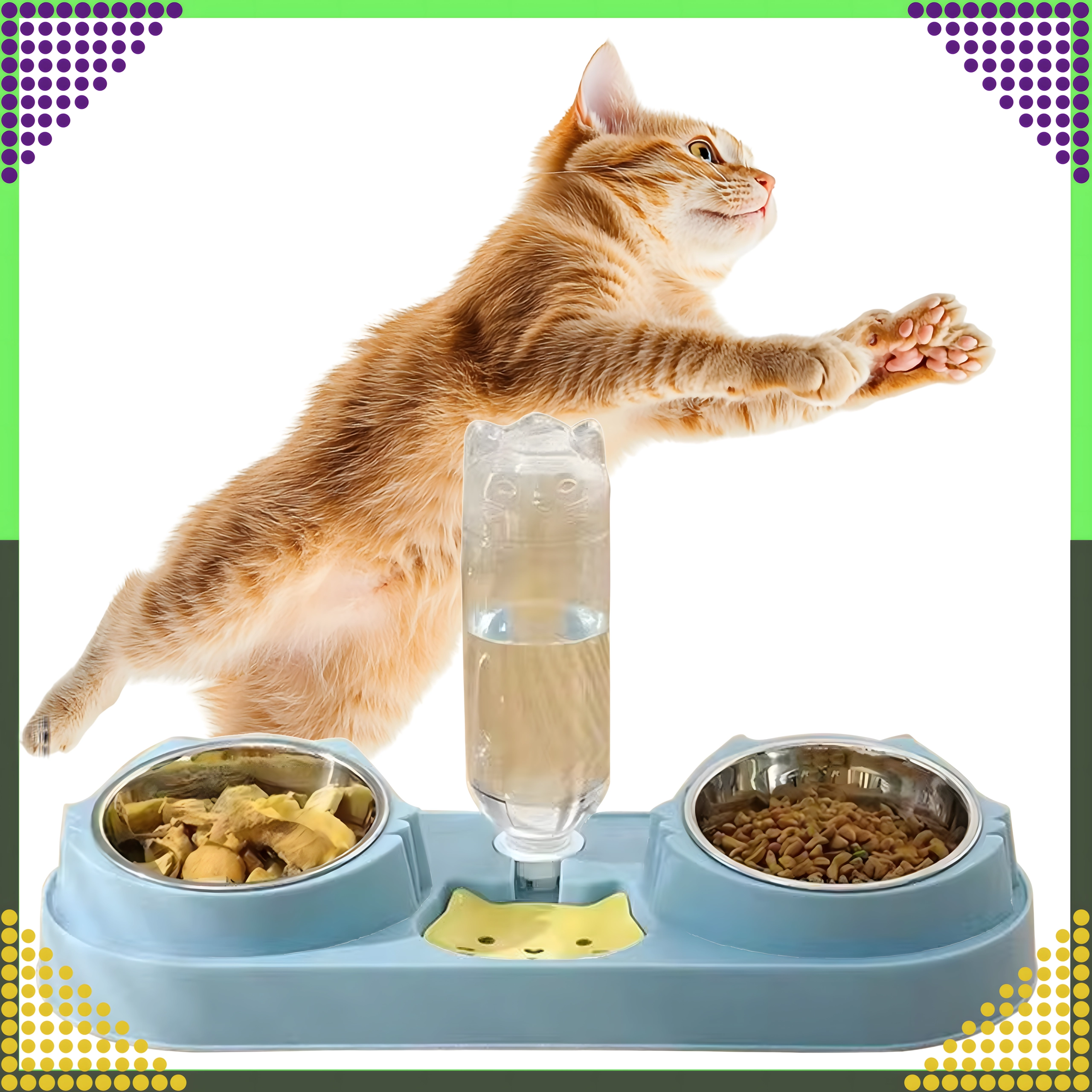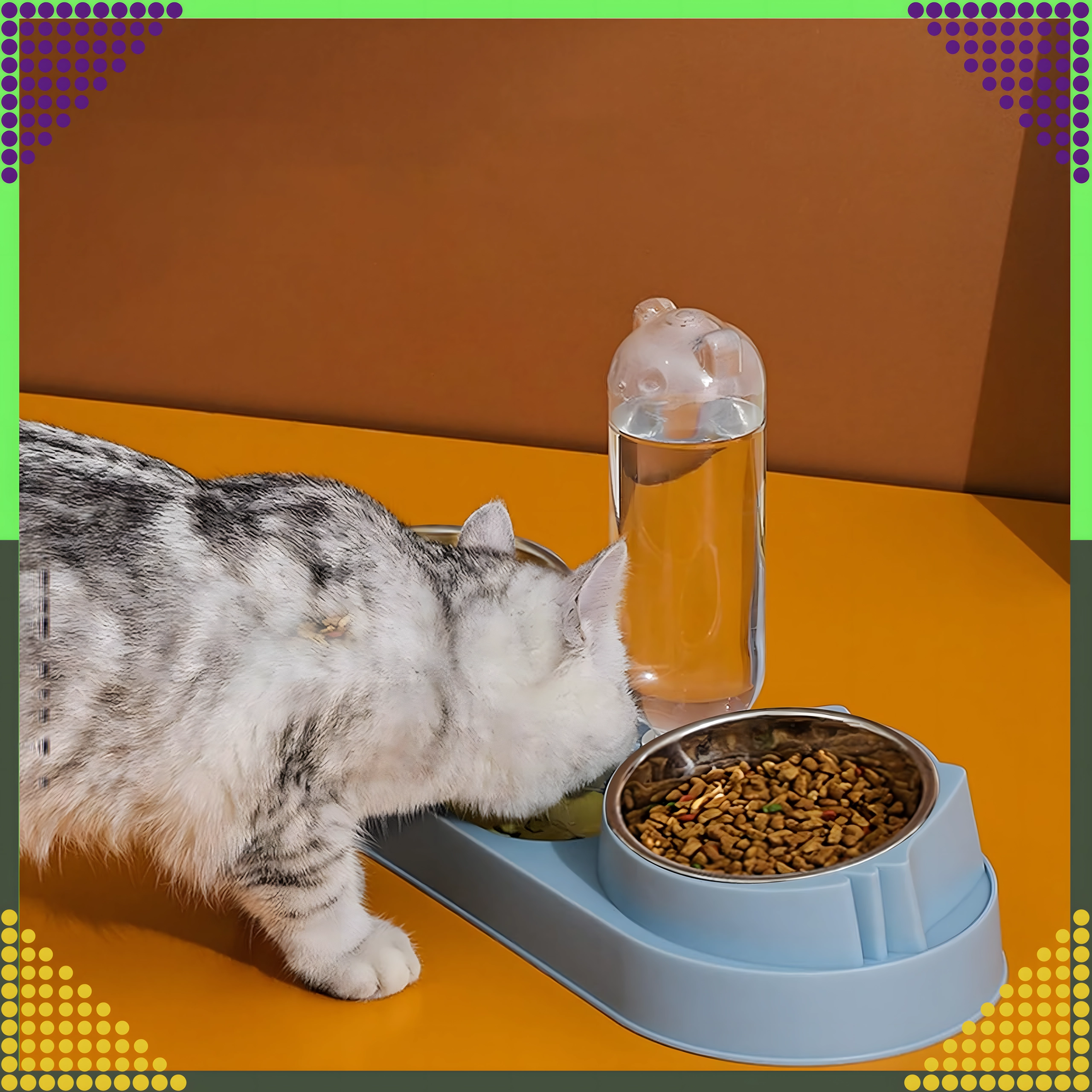 Este cuenco doble con bebedero automático es ideal para perros y gatos. Dos cuencos extraíbles de acero inoxidable (cada uno con capacidad de 220 ml) permiten servir por separado comida húmeda y seca, mientras que el dispensador por gravedad repone continuamente el depósito de agua. La base de plástico resistente en un elegante color azul es estable y de fácil mantenimiento.