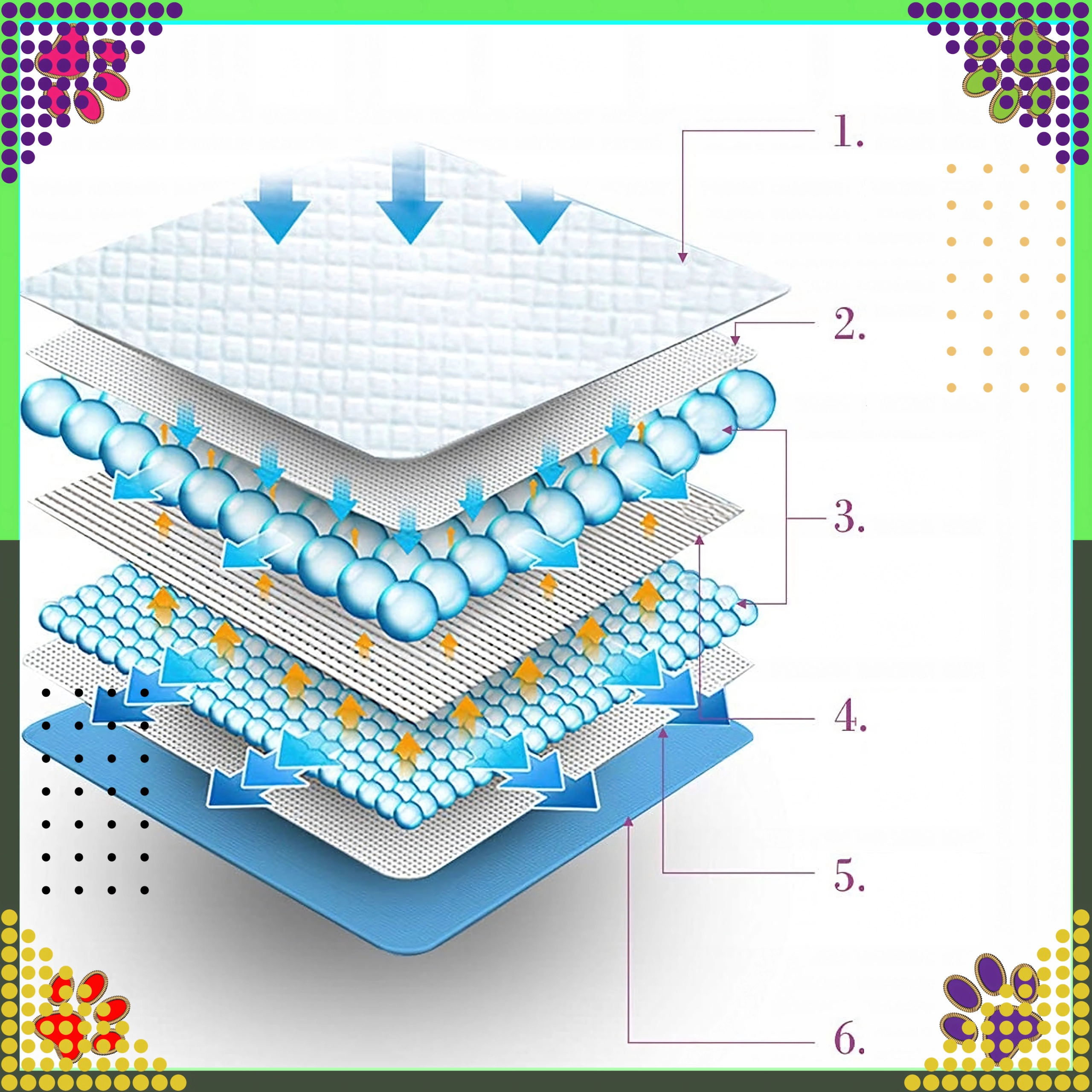 Las almohadillas con núcleo multicapa distribuyen eficazmente el líquido y lo absorben al instante. La lámina inferior impermeable evita de forma fiable el traspaso, mientras que la superficie suave es amable con las patas. No se deslaminan, son cómodas y tras usarlas basta con desecharlas.