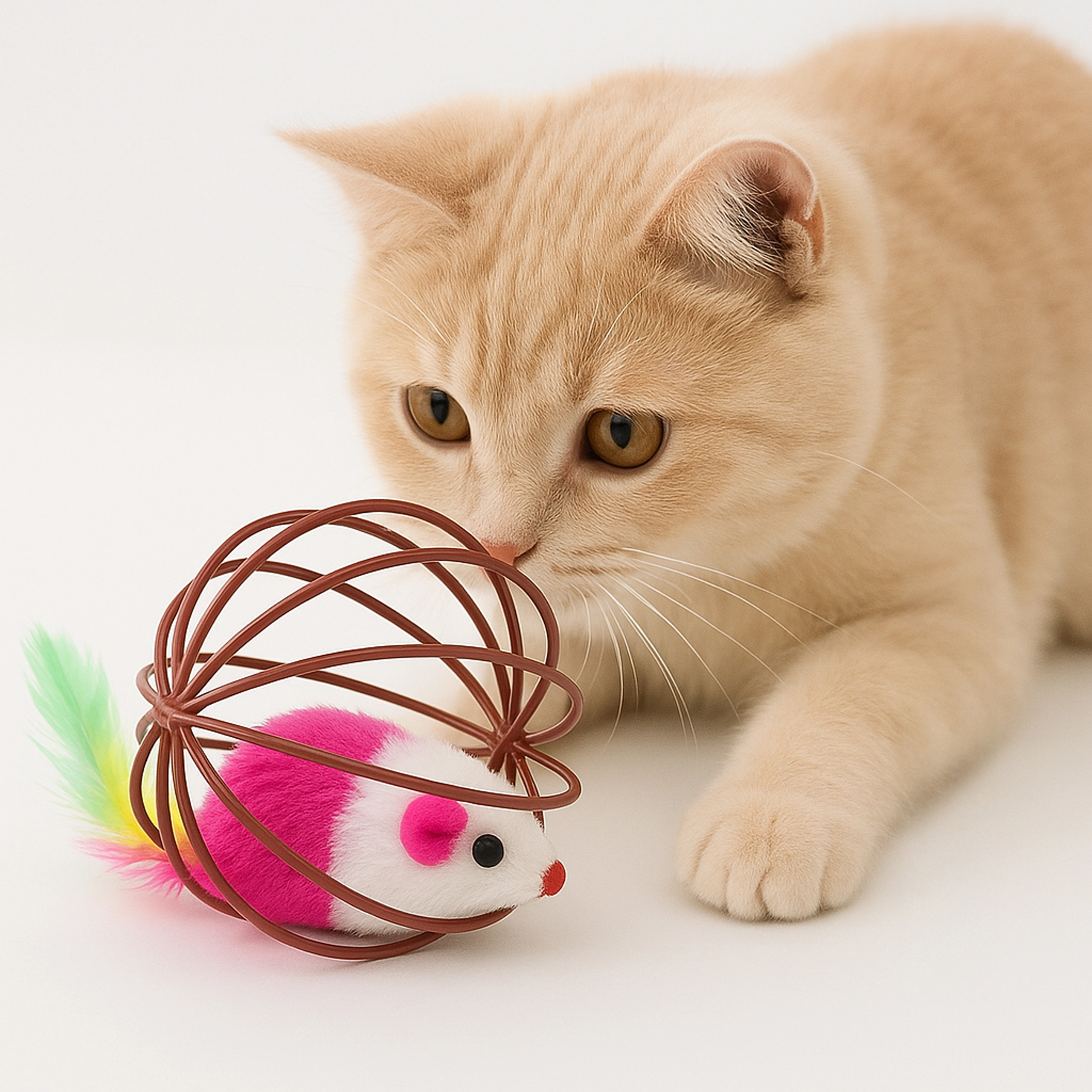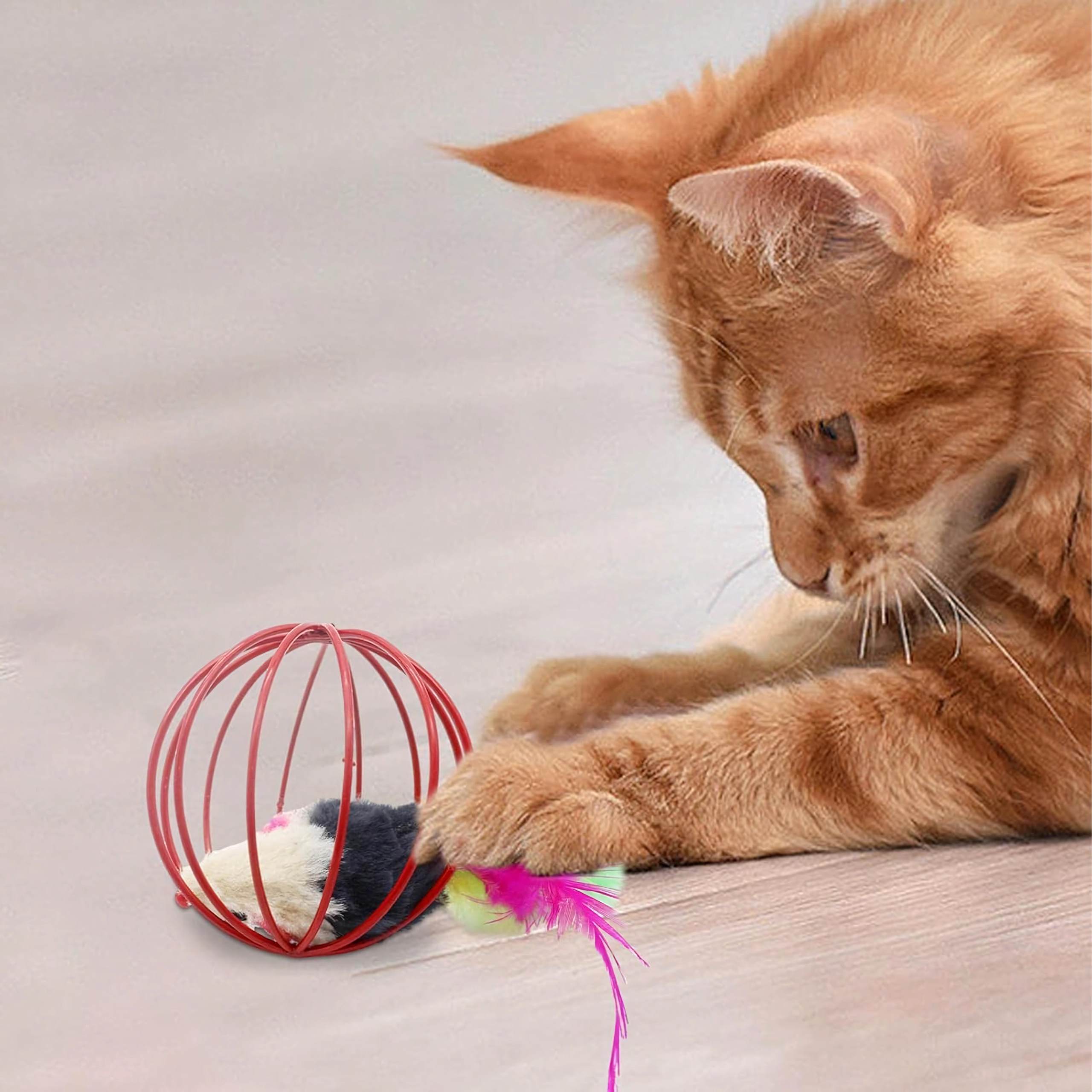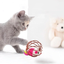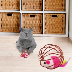 Este ingenioso juguete combina una bola de alambre ligera, que rueda suavemente por el suelo, con un ratón de peluche en su interior. Al moverse, el ratón tintinea suavemente y las plumas de colores invitan aún más al gato a perseguir, golpear y cazar. Ideal para gatitos y gatos adultos que necesitan gastar energía y reforzar su comportamiento natural.