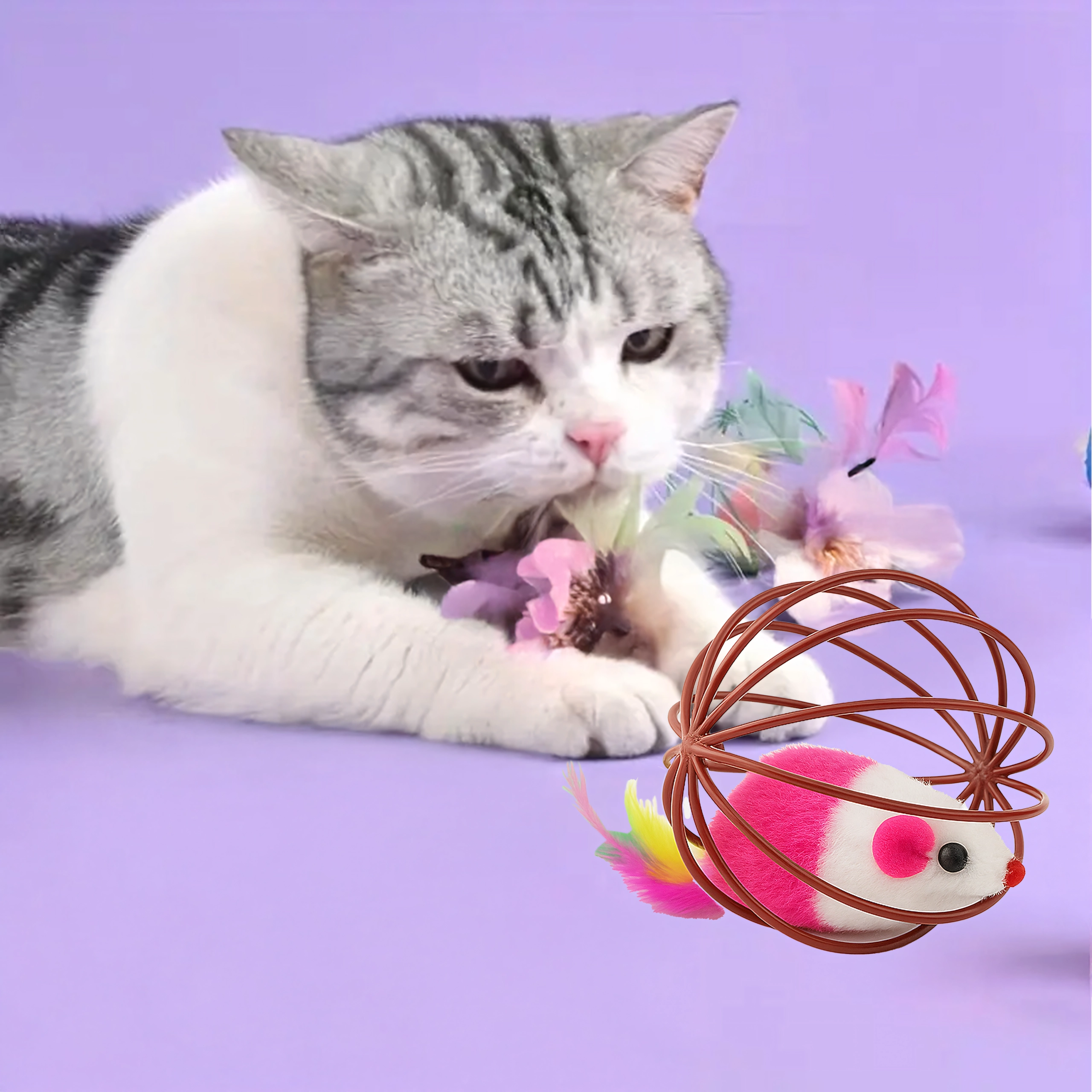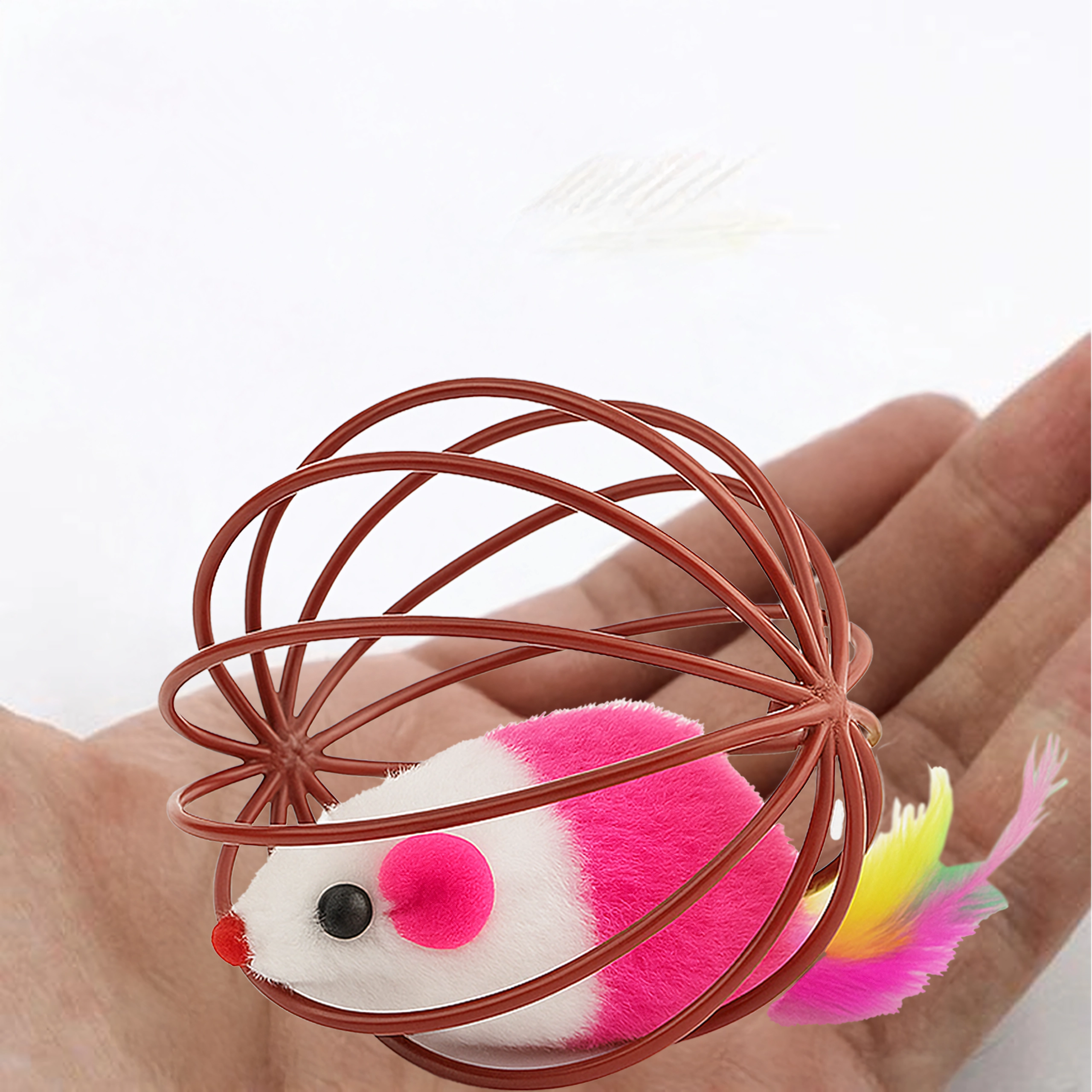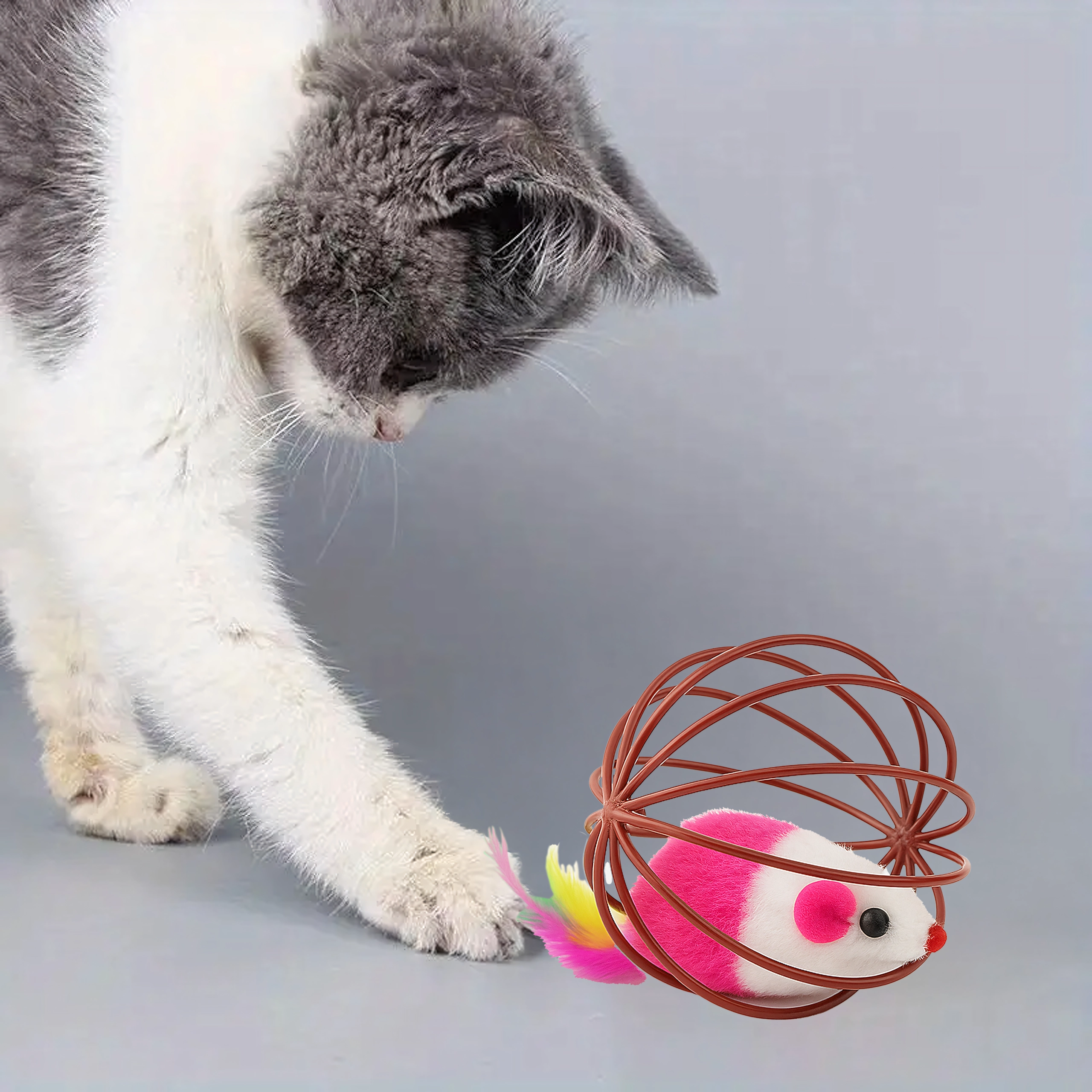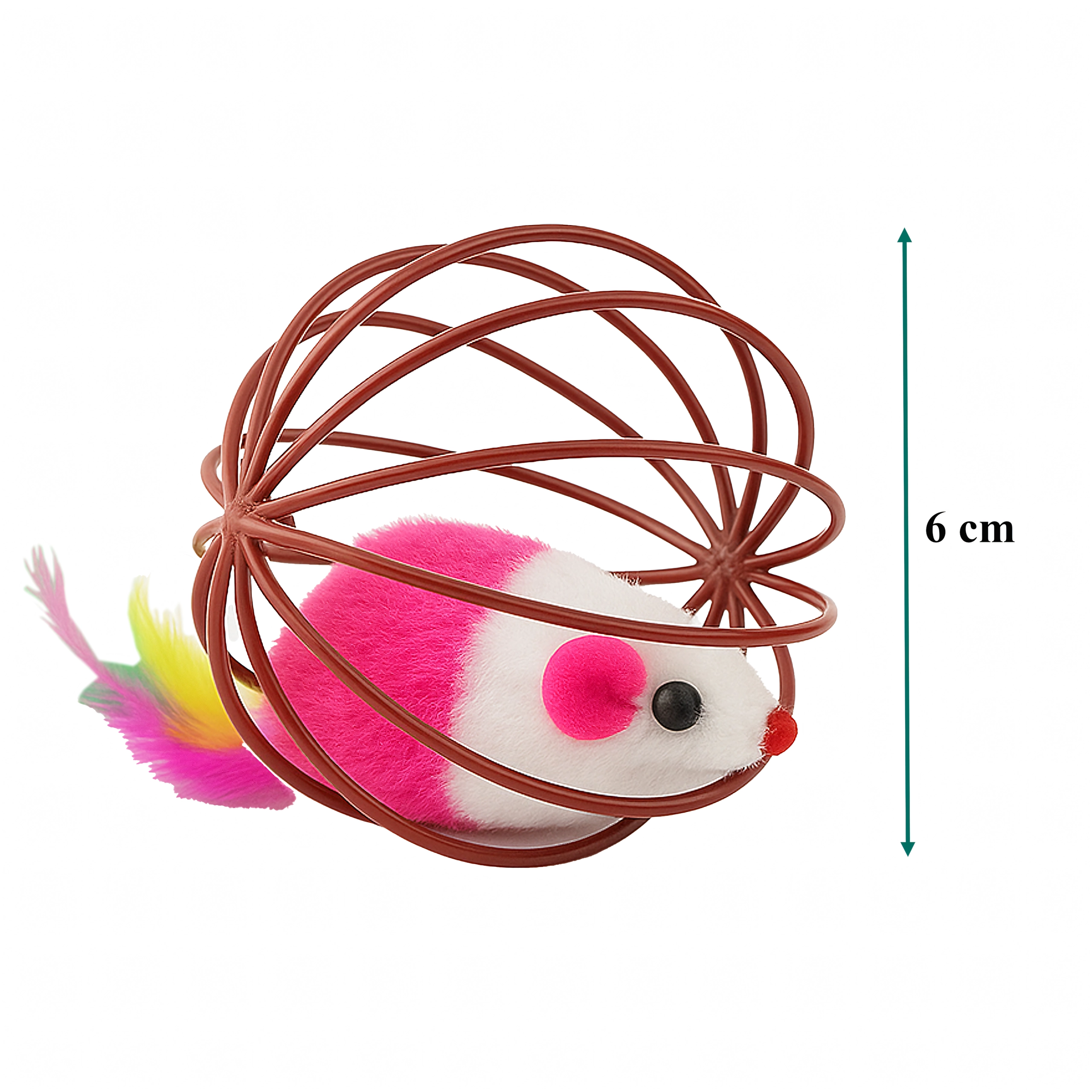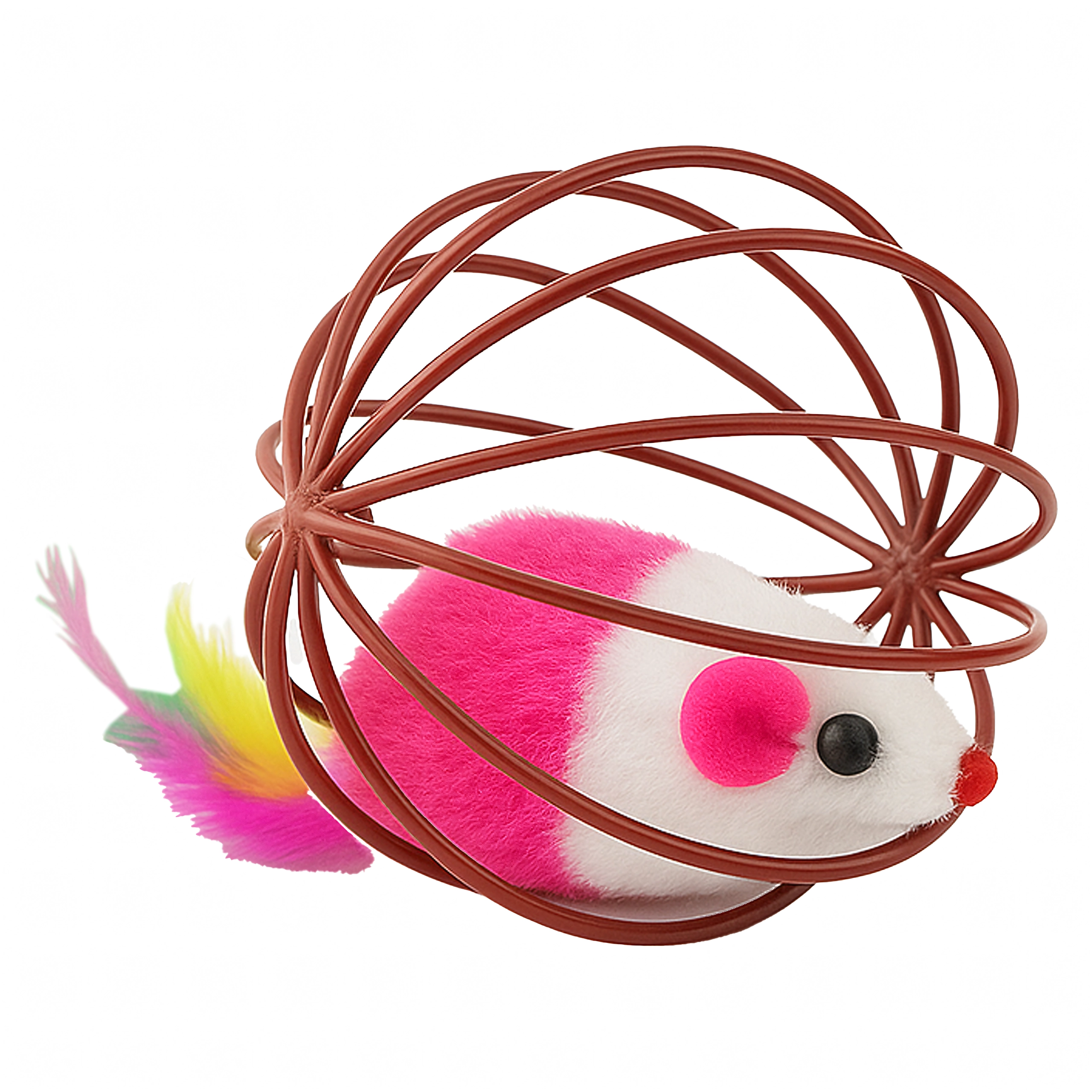 Gracias a su resistente estructura de alambre, el juguete rueda con facilidad, pero el ratón permanece seguro en el interior. La estructura abierta permite al gato agarrar y empujar bien el juguete, mientras que el suave peluche y las plumas ofrecen texturas atractivas. Una gran opción para el juego autónomo o interactivo con su dueño.